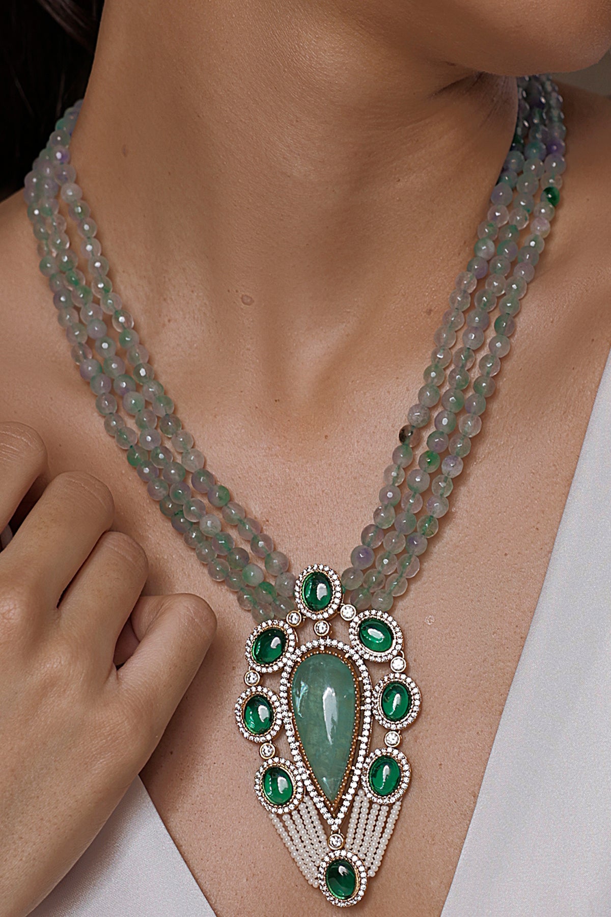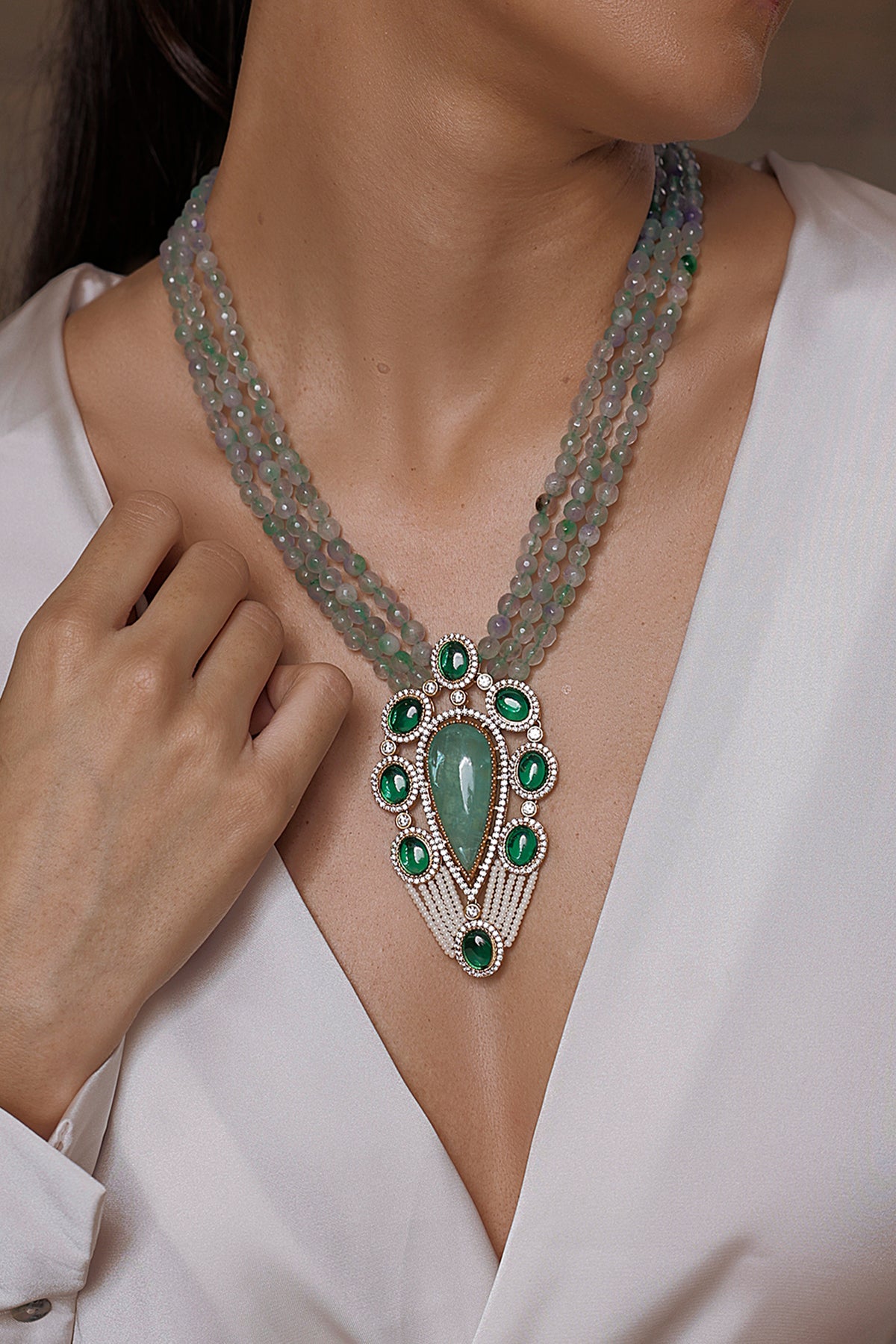 This necklace creates a striking v-shape when worn, adorned with vibrant green polki stones and colorful accents. The design merges dynamic form with traditional beauty, perfect for making a statement.