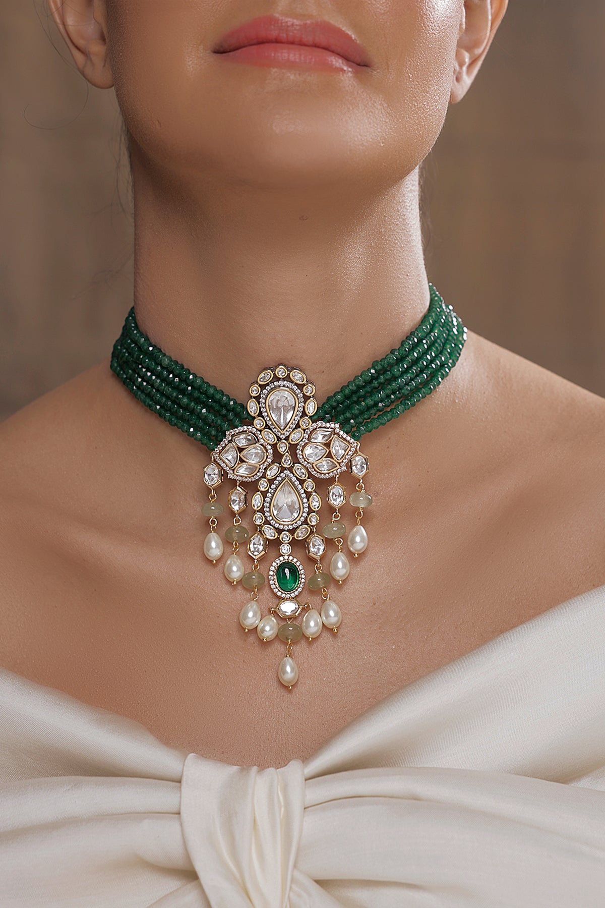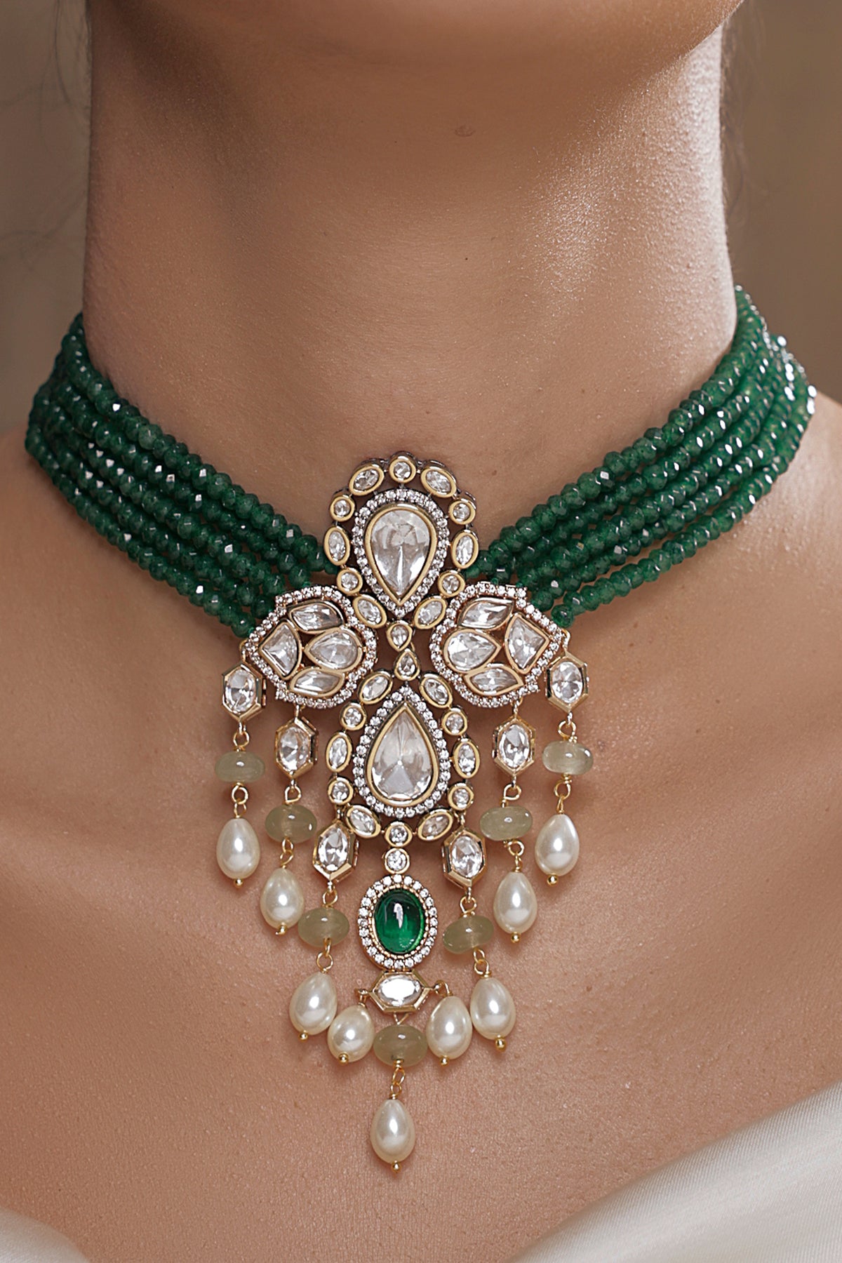 Exquisite dark green beaded choker necklace features a stunning polki pearl statement pendant that captures the essence of sophistication. The rich hues of green beautifully complement the lustrous pearls, creating a captivating focal point that enhances any ensemble. Perfect for special occasions or festive celebrations, this necklace embodies luxury and charm, making it a must-have accessory for any stylish woman.