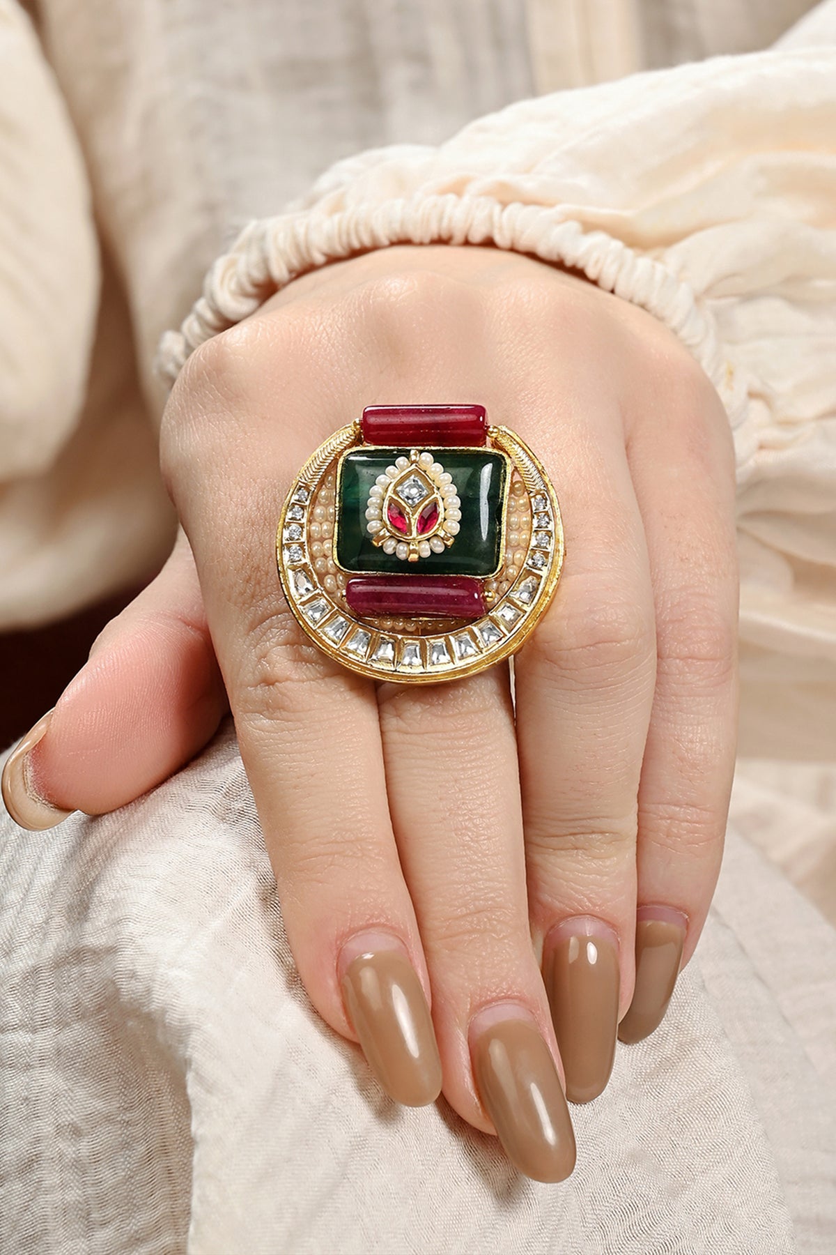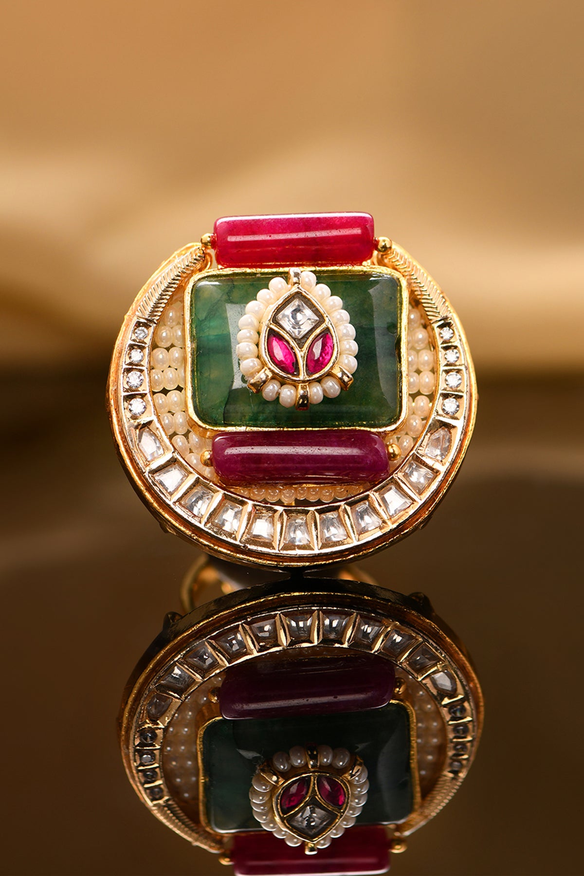 Dive into a world of exquisite beauty with our captivating 22kt gold plated ring adorned with kundan polkis, pearls, hydro rubies, and jades. It's a celebration of individual style, weaving together the richness of tradition and the allure of modernity. Elevate your elegance with a touch of luxury that transcends time and trends.