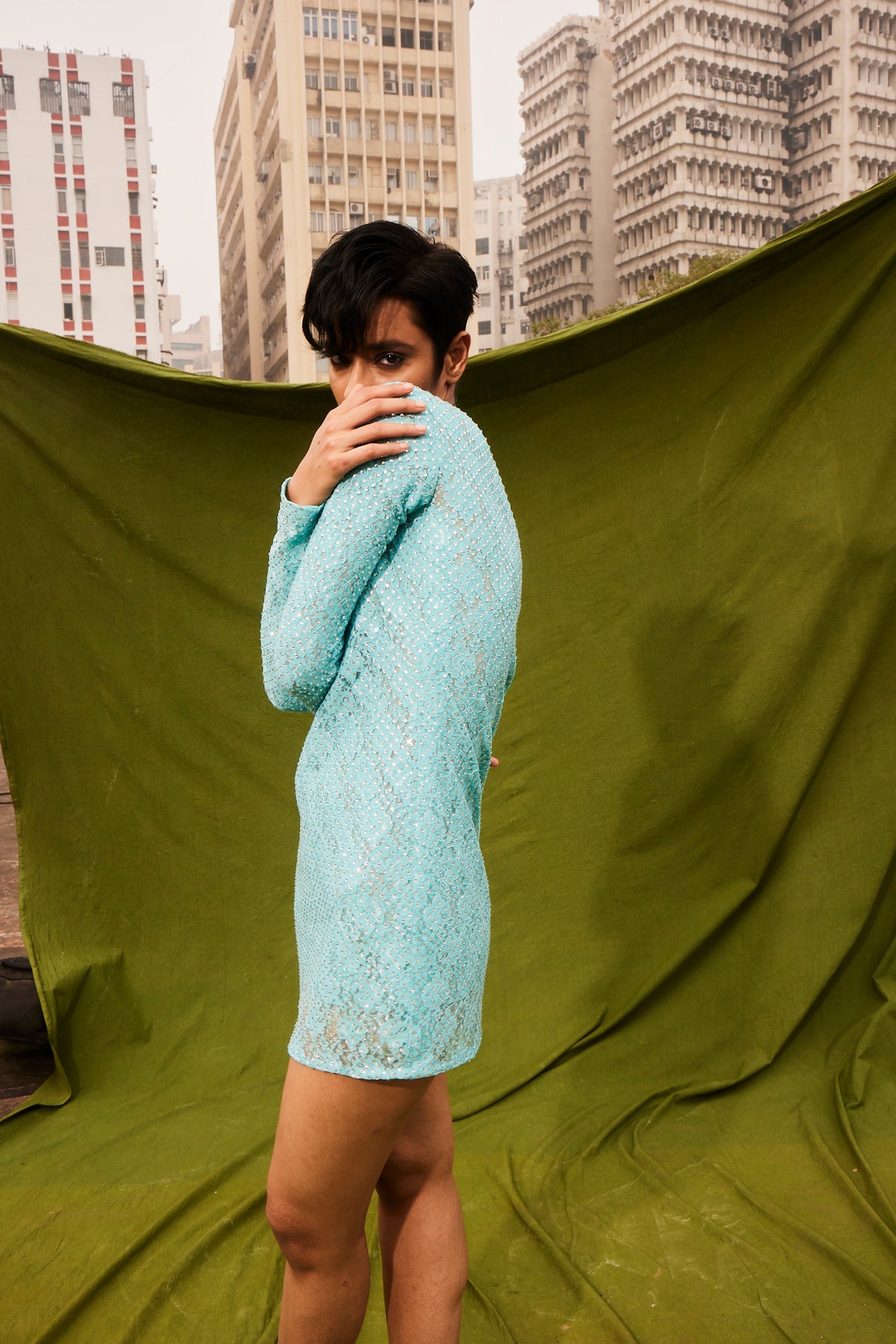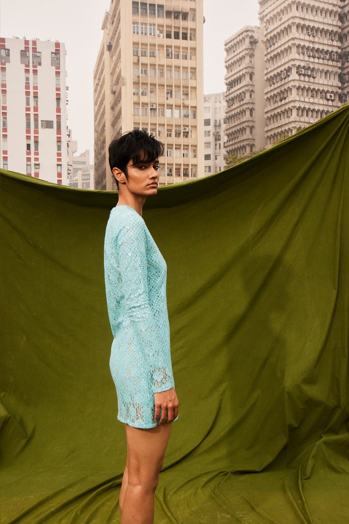 Carefully crafted with lace and accentuated with subtle flat sequins, this full-sleeved mini dress will make you feel brighter than a clear blue sky..