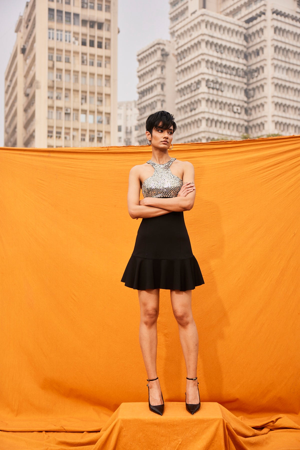 Handcrafted and hand embellished in jersey fabric, this playful dress is modern rendition of the classic lbd. The subtle flair at the hem and the racer neckline enhance the look.