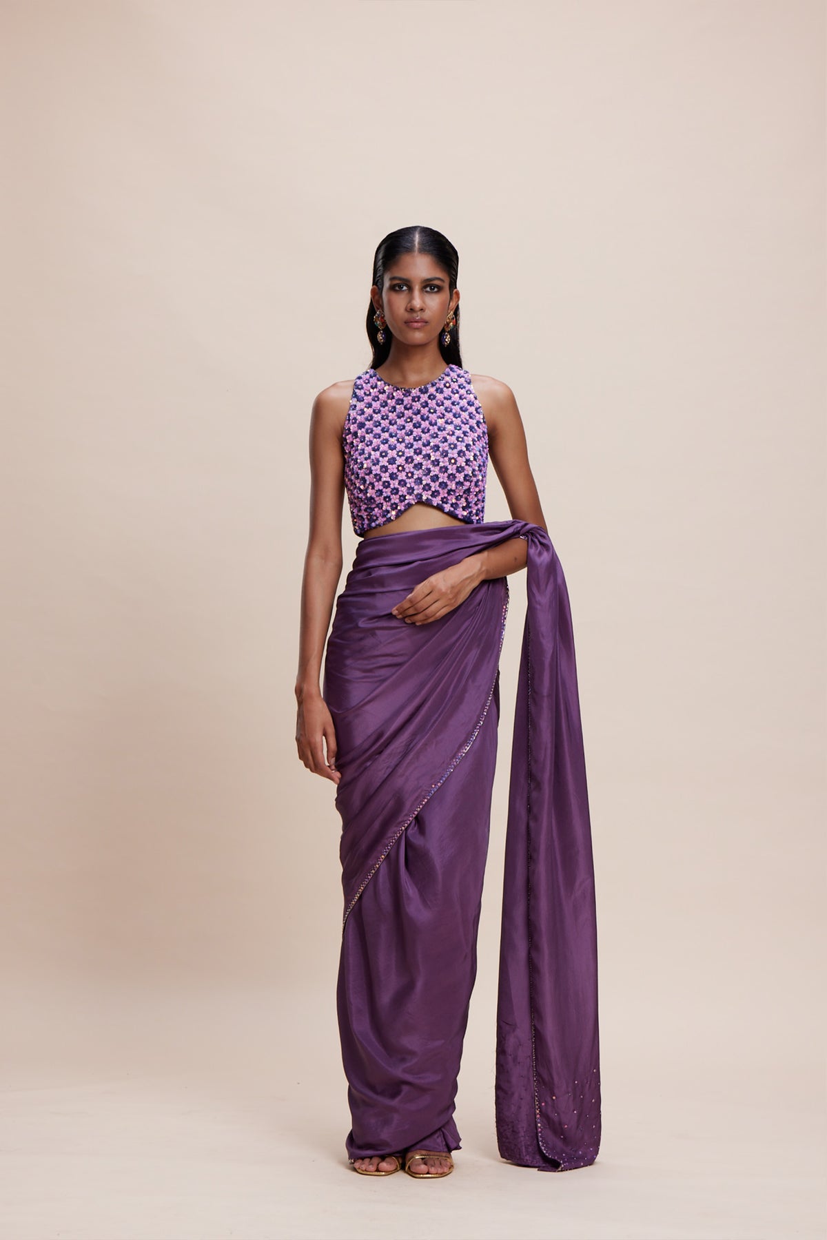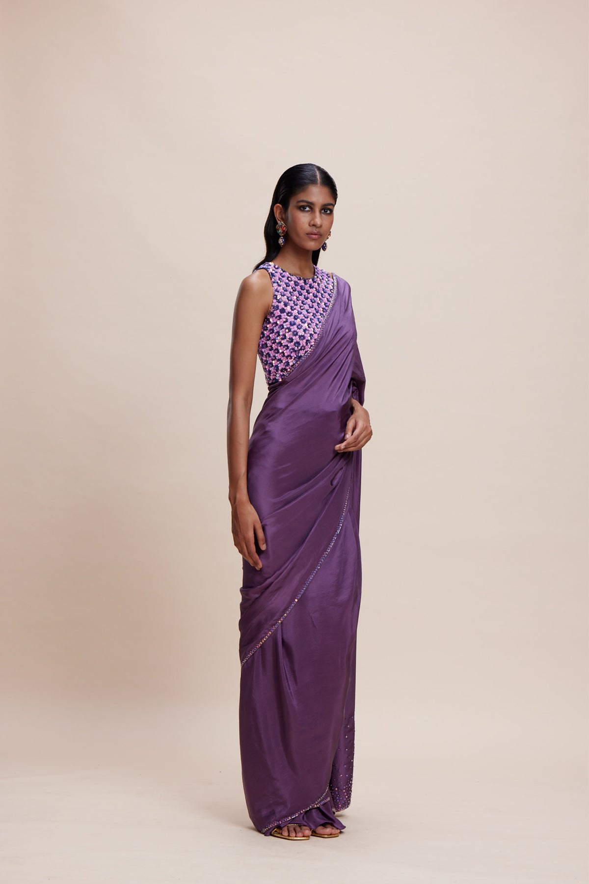 Unveil your inner grace with our lavender silk saree, complemented by a sleeveless blouse with intricate embroidery and dazzling embellishments. This exquisite piece redefines elegance, ensuring it's a standout choice that’s hard to resist.