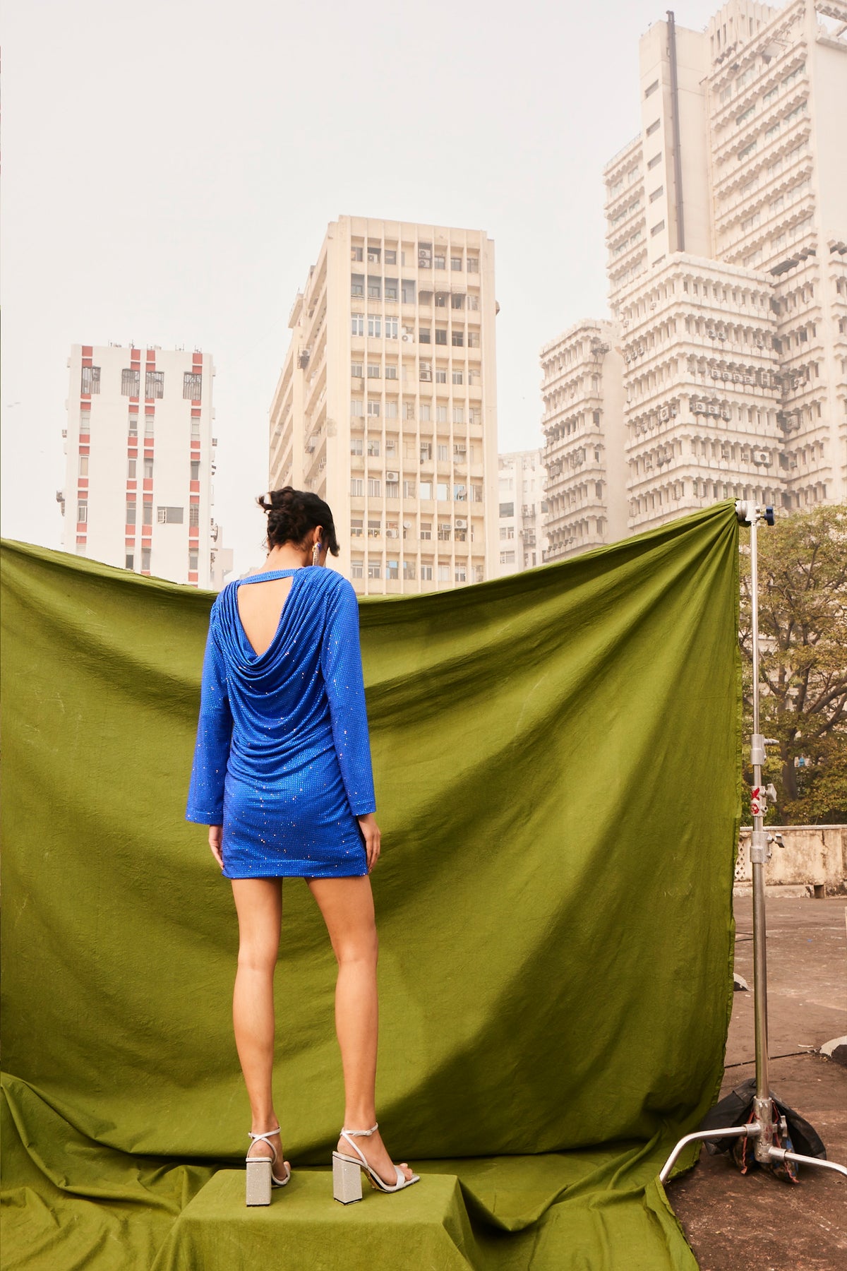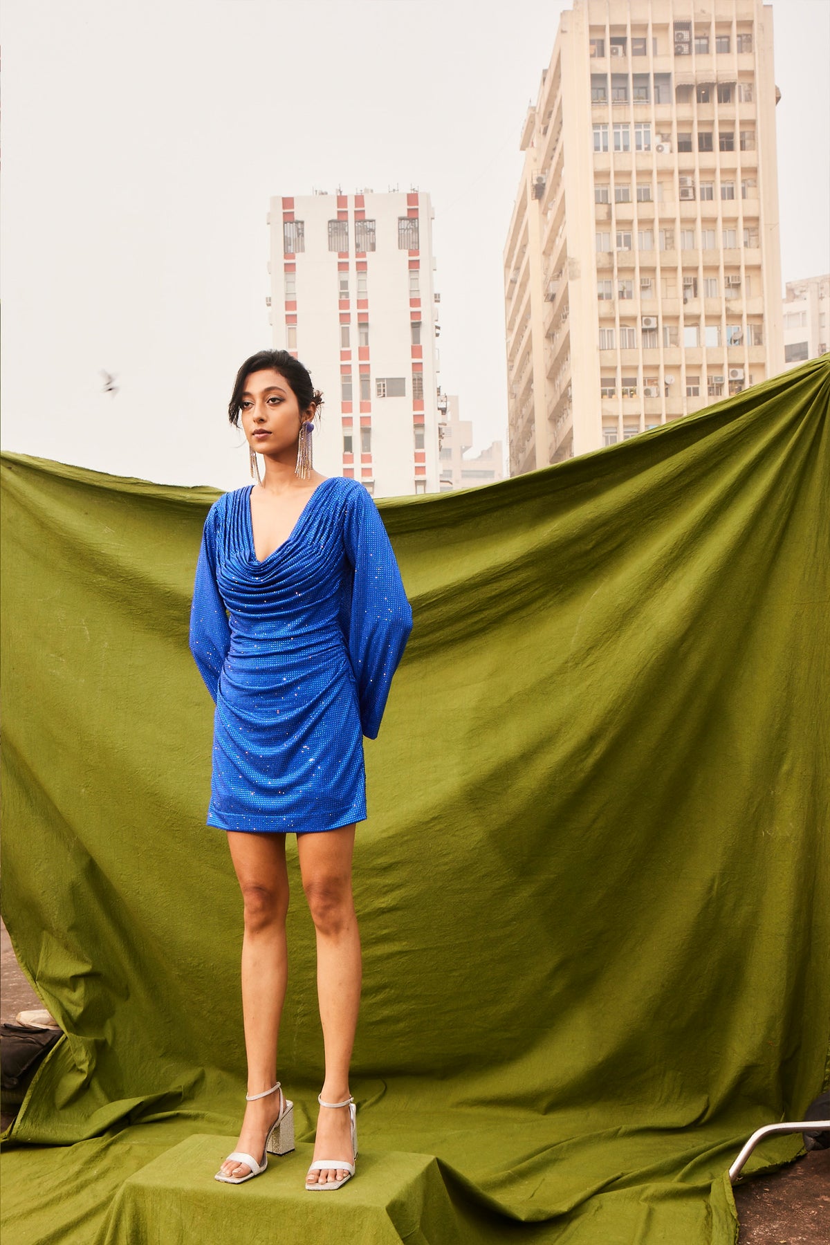 Designed with a rich blue jersey fabric covered in shimmering crystals. The crystals/embellishments, all handcrafted onto the dress, one at a time. The draped neckline adds an extra layer of charm.