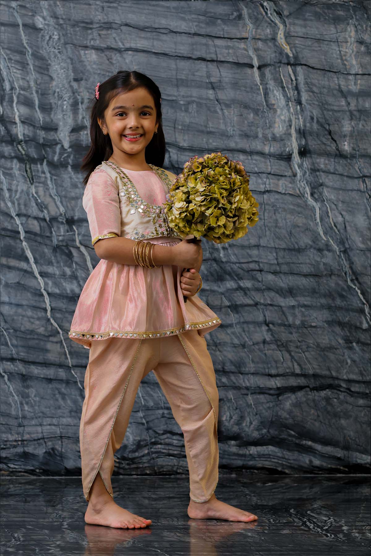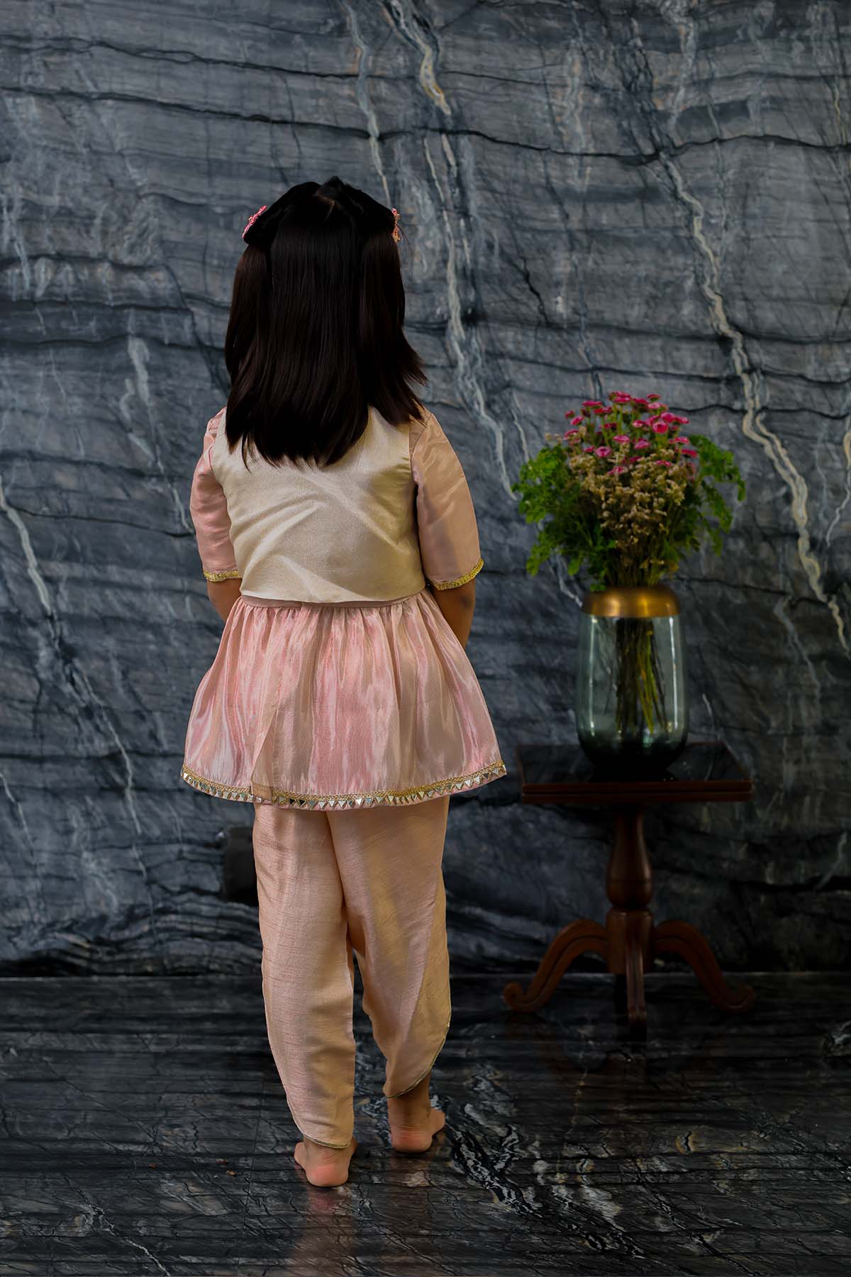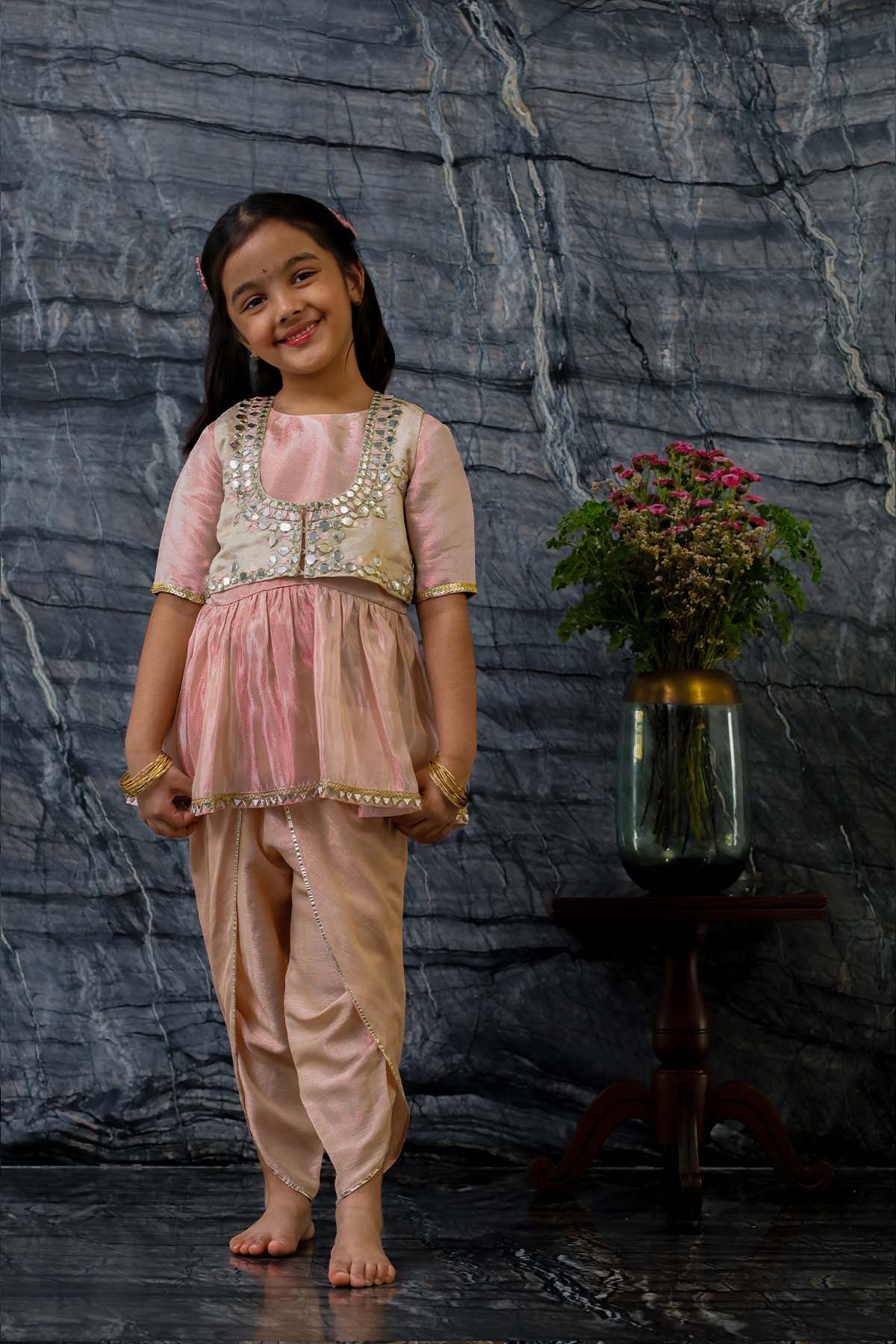 We always strive to produce unique, lovingly handcrafted and practical apparel. And we use only the finest handwoven textiles and gots certified organic cotton. Our traditional pure tissue and silk jacket is embroidered with mirror work, silk thread work and sequins. It is beautifully accentuated with the hipe length peplum top and dhoti pants. The outfit is demure and feather weight. Most importantly, there is "No chubhi chubhi". The entire ensemble is buttery soft and perfect for children's delicate skin. Made of pure tissue lined with ahimsa silk.