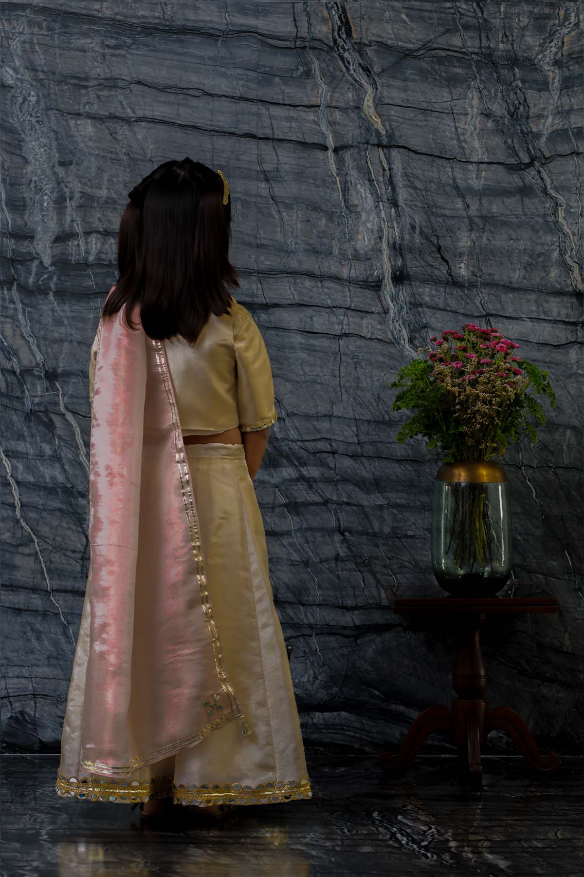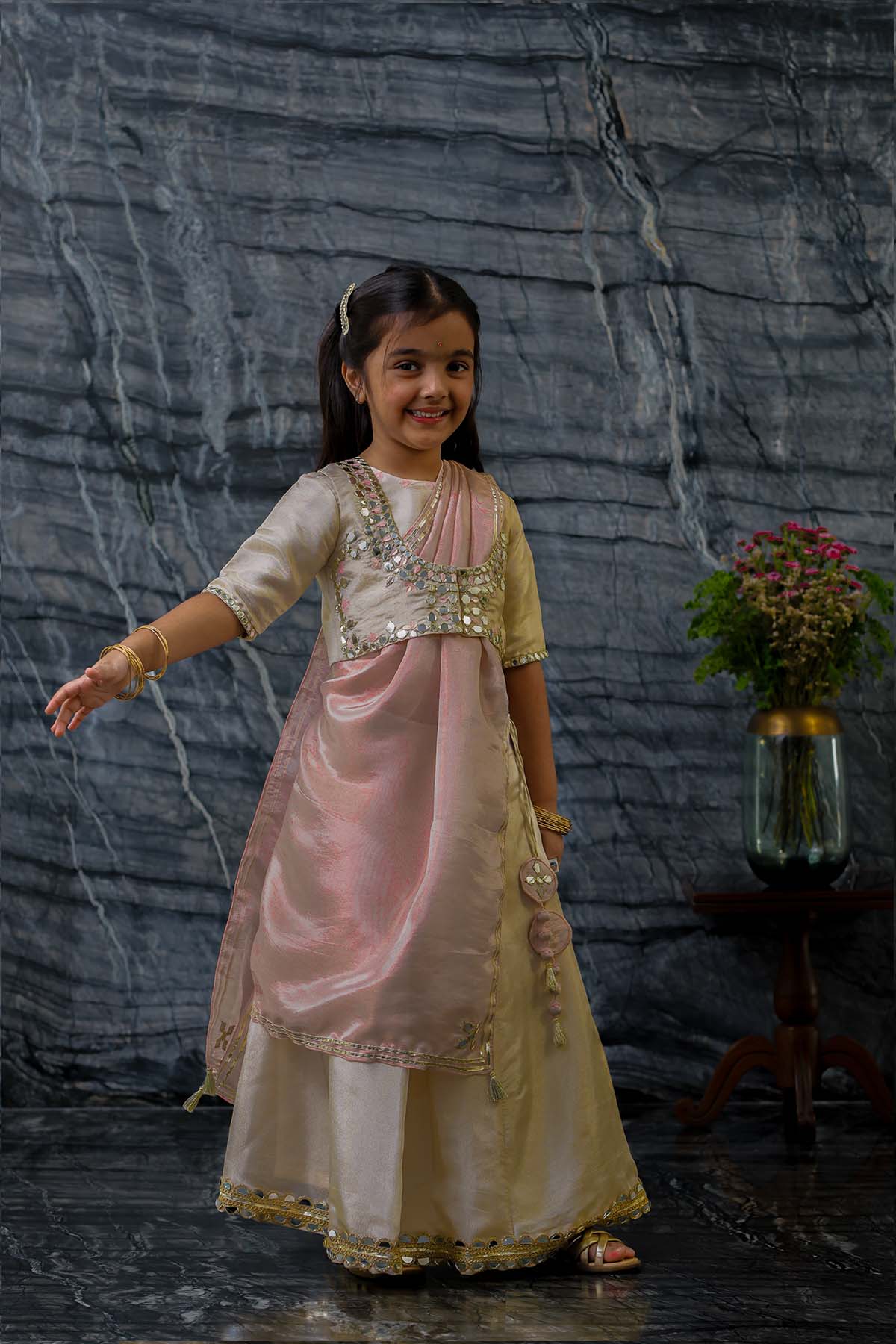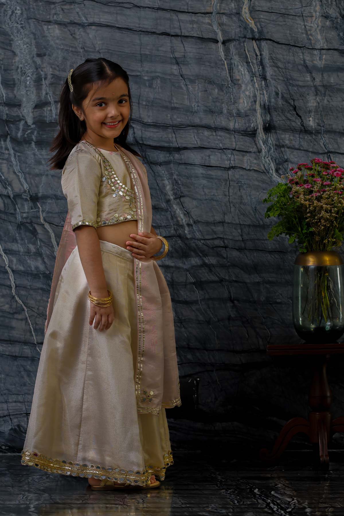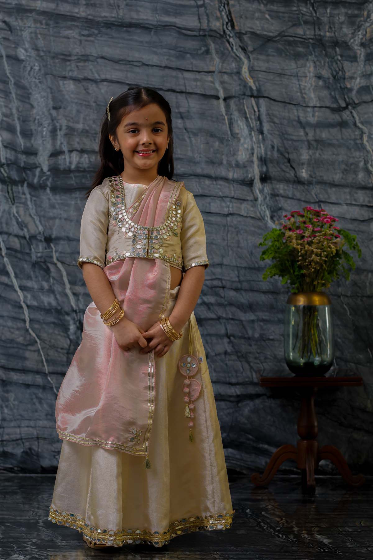 We always strive to produce unique, lovingly handcrafted and practical apparel. And we use only the finest handwoven textiles and gots certified organic cotton. Our traditional pure tissue and silk jacket is embroidered with mirror work, silk thread work and sequins. It is beautifully accentuated with matching blouse and kali lehnga lehnga and contrast embellished tissue dupatta. Most importantly, there is "No chubhi chubhi". The entire ensemble is buttery soft and perfect for children's delicate skin. Made of pure tissue lined with ahimsa silk.