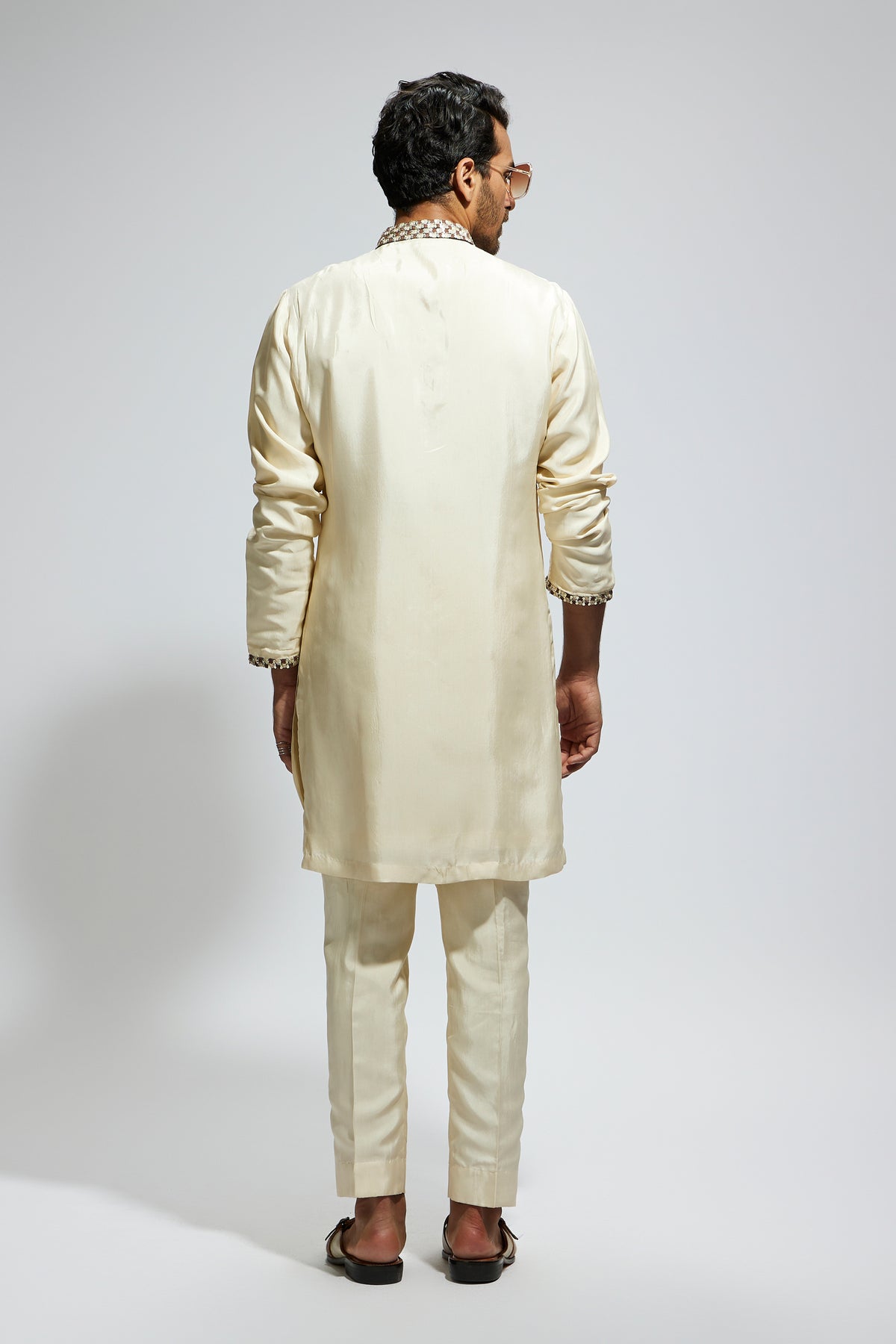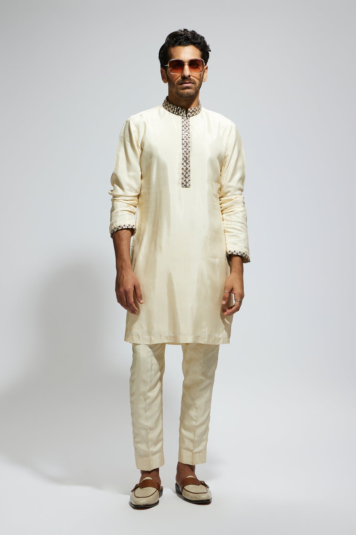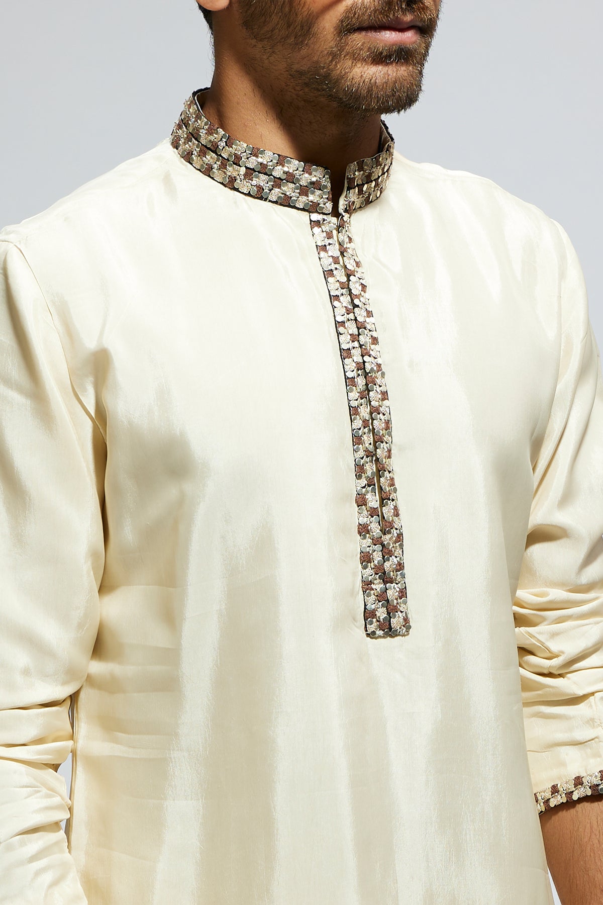 Beige solid kurta with embellished collar and kurta patti