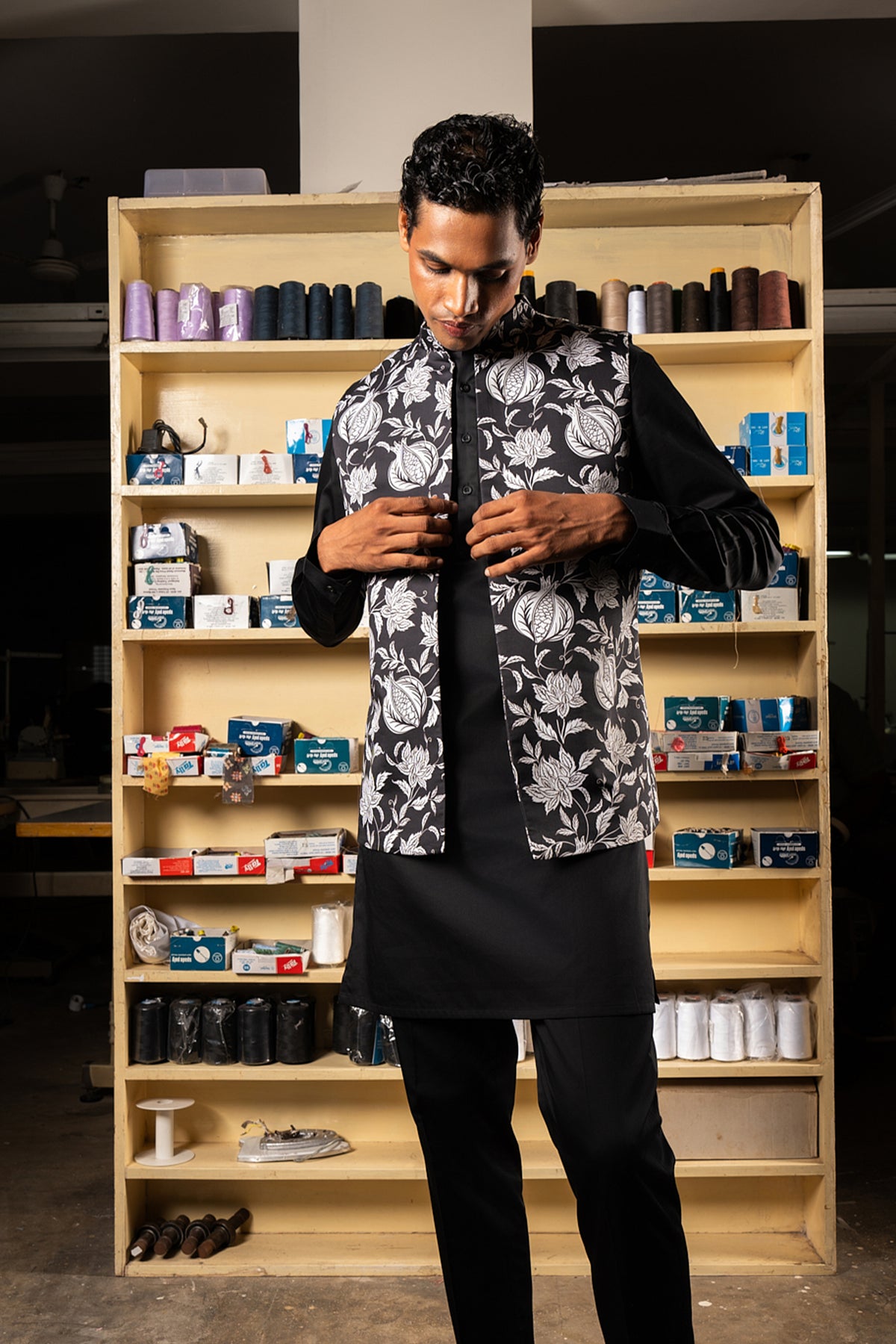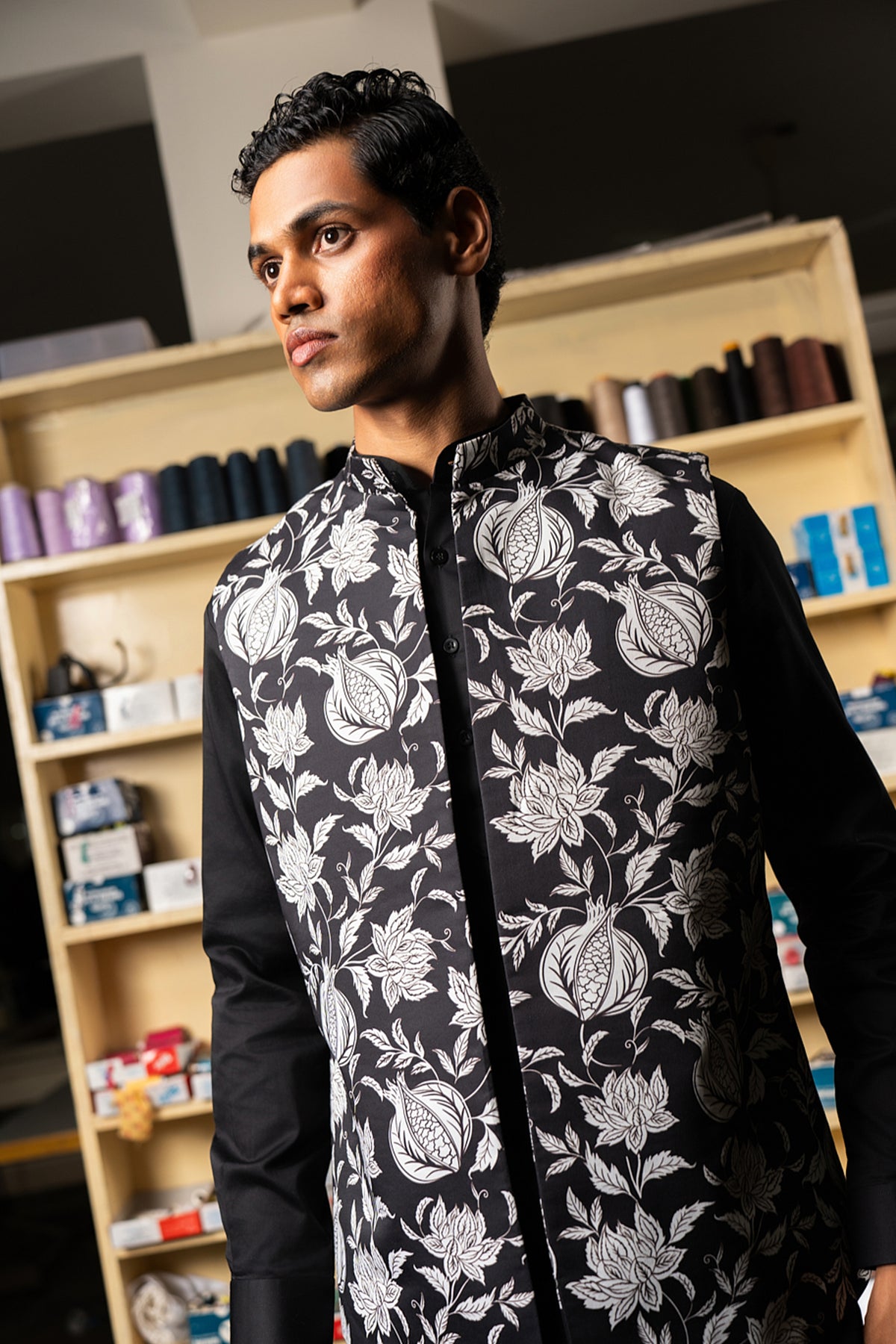 This set combines a printed open-style bandi in premium cotton satin with a matching cotton shirt-style kurta pajama. The bandi features a mandarin collar and buttonless design, showcasing a dual toned anar print. The sleek contemporary cut of the shirt kurta makes it easy to wear and includes cuffed sleeves, and two hip pockets. The trouser style pajama features an elasticated back, zip and fly front closure, and two hip pockets. The pajama is cut to a slim fit and has ankle slits for ease of wear. Ā Wear together for a refined look or separately for versatile styling.