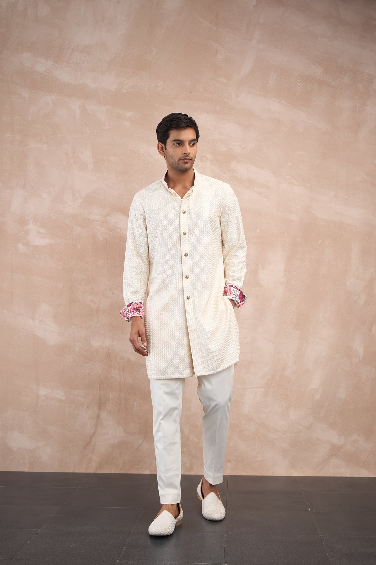The inara front open edge cut kurta with show buttons, paired flawlessly with the cotton satin churi pant featuring printed detailing on the cuff and collar of the kurta. Its a versatile choice for the modern wardrobe. Embrace individuality with this distinctive outfit, tailored to make a lasting impression wherever you go.