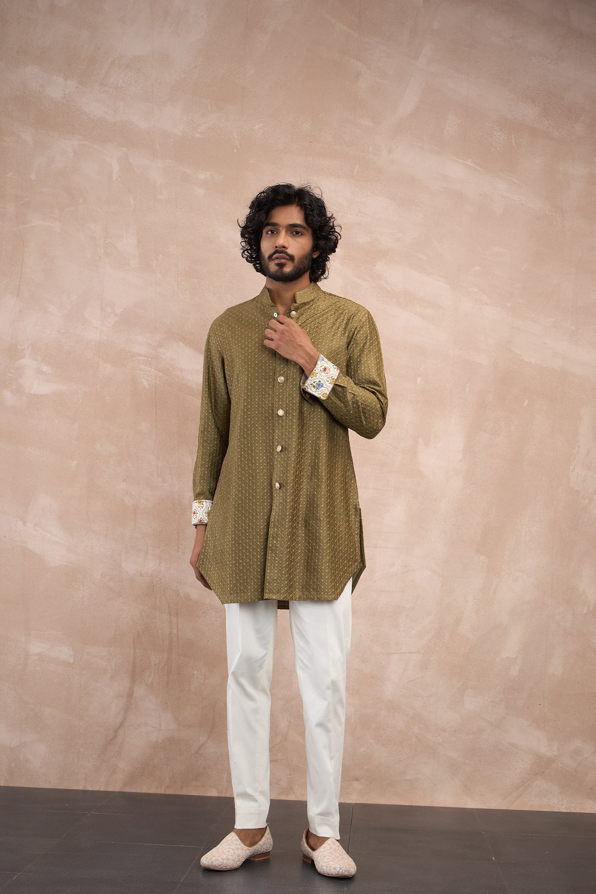 The inara motif kurta boasts a striking motif pattern , exuding timeless charm and intricate detailing. Its front open design enhances comfort and ease. Inara motif kurta with show button with churi pants is a wardrobe essential for the gentleman. Whether worn together as a complete outfit or mixed and matched this elevate your attire with timeless appeal.