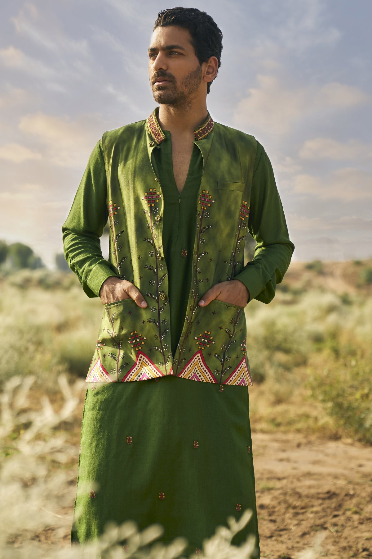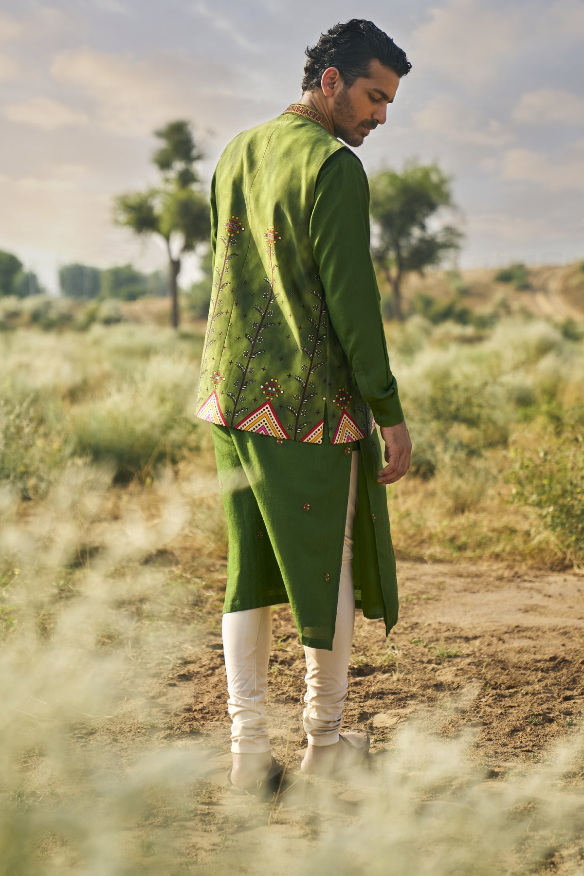 Kacha aam solid kurta with resham embroidered buties all over paired with our forest inspired ranthambhor printed jacket & ivory churidar