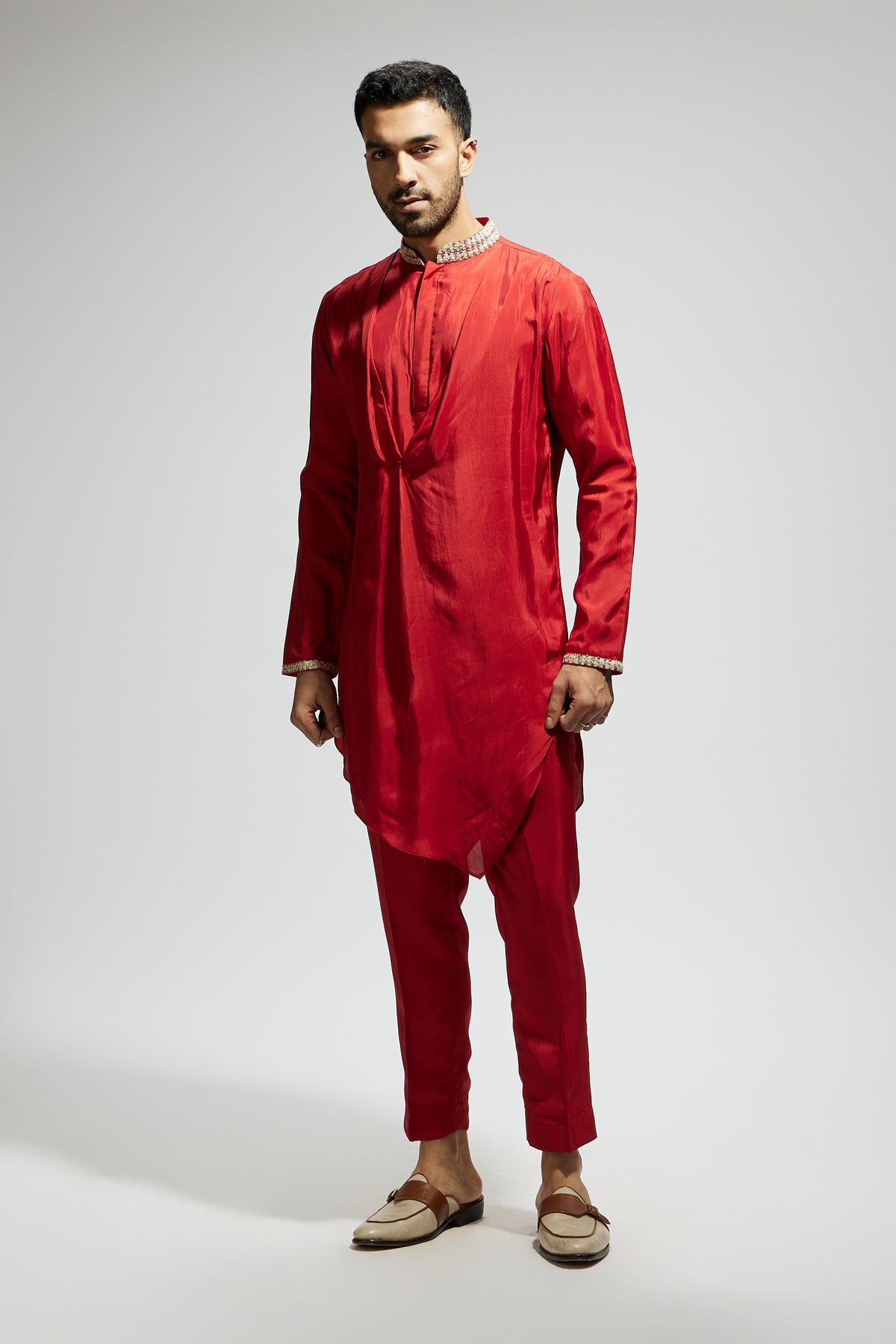 Solid kurta with embellished collar and pants
