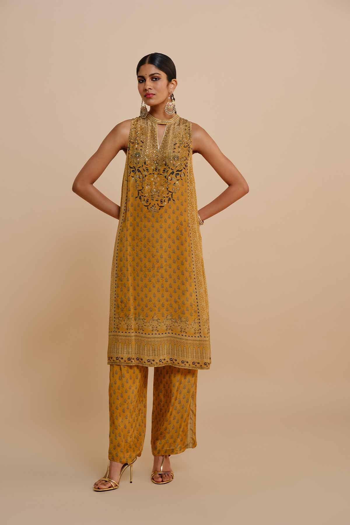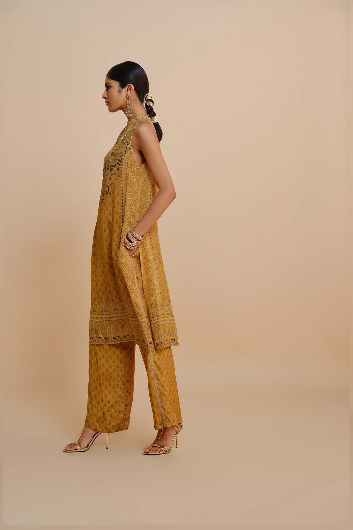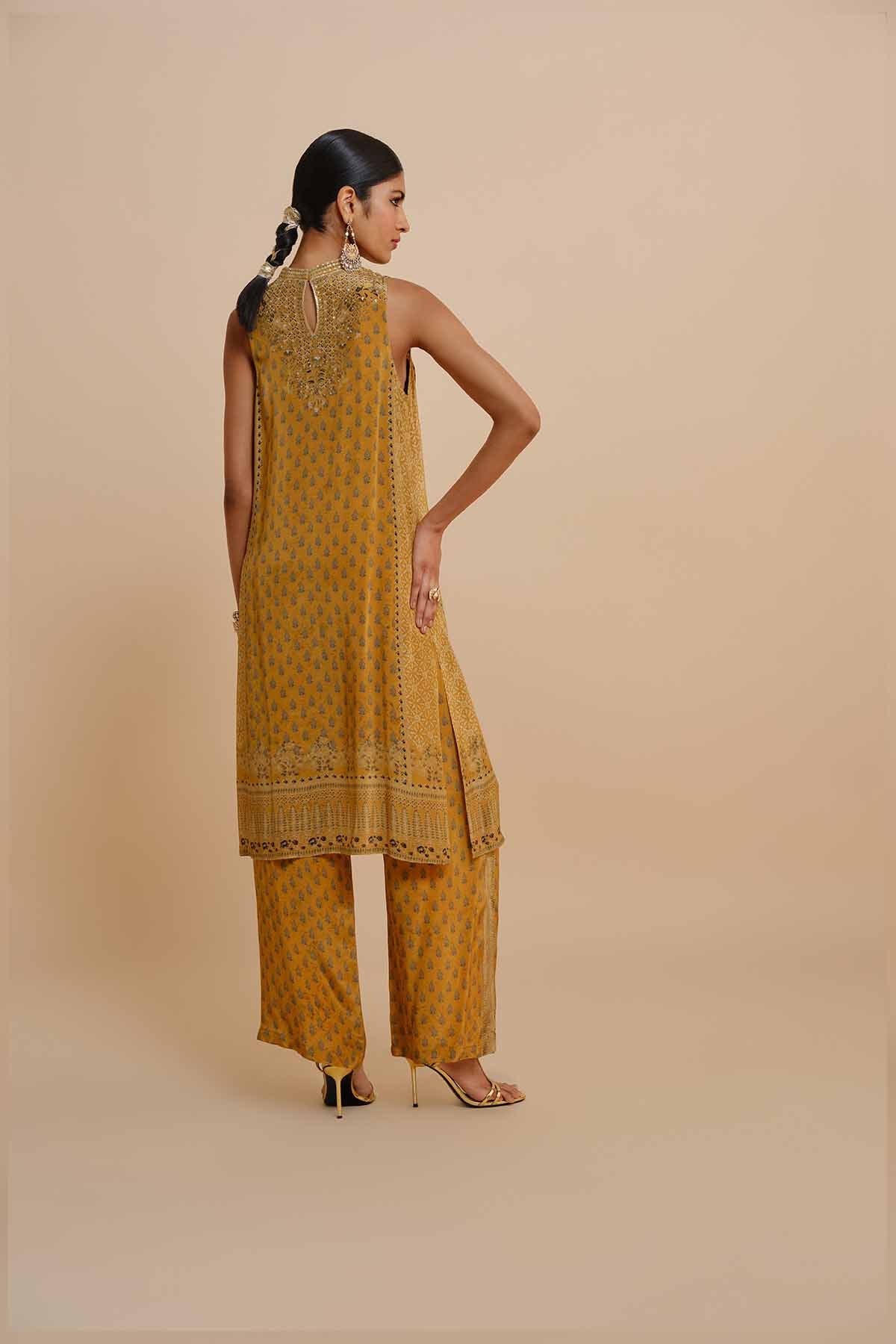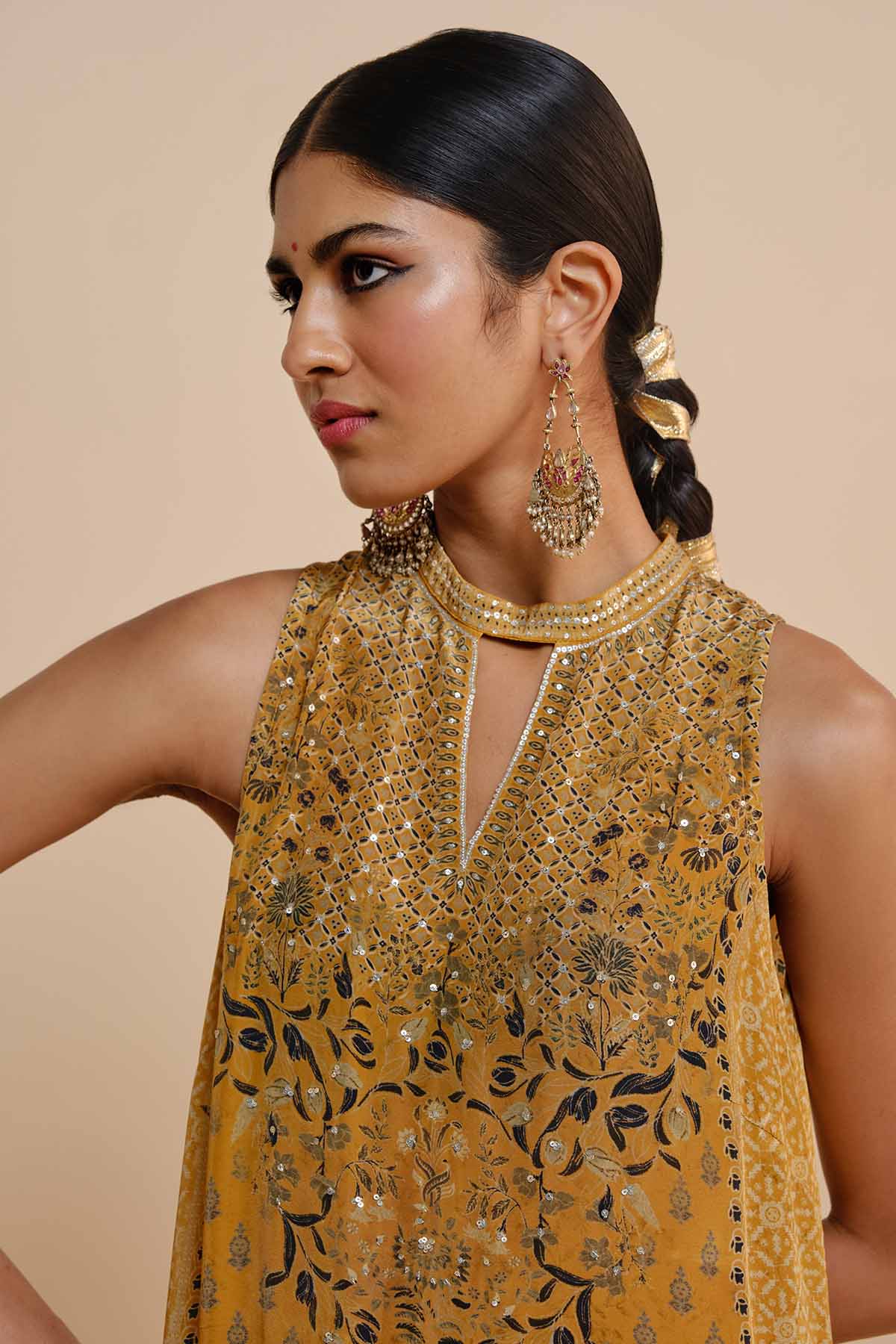 Crafted in a vibrant yellow, this A-line kurta set has been crafted in breezy crepe. It features nature-inspired motifs & is elevated in sequins for the season of celebrations.