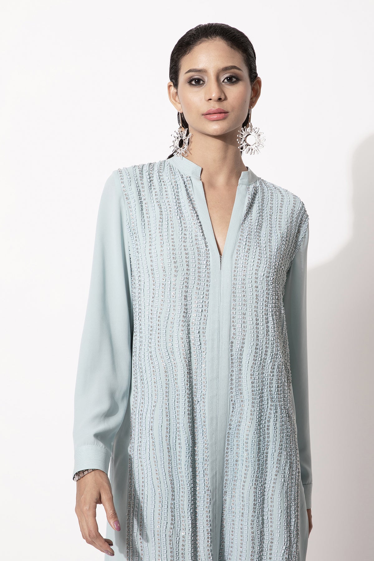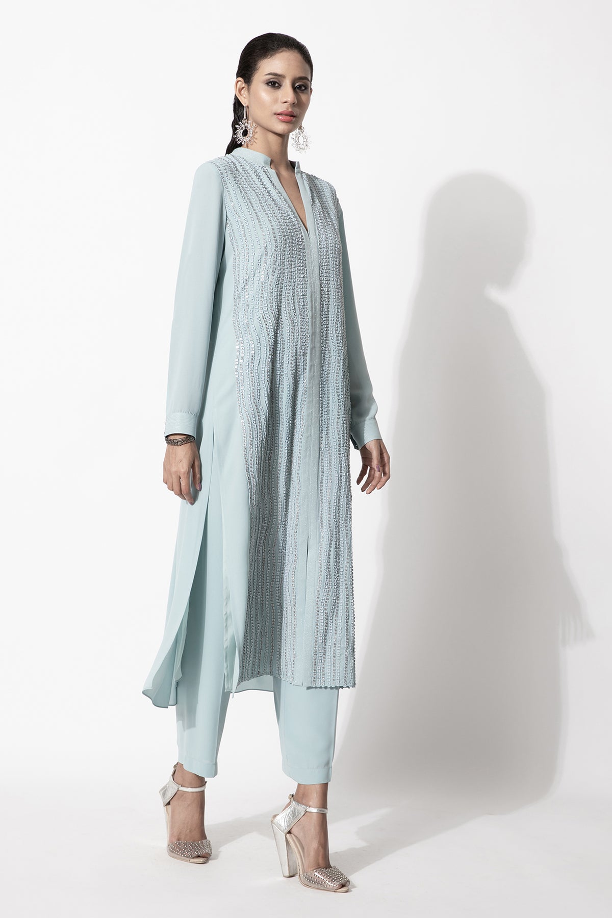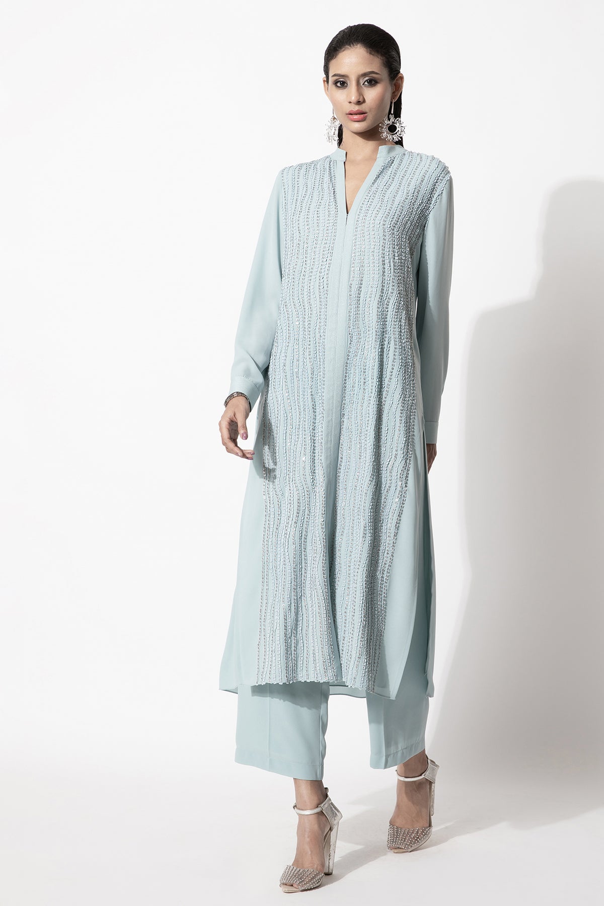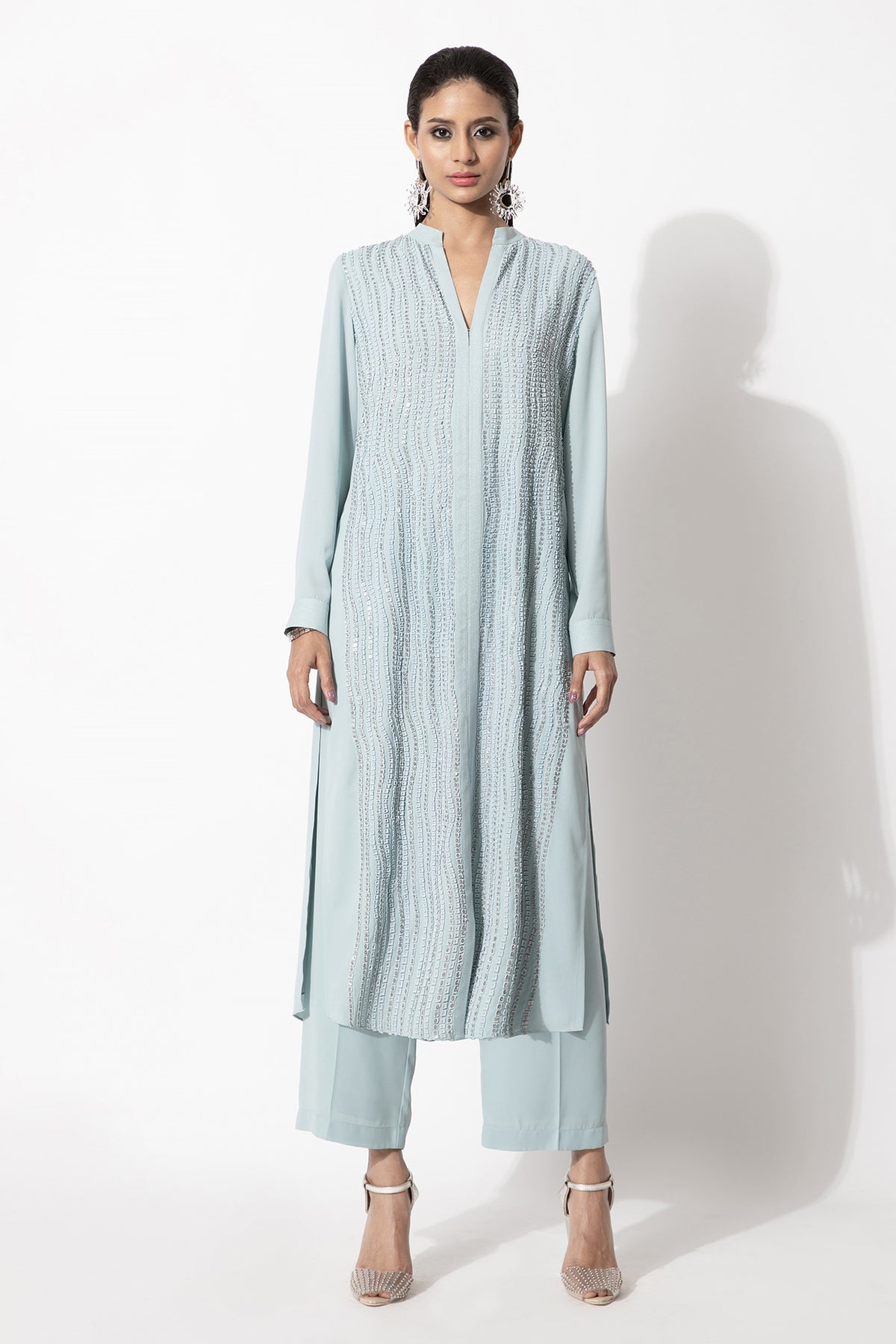 Straight fit kurta with full sleeves featuring a linear applique work in tonal colour paired up with matching trousers.