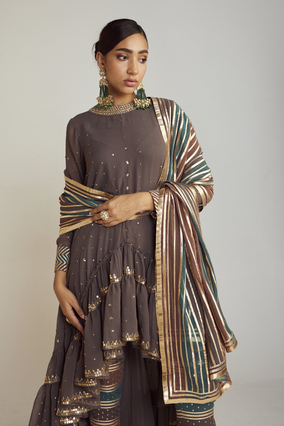 Charcoal grey asymmetrical kurta clubbed with a hand embroidered multi color pant set.