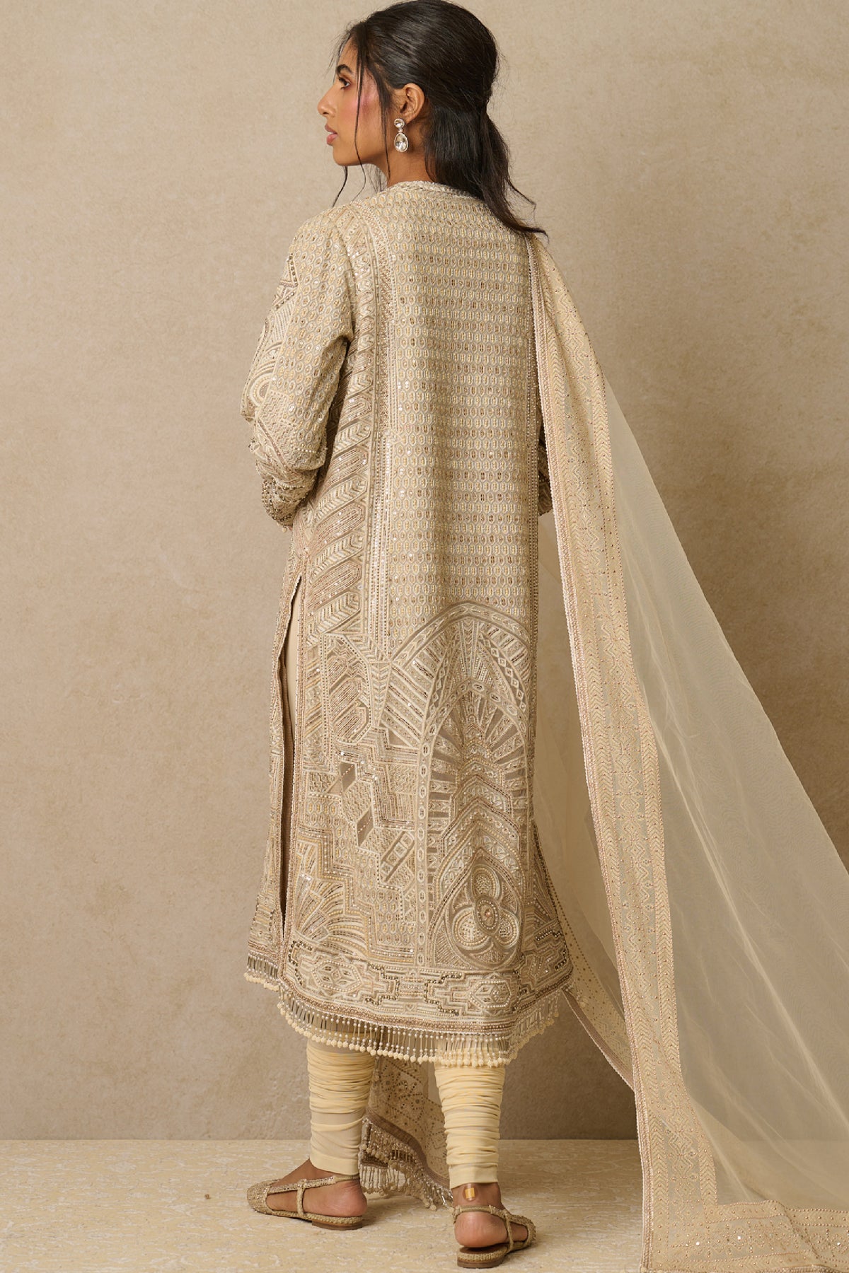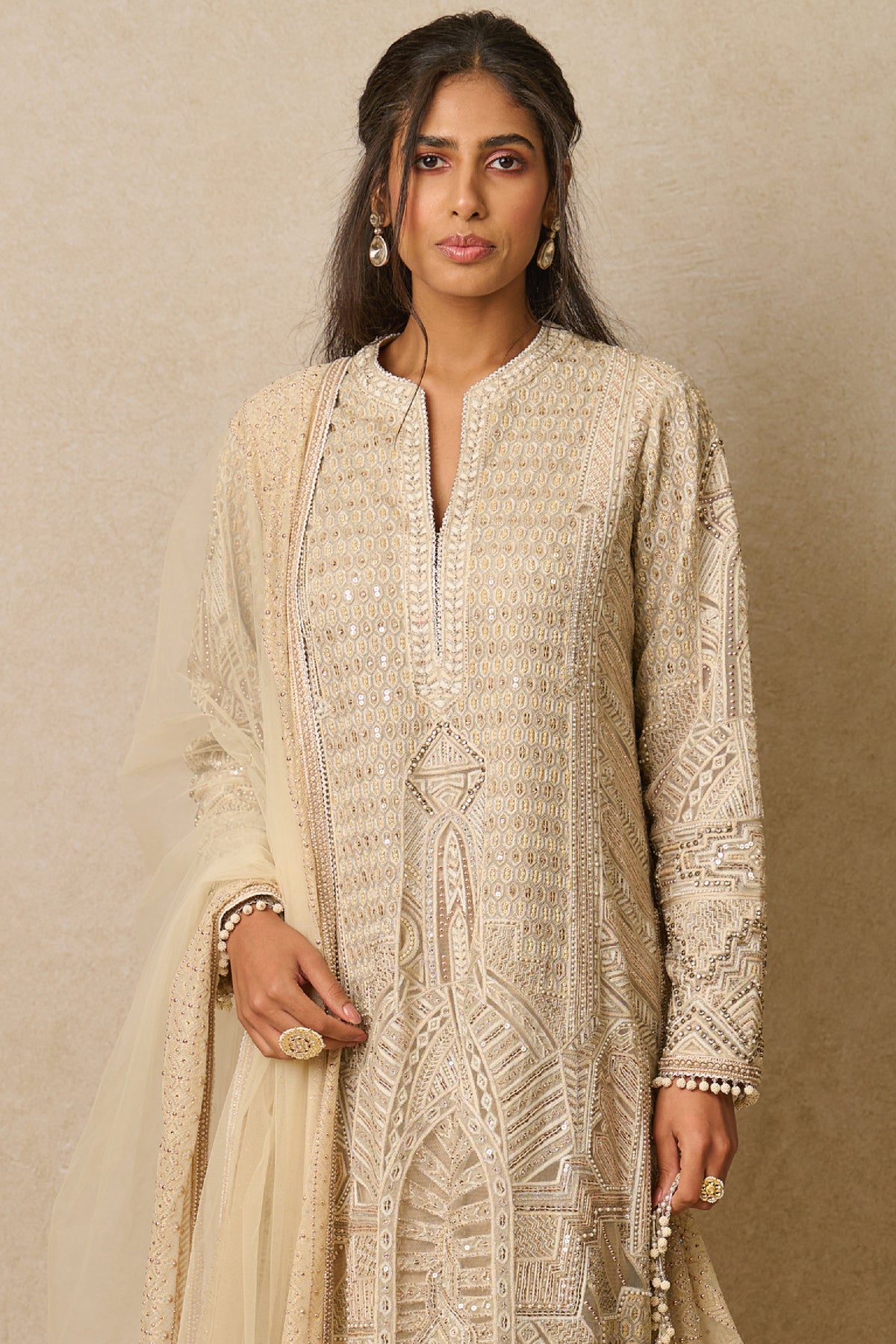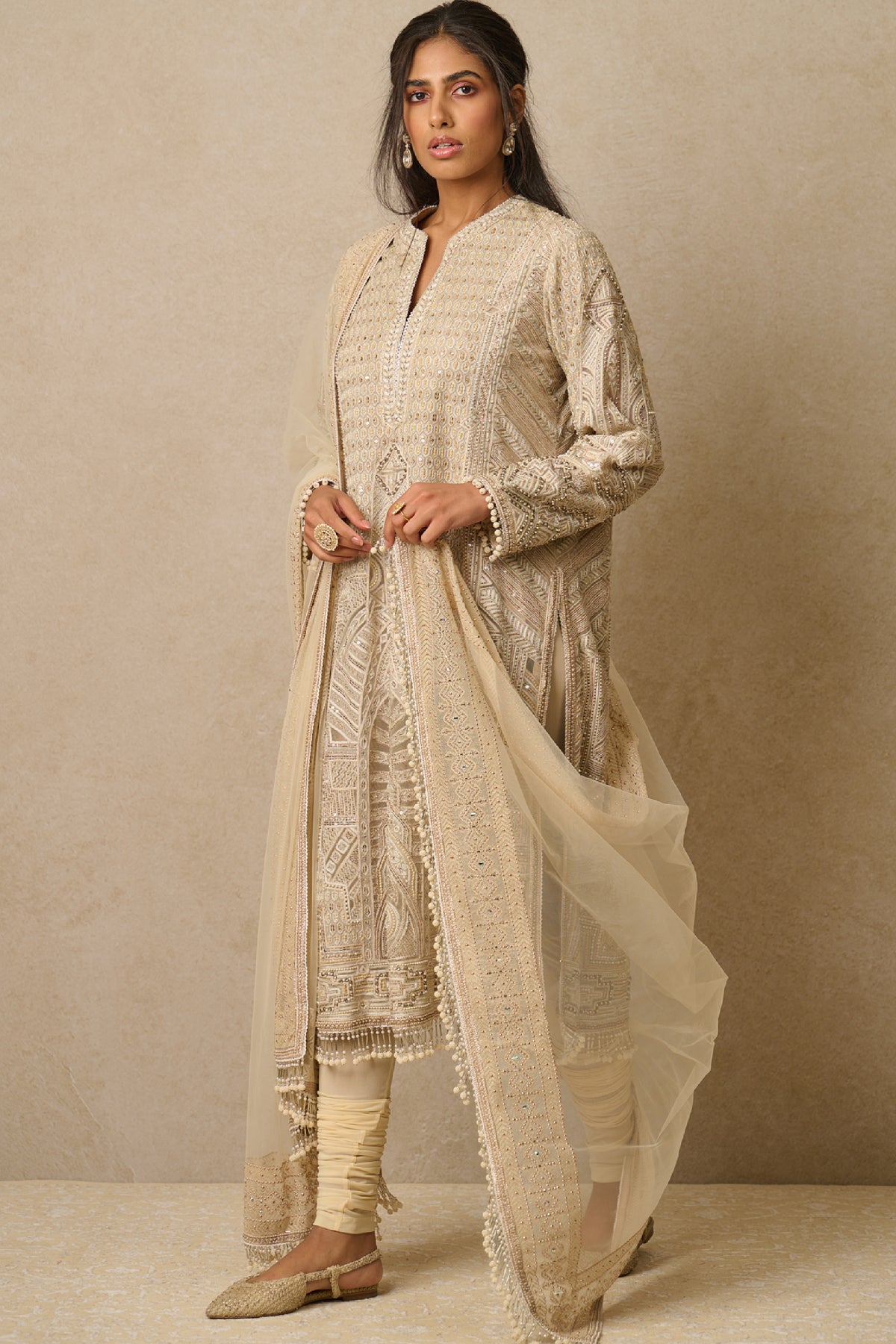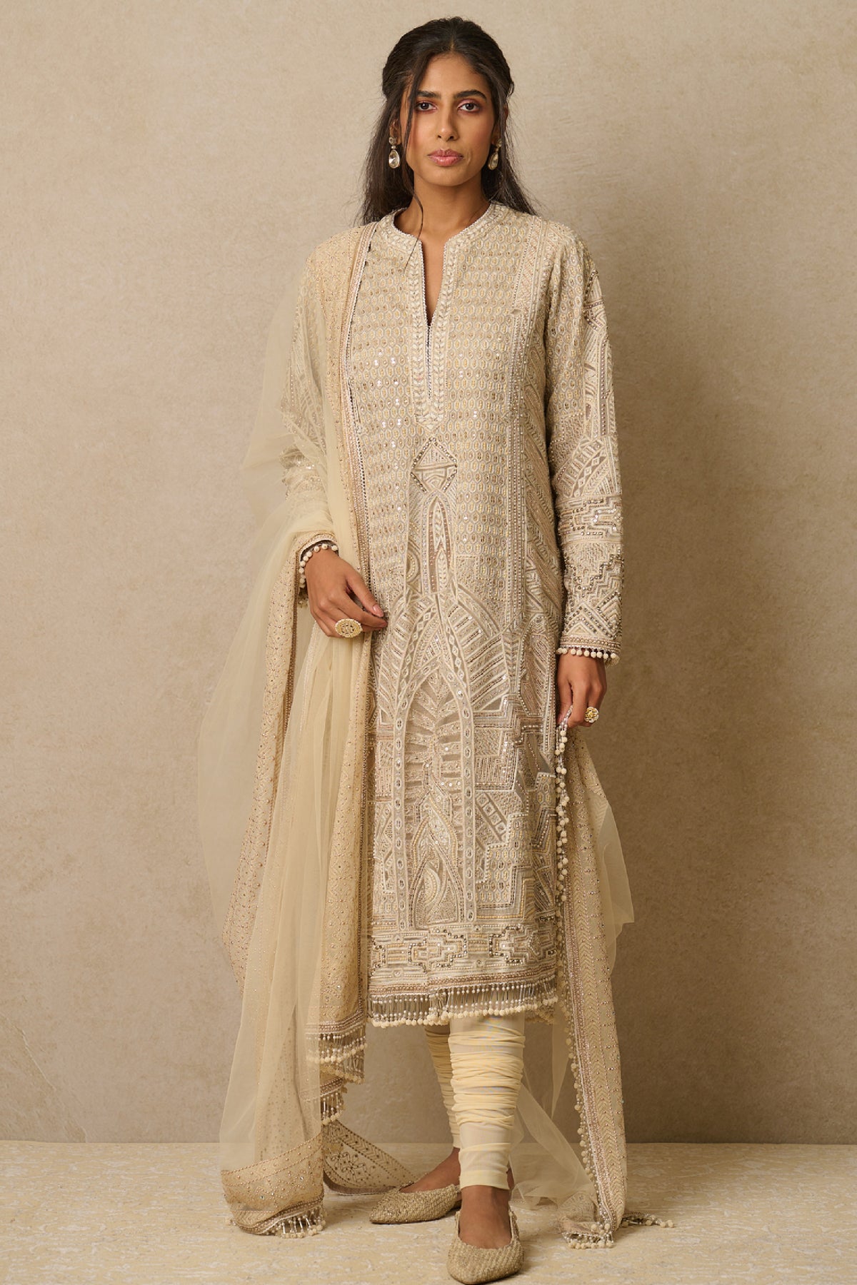 This art deco inspired kurta is embellished with sequins, swarovski crystals & pearls. It is paired with a tulle dupatta & churidar