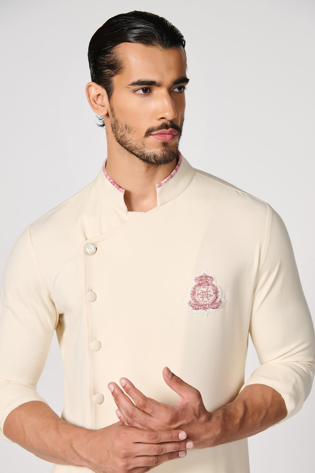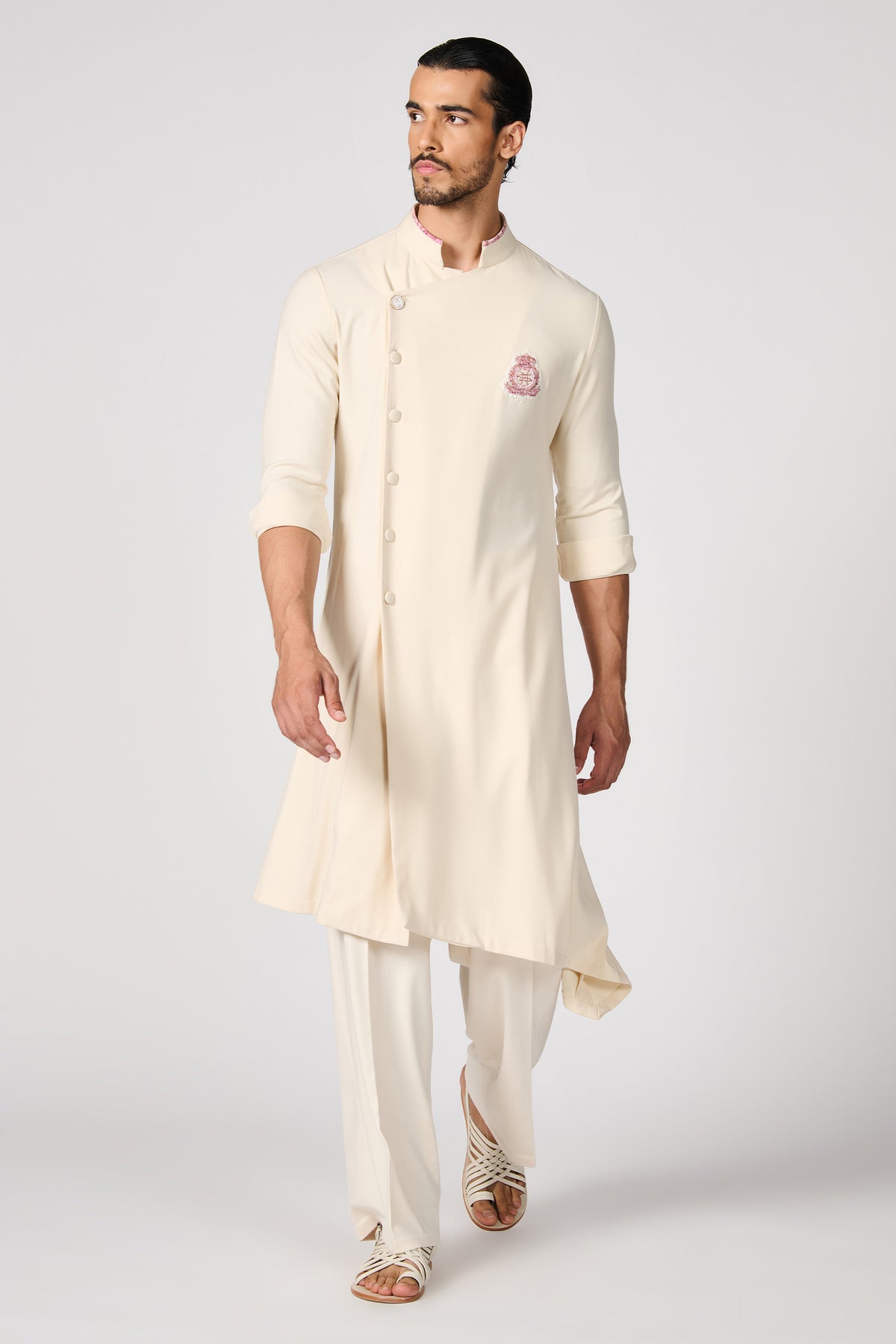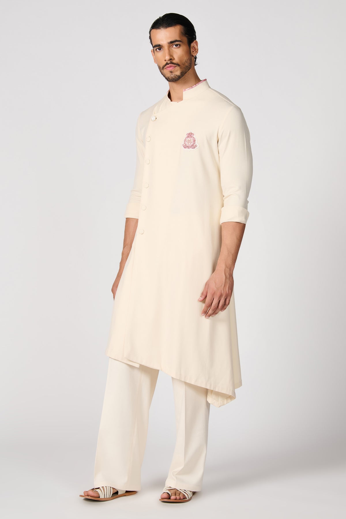 Tailoring never looked so suave with this off-centre kurta. Blurring the lines between past and present with its classic cut and modern detailing's, it features faux leather embroidered crest.