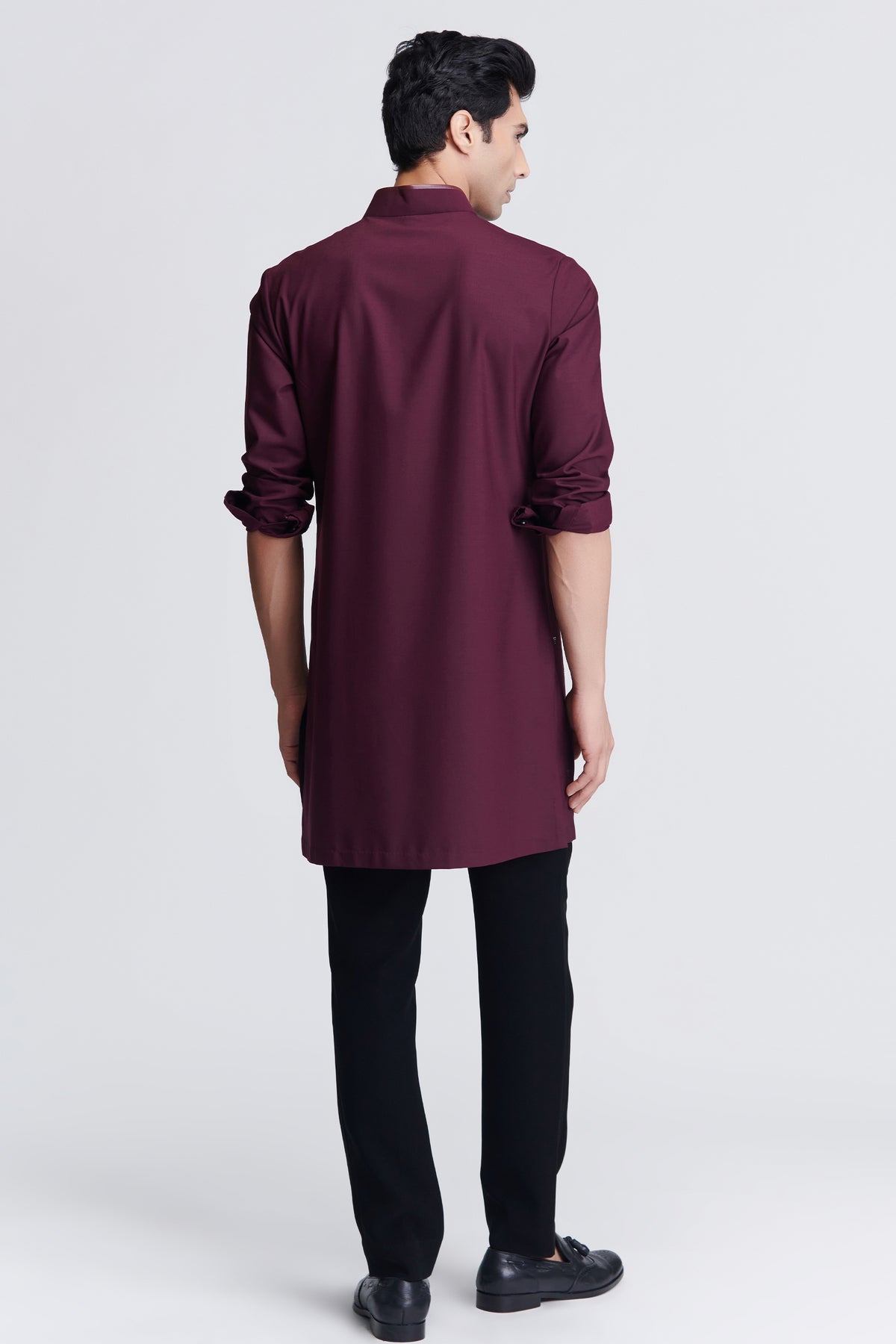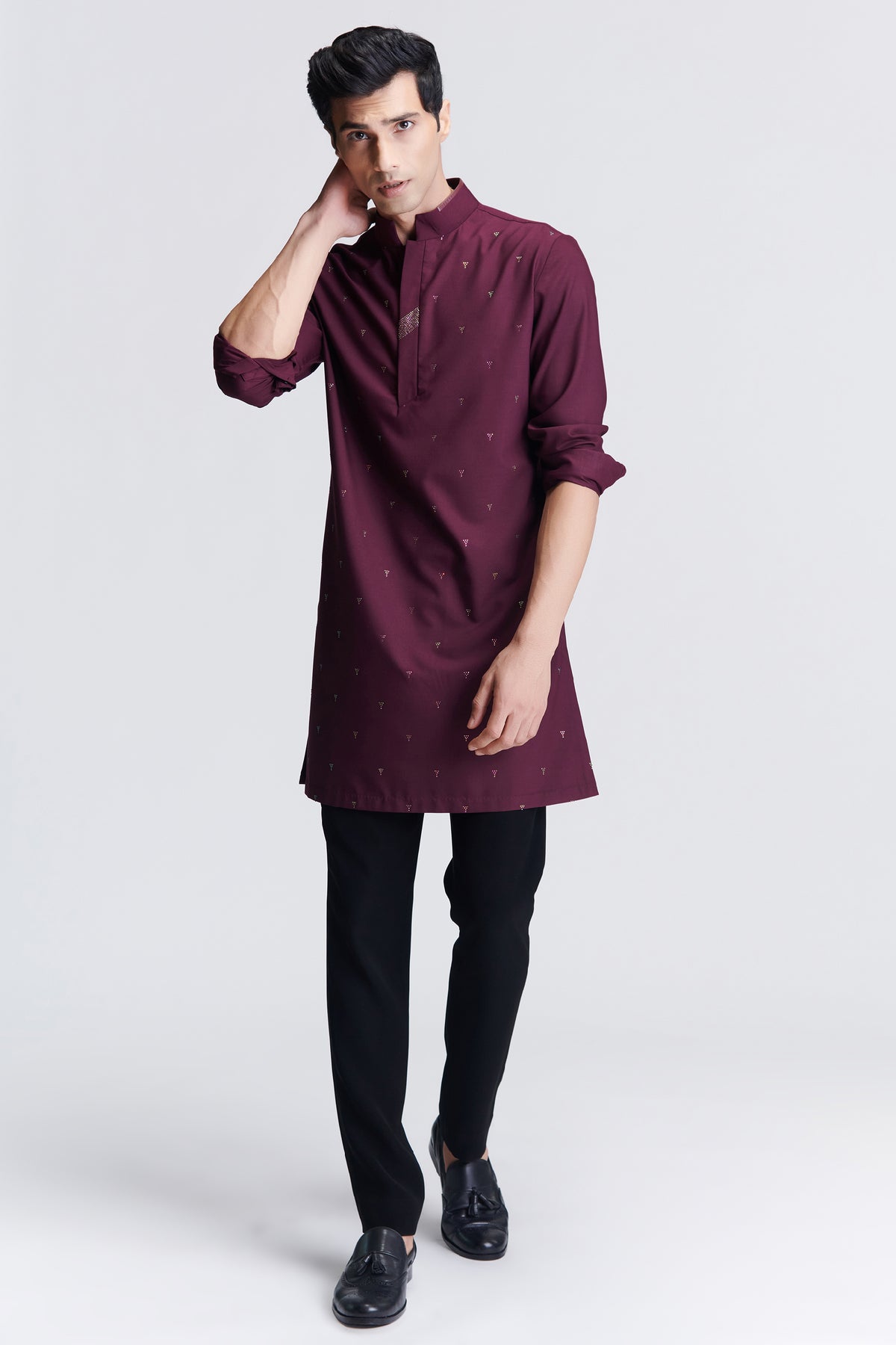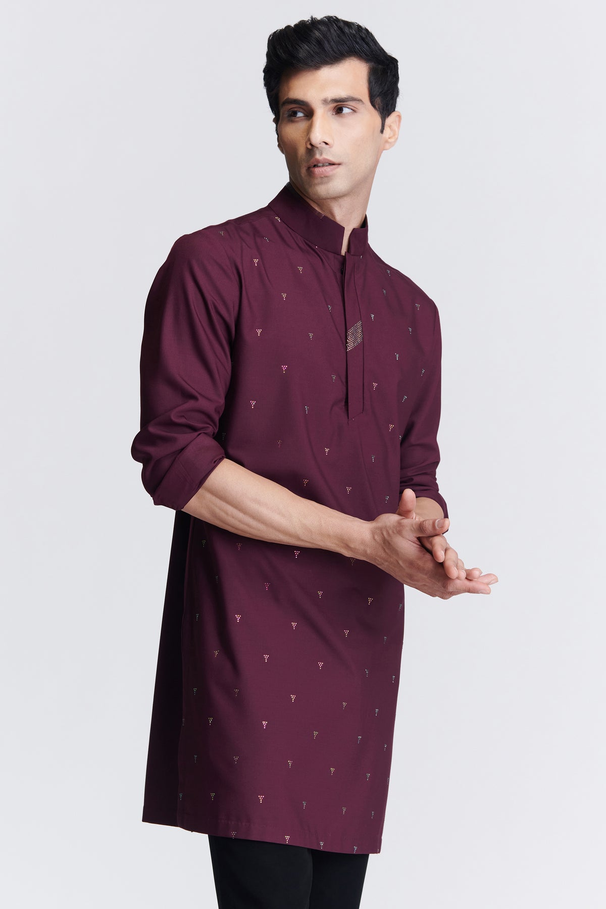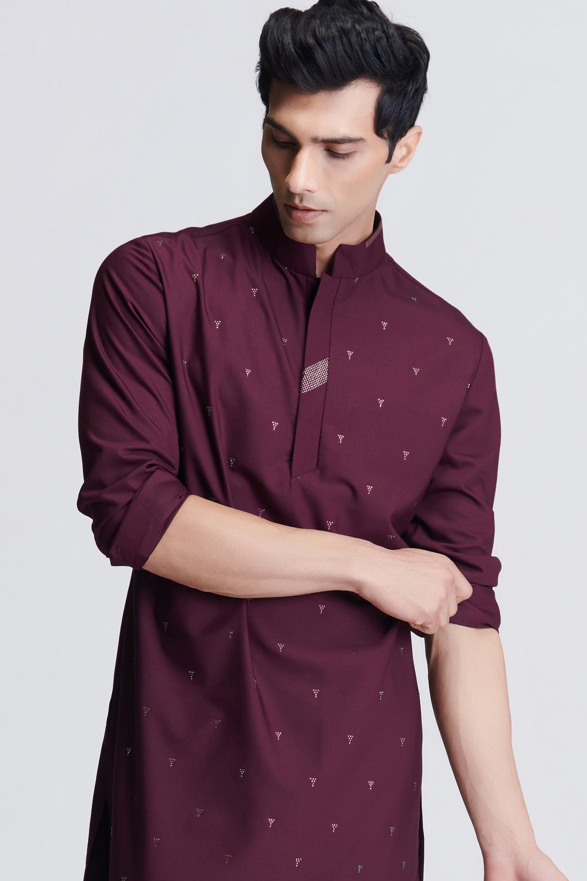 Upgrade your wardrobe with this plum kurta accentuated with shimmering crystals, perfect for your upcoming festive soiree. Accessories such brooch, pocket square etc are used for styling purpose only.
