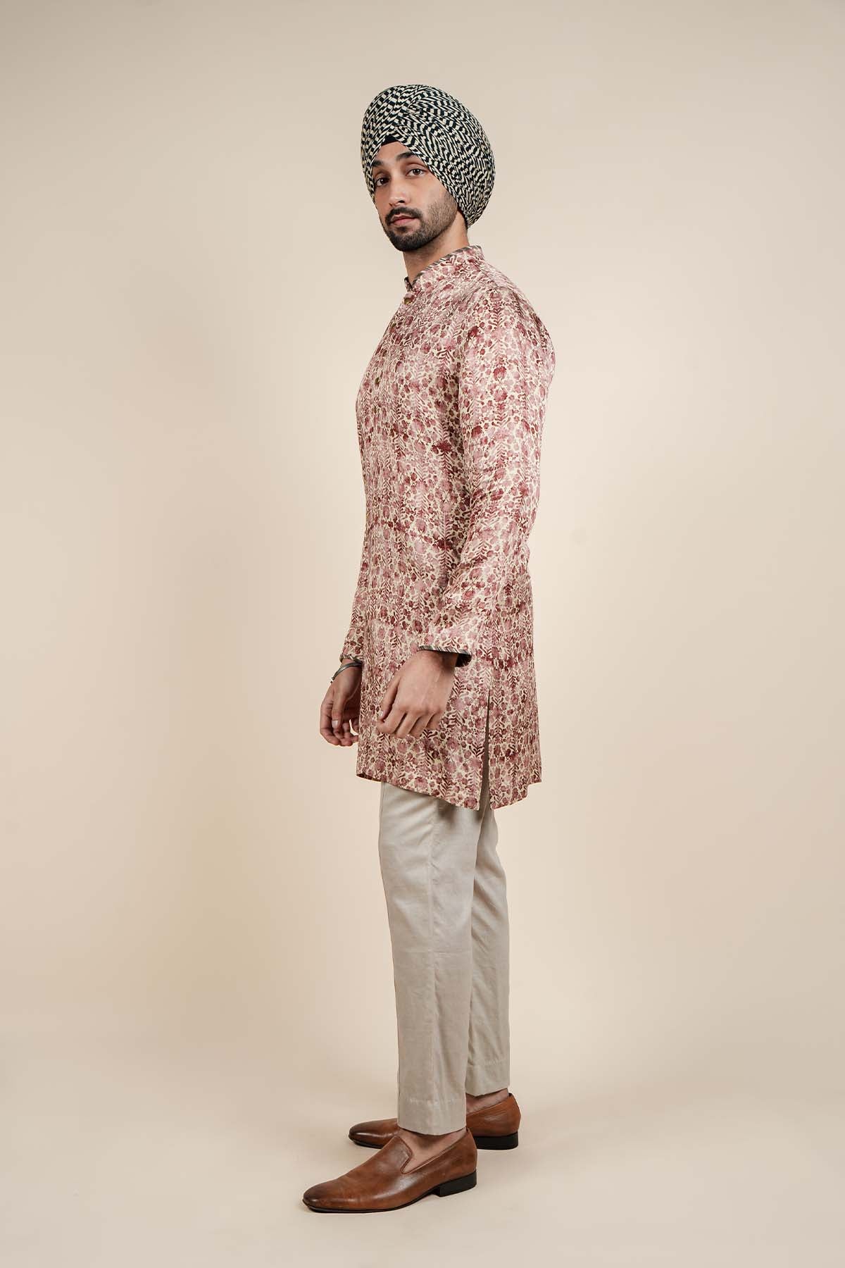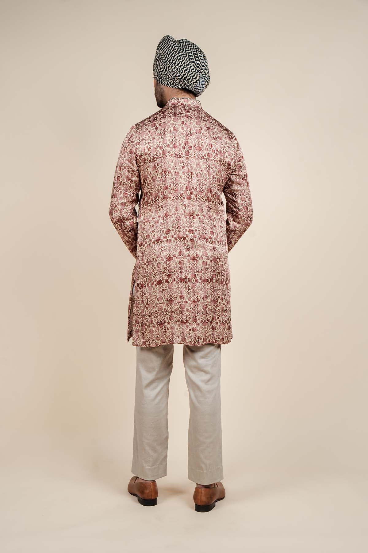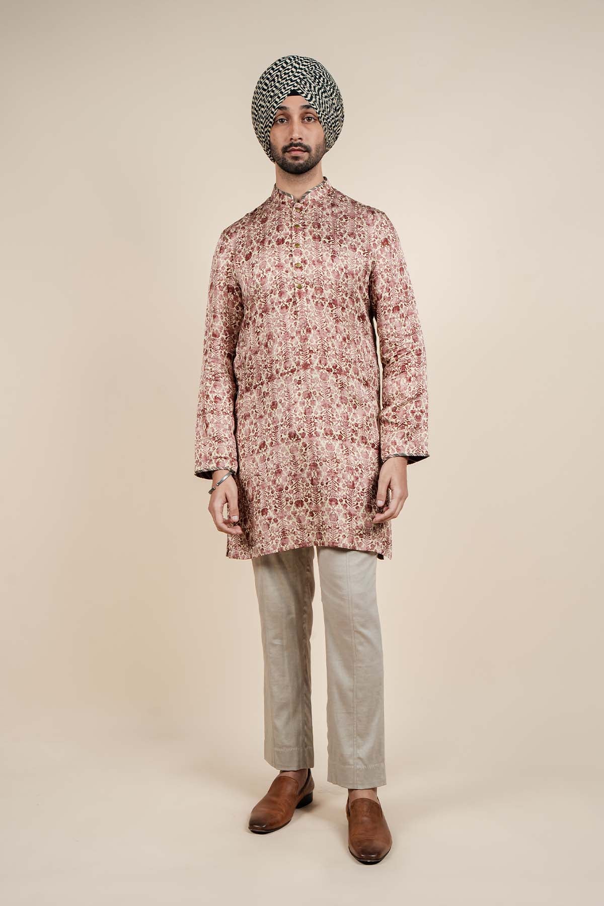 The beige satin linen kurta features a delicate floral digital print and stripes pattern piping detail on the collar and sleeves, complemented by antique gold buttons.