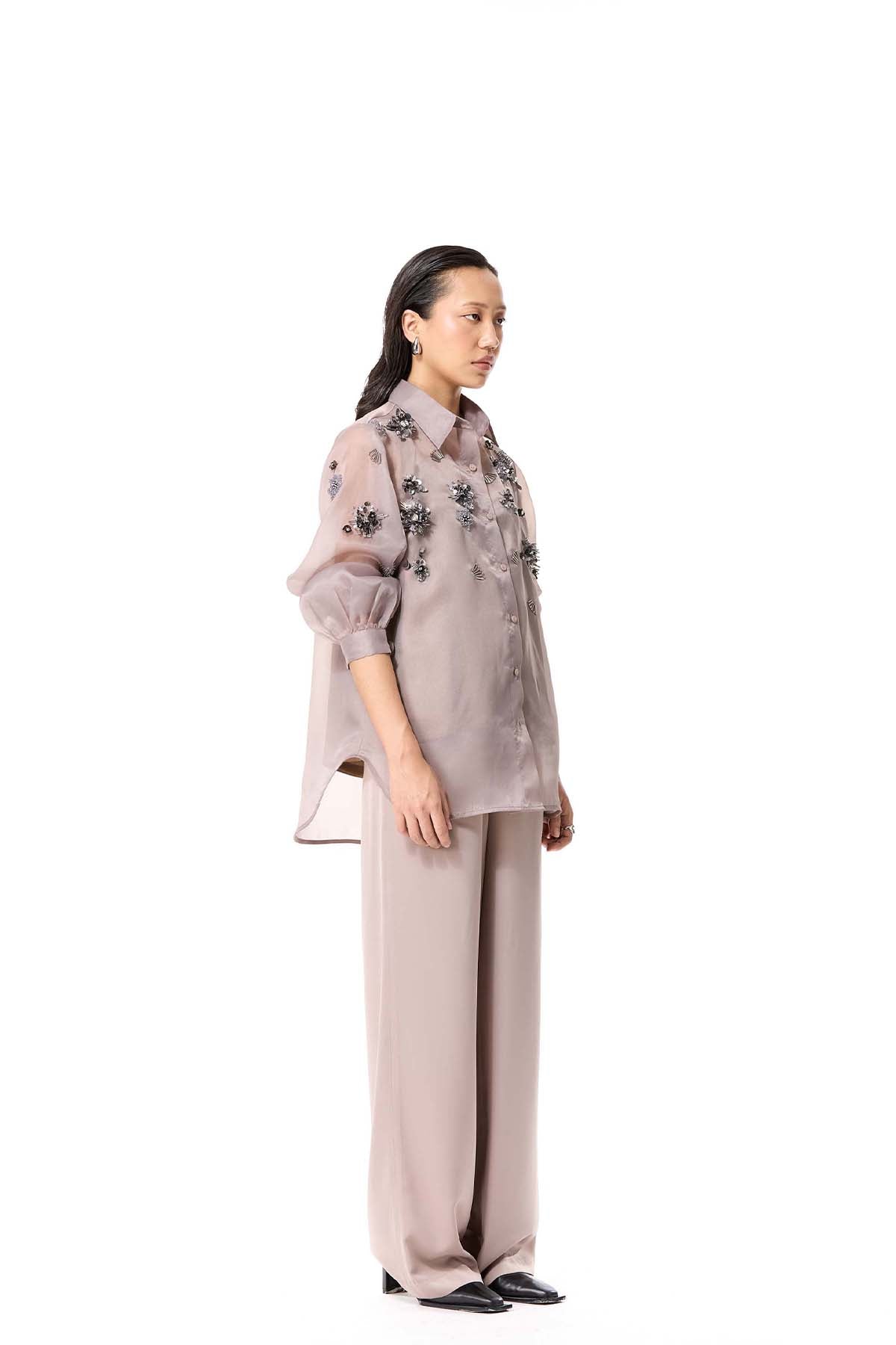 Beige pants with front button closure.