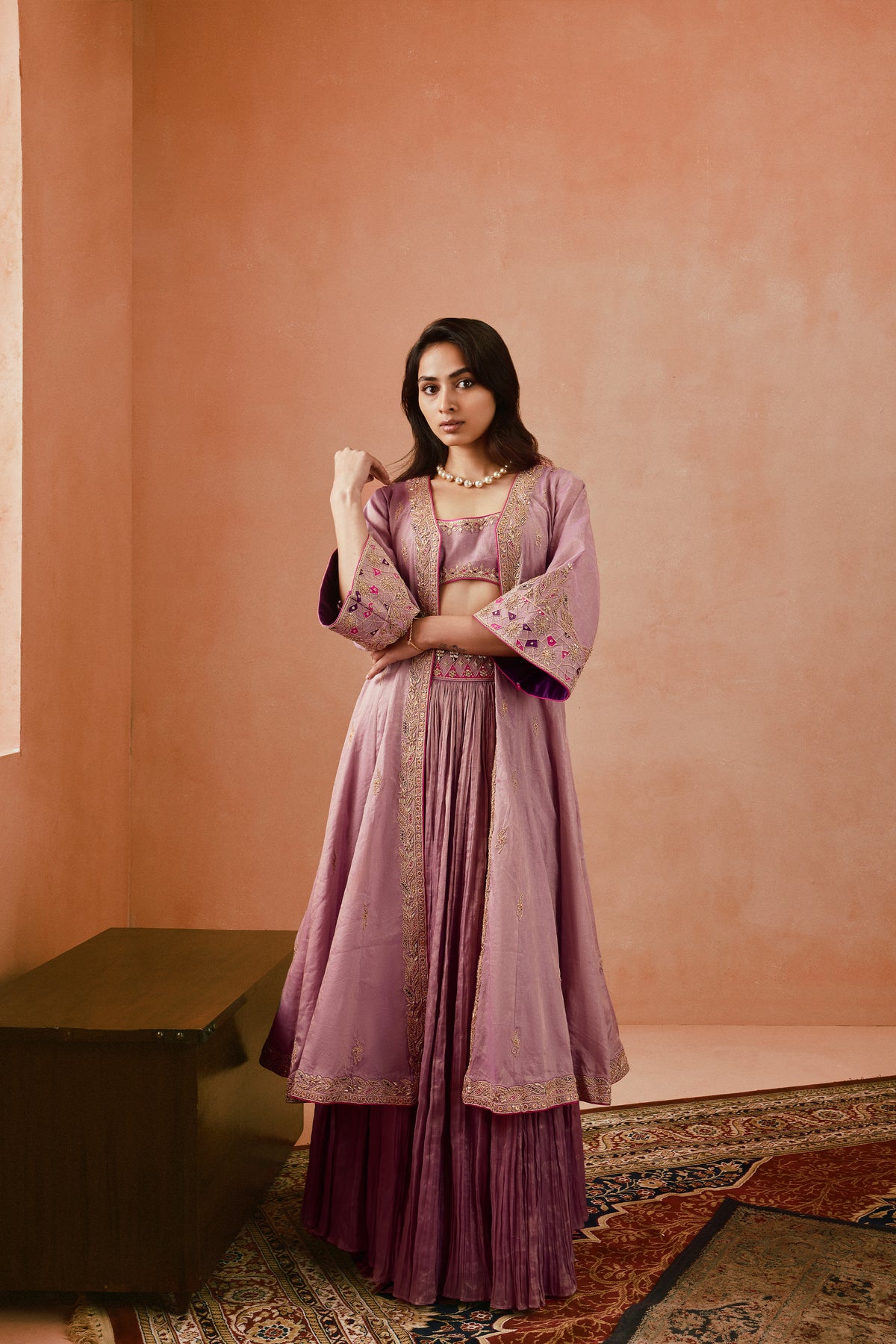 The classic lilac tissue cape set is paired with a  bralette, featuring beautifully intricate dori work. This elegant look is complemented by a tissue-crushed skirt with an embroidered cape, creating a stunning and sophisticated ensemble perfect for any occasion.