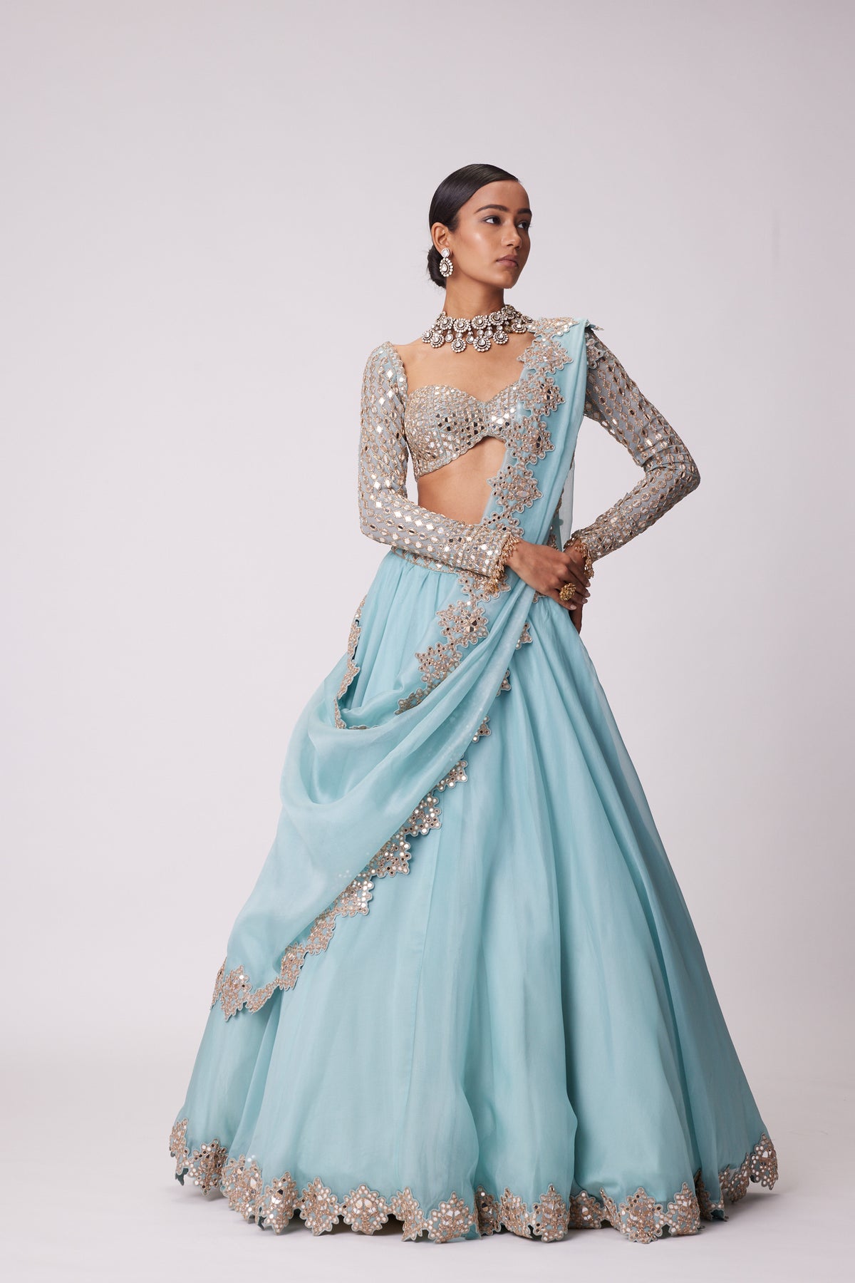 Powder blue organza real hand-cut mirror embroidered lehenga and dupatta clubbed with a heavily mirror embellished full sleeve blouse.