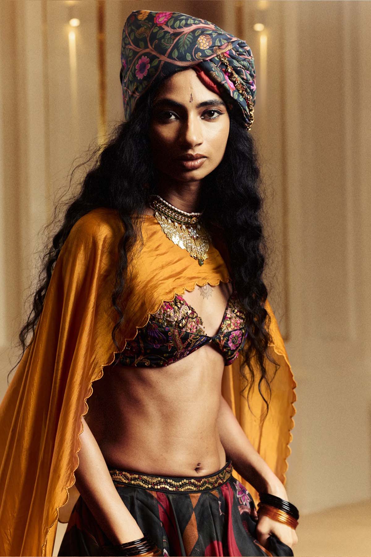 Fabric: Lehenga : Organza, Cape : Organza Silk, Bralette: Chanderi Silk