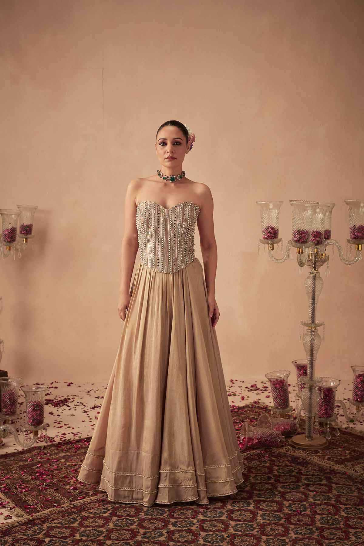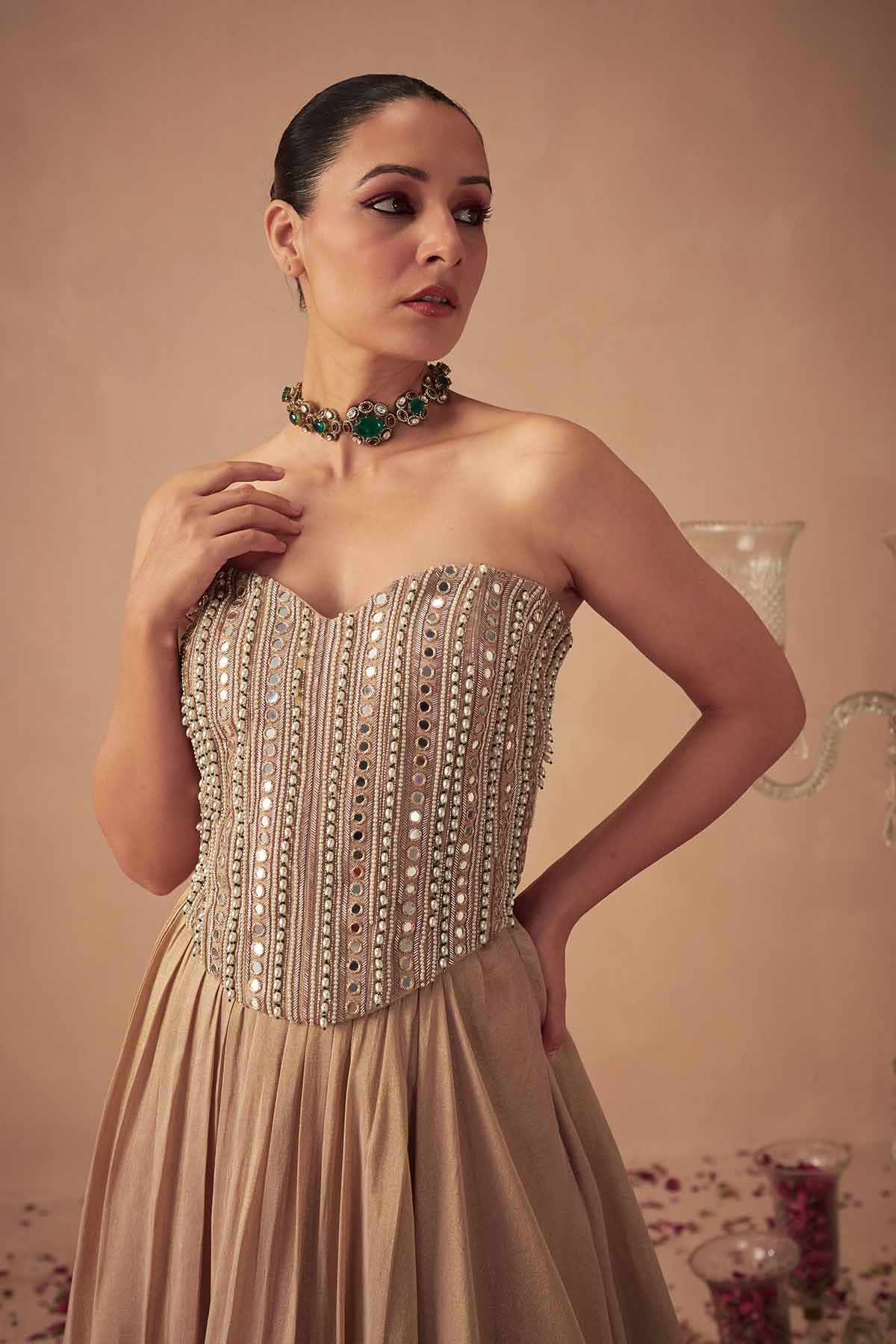 Featuring a rose gold tissue lehenga saree paired with a mirror-work embroidered blouse.