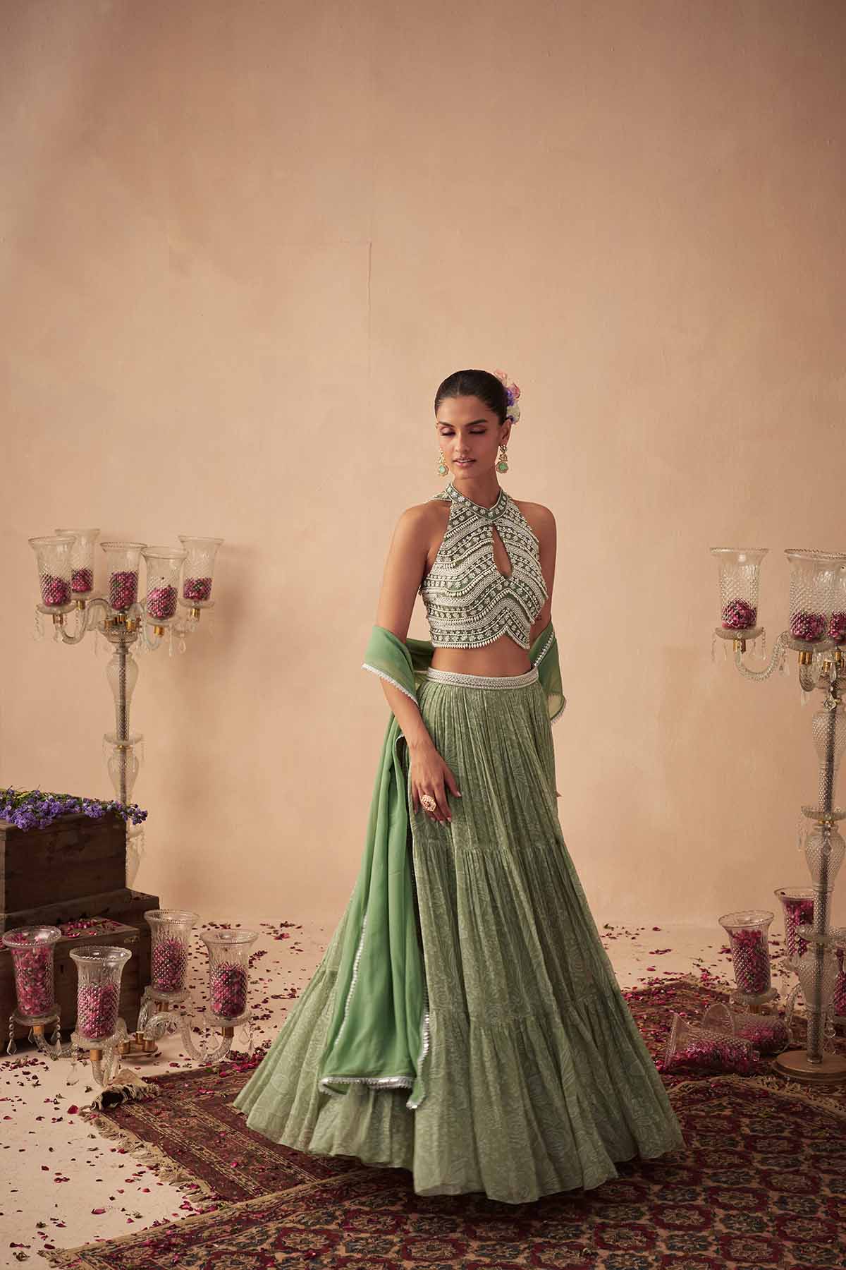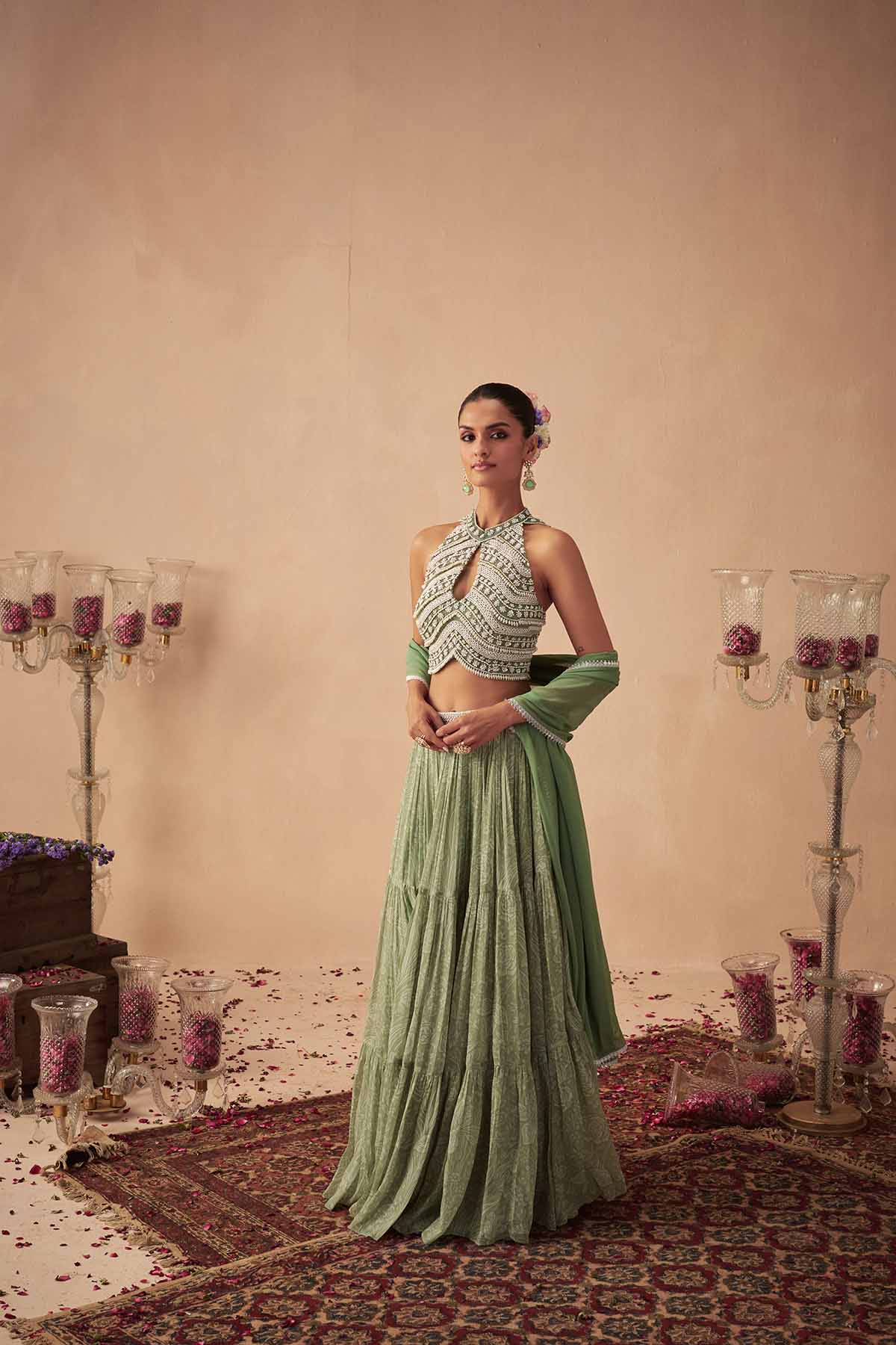 Featuring a sage green printed lehenga in georgette, paired with a halter neck embroidered blouseand a solid dupatta in georgette.