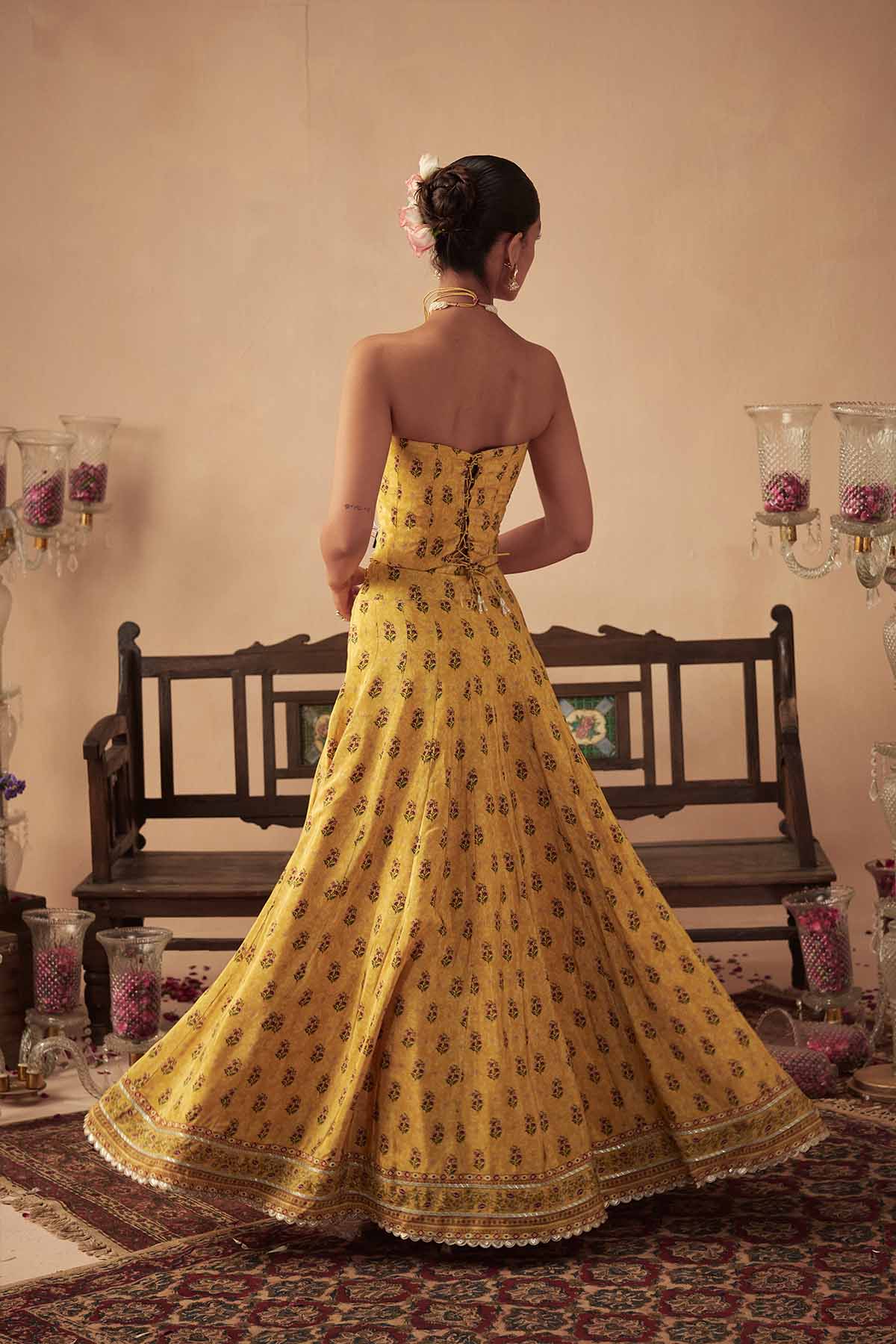 Featuring a yellow printed lehenga paired with a printed, hand-embroidered corset.