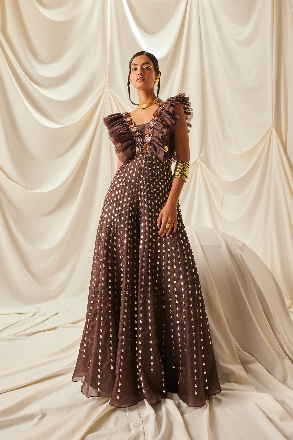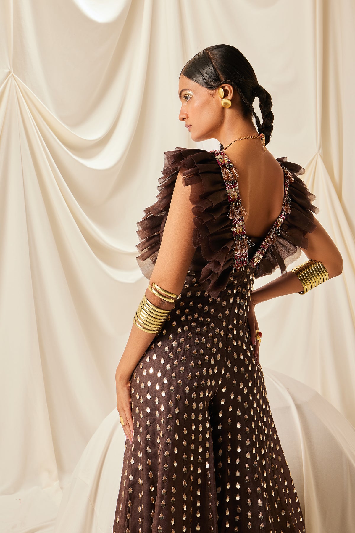 Maison Blu Brown Fully Embelished Ruffle Jumpsuit indian designer wear online shopping melange singapore