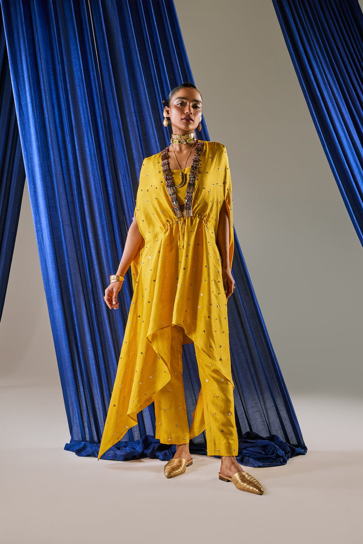 Mustard yellow cape with sequence and fringe on necline + bustier + pant with sequence