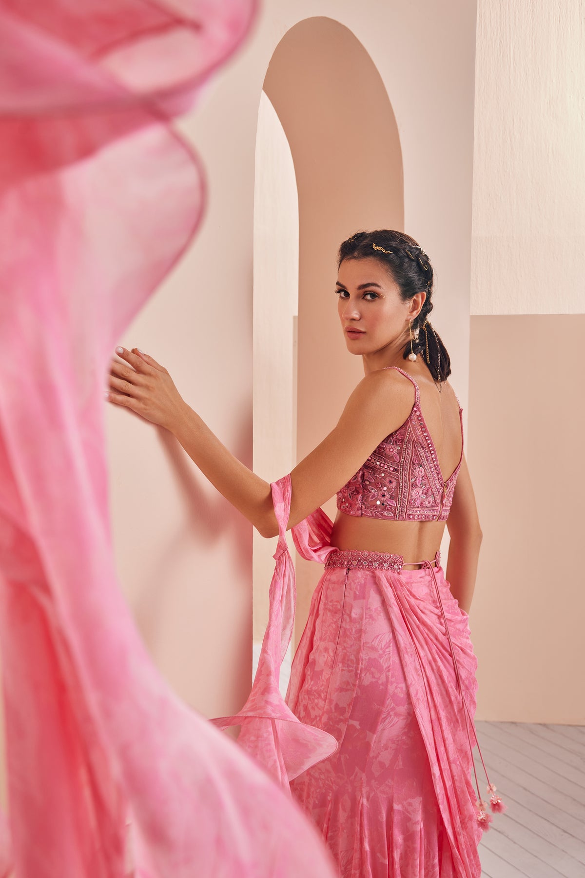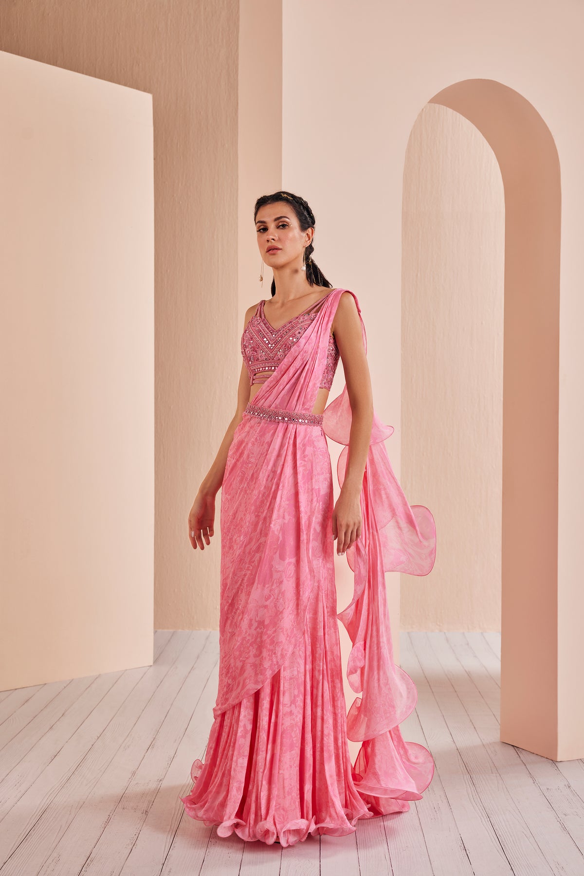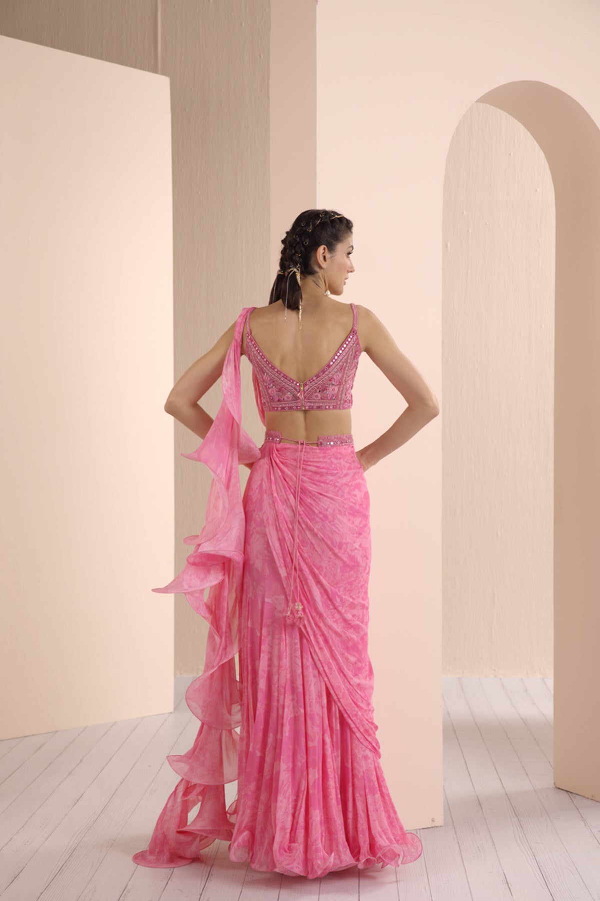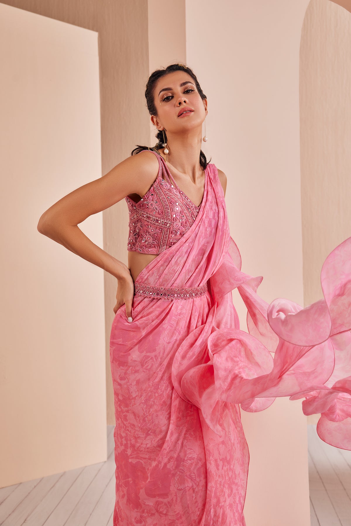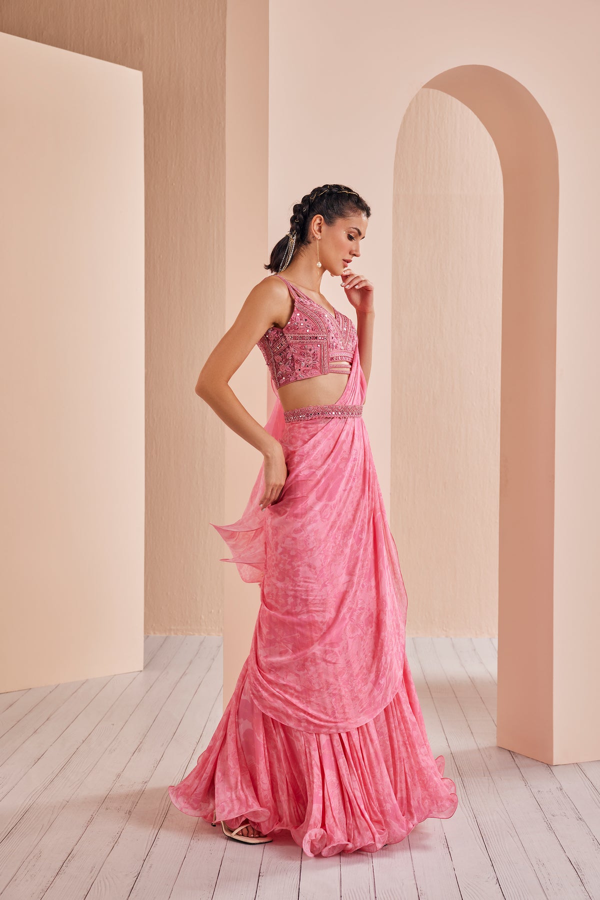 Chiffon Draped Saree With Embroidered Blouse And Belt