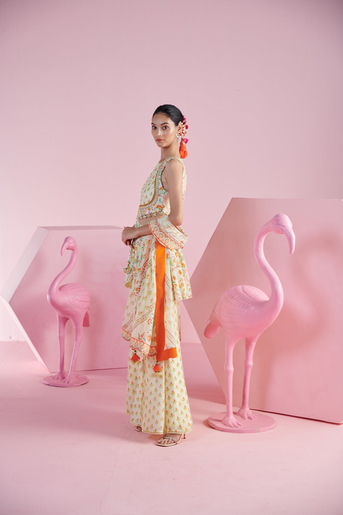 Lemon zest peplum top with cut-out details with tassels, along with printed sharara, and dupatta