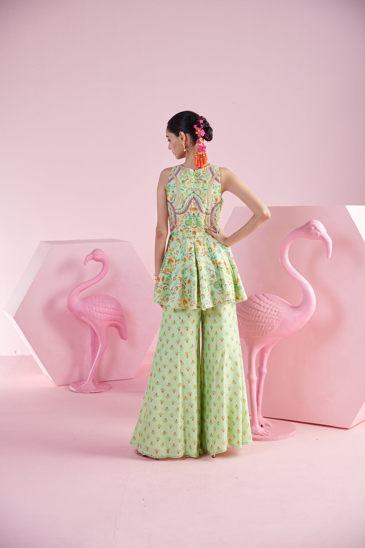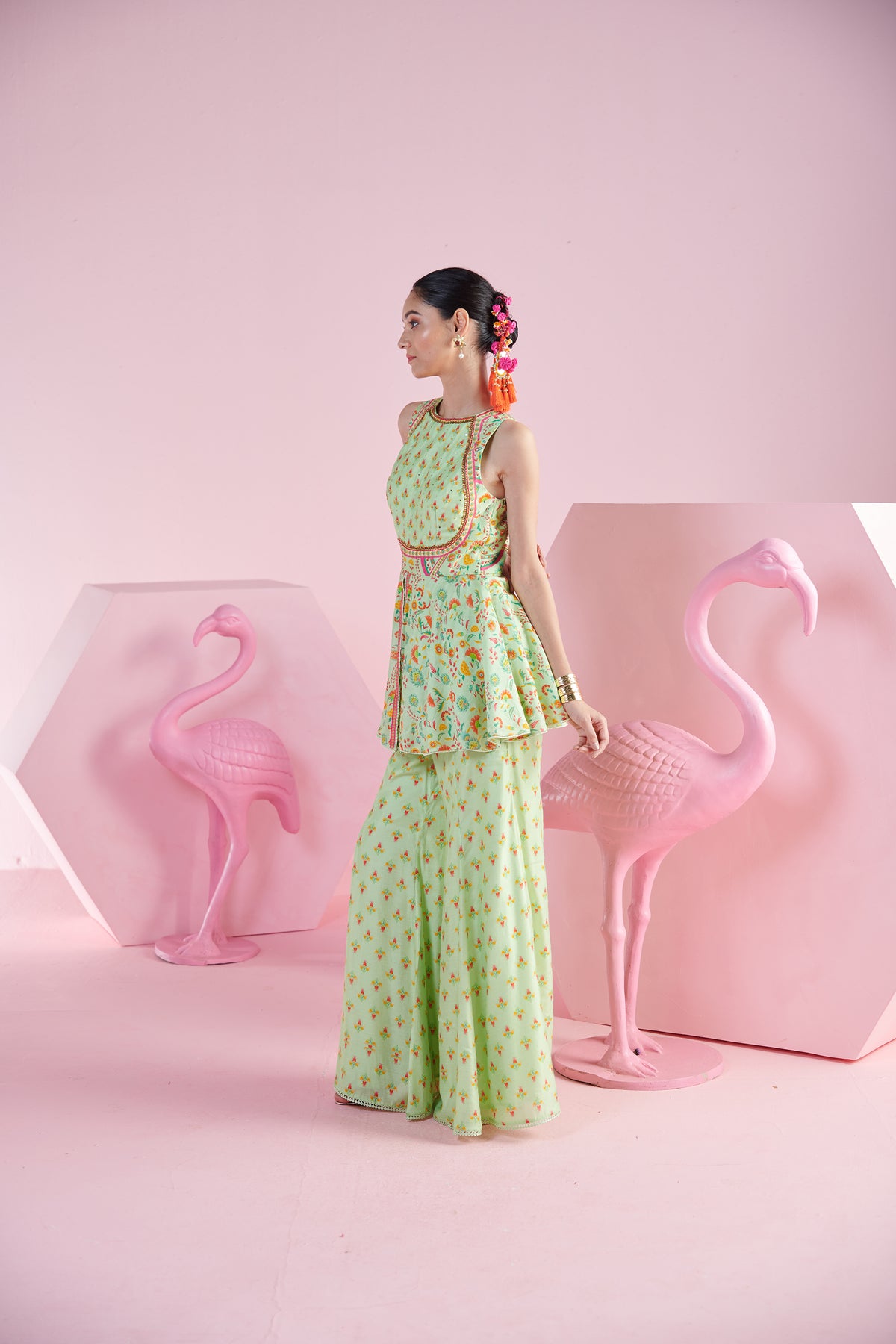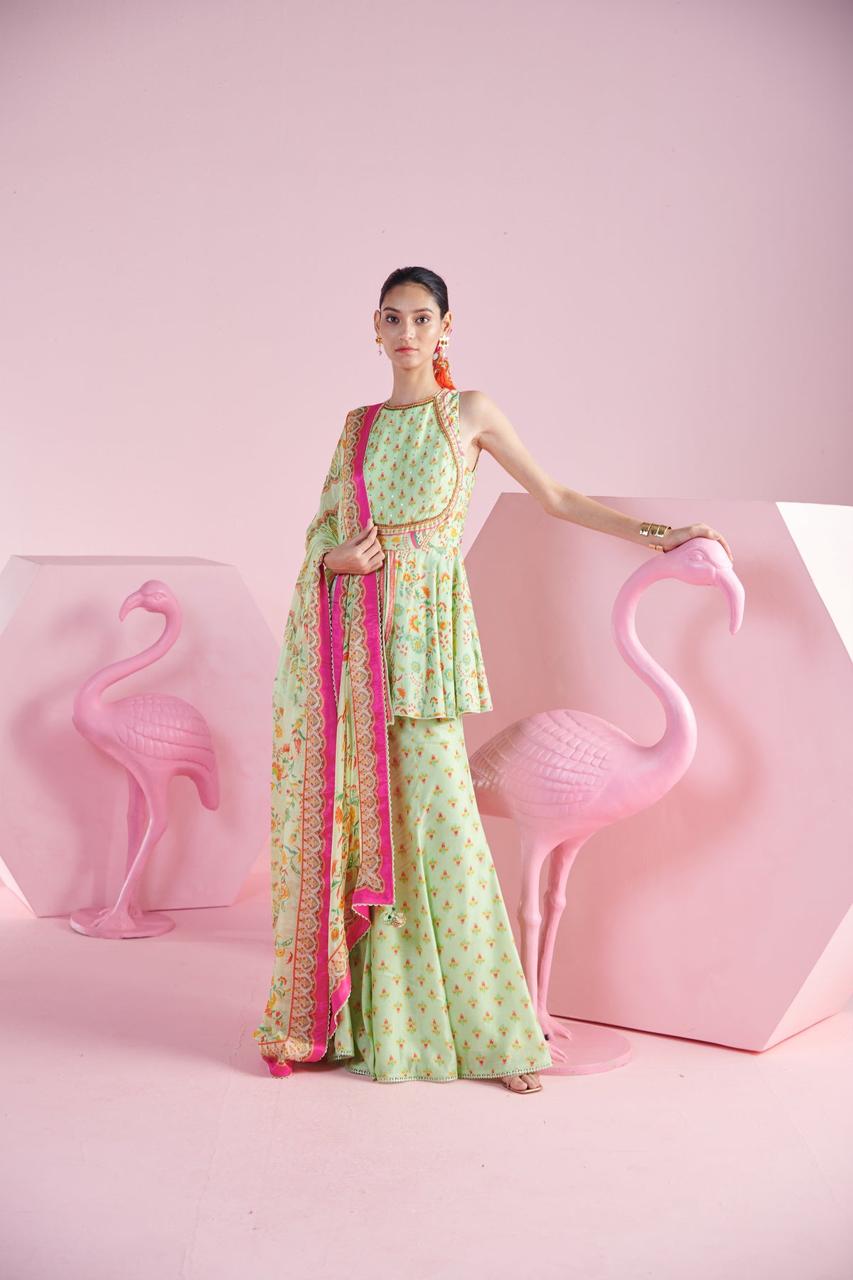 Pista elegance peplum top with flare pants and iznik printed dupatta