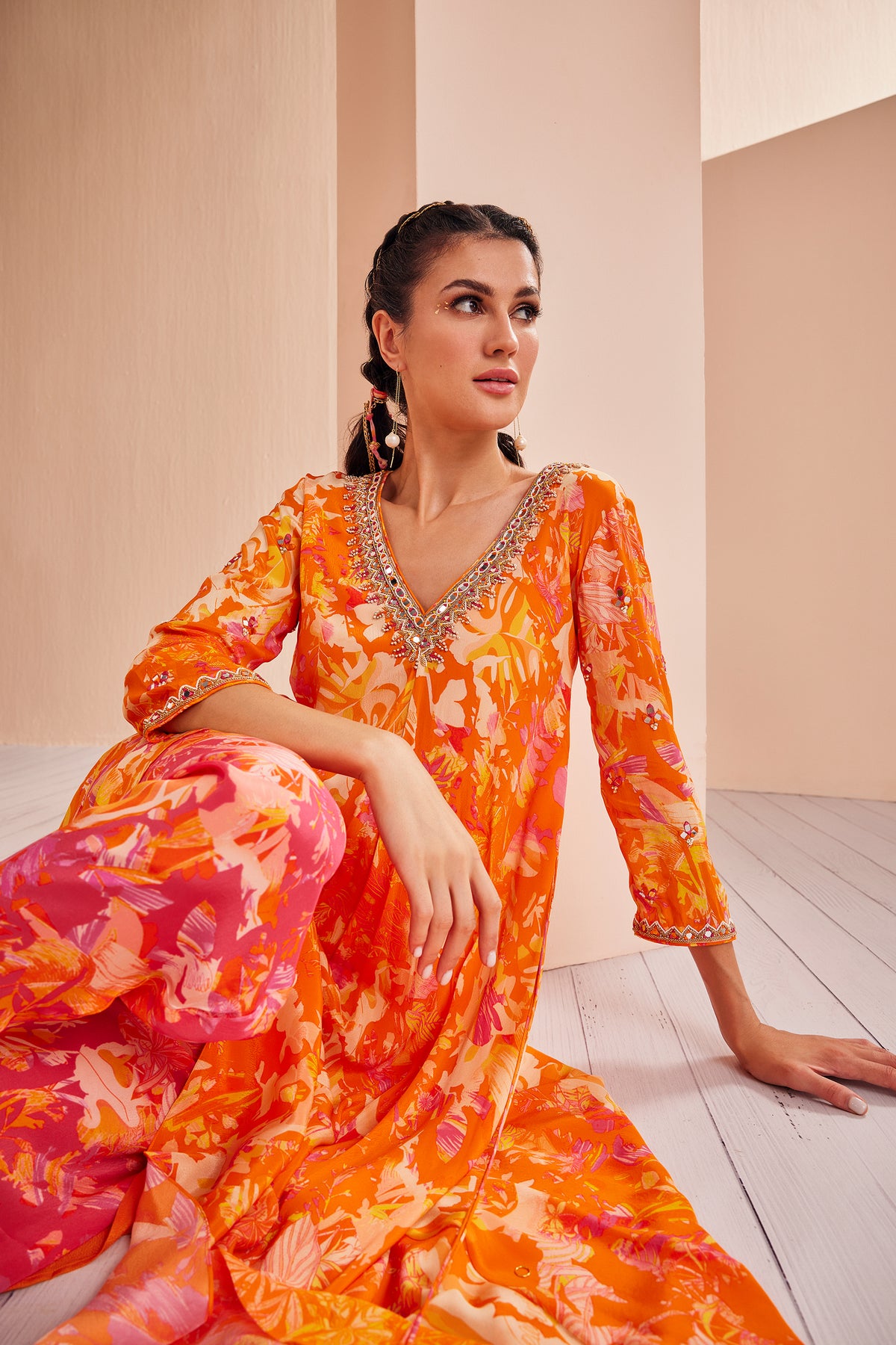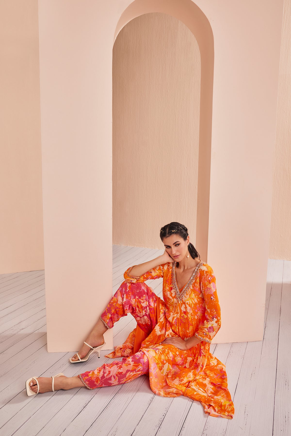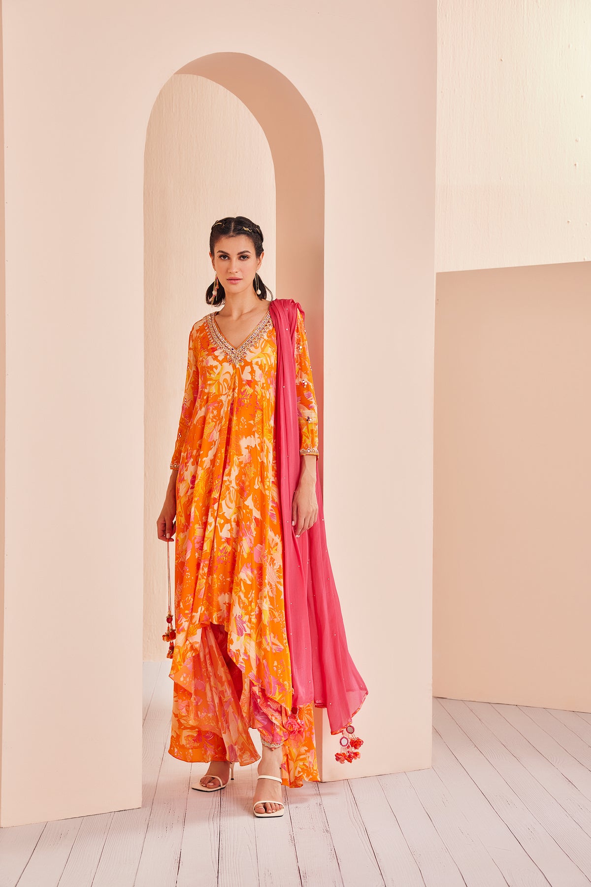 Elevate your fashion quotient with these printed crepe kurtis, each one a canvas of style and sophistication. They are adorned with intricate gold and white embroidery that adds a touch of opulence and charm. Paired with comfortable dhoti pants, the ensemble strikes a perfect balance between tradition and contemporary flair. To complete the look, a complementary solid chiffon dupatta with a border detail adds a layer of finesse, while heavy mirror tassels sway gracefully, adding a playful and whimsical element to the outfit. This ensemble is a seamless fusion of cultural richness and modern design, making it an ideal choice for any occasion
