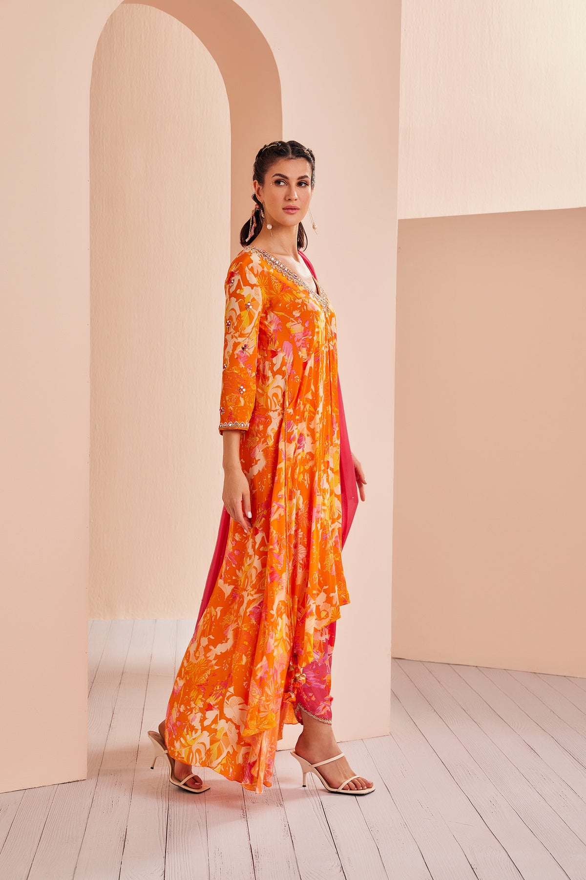 Printed Crepe Asymmetric Embroidered Tunic Complimenting With Dhoti And Dupatta