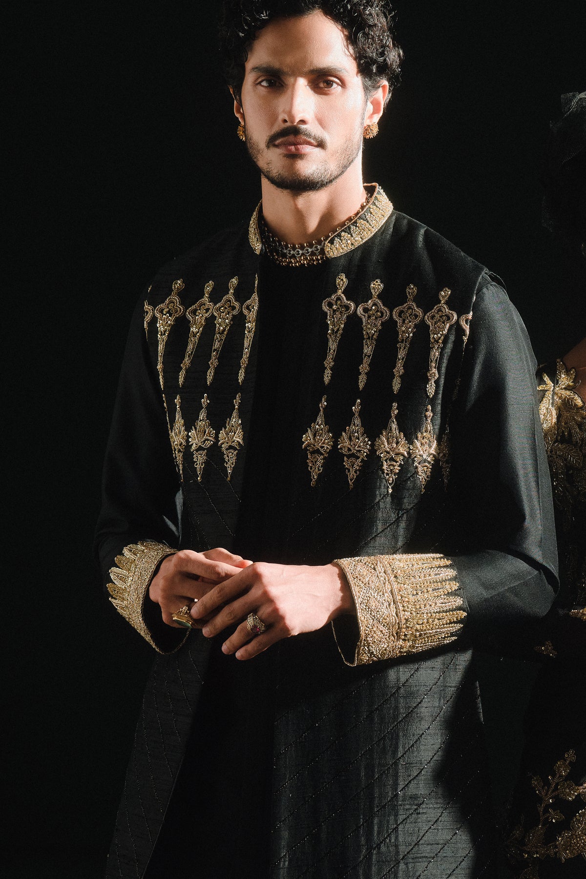 The kala khatta long bandi is perfect for a sangeet night full of dancing and celebration! With the tricone border framing the hem and delicate lines running across the body with ornate linear motifs crowning the sherwani. This is an open bandi with an embelished kurta inside which makes it a perfect layered ensemble. Ā Ā Ā Ā