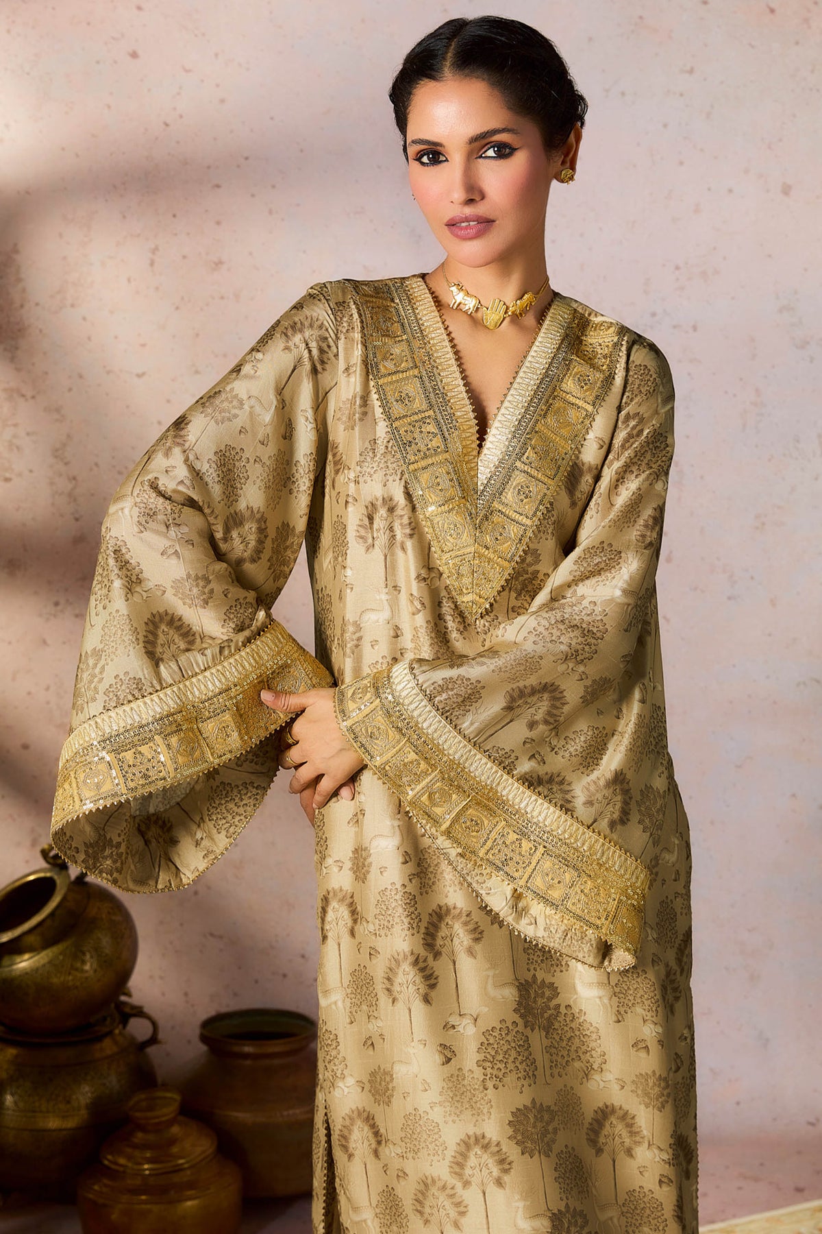 Tunic- beautiful all over print straight kurta with flared sleeves | 'v' neckline and sleeves embellished with embroidered borders and edged with kinari | calf-length pant- narrow pants embellished with embroidered borders | side seam closure