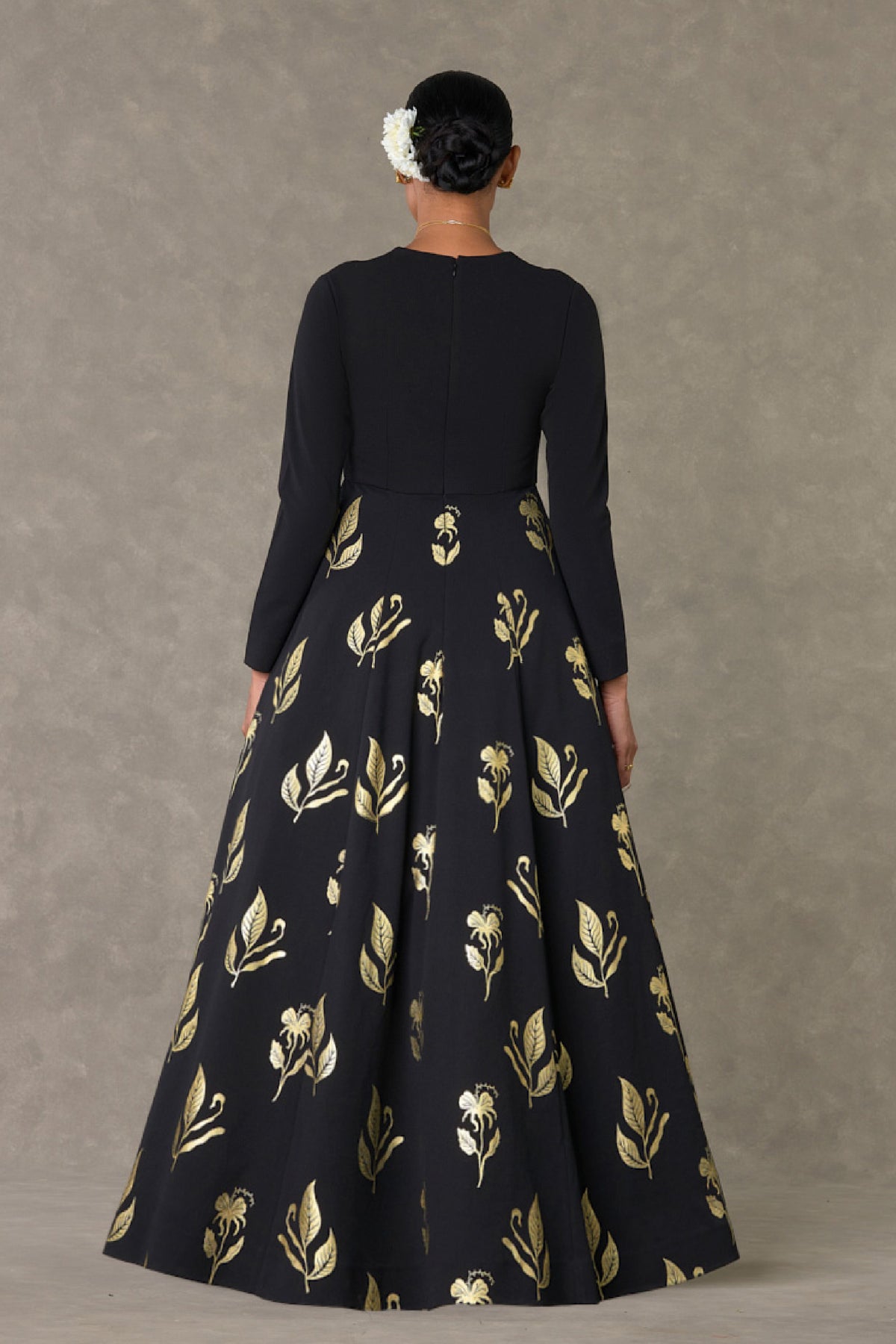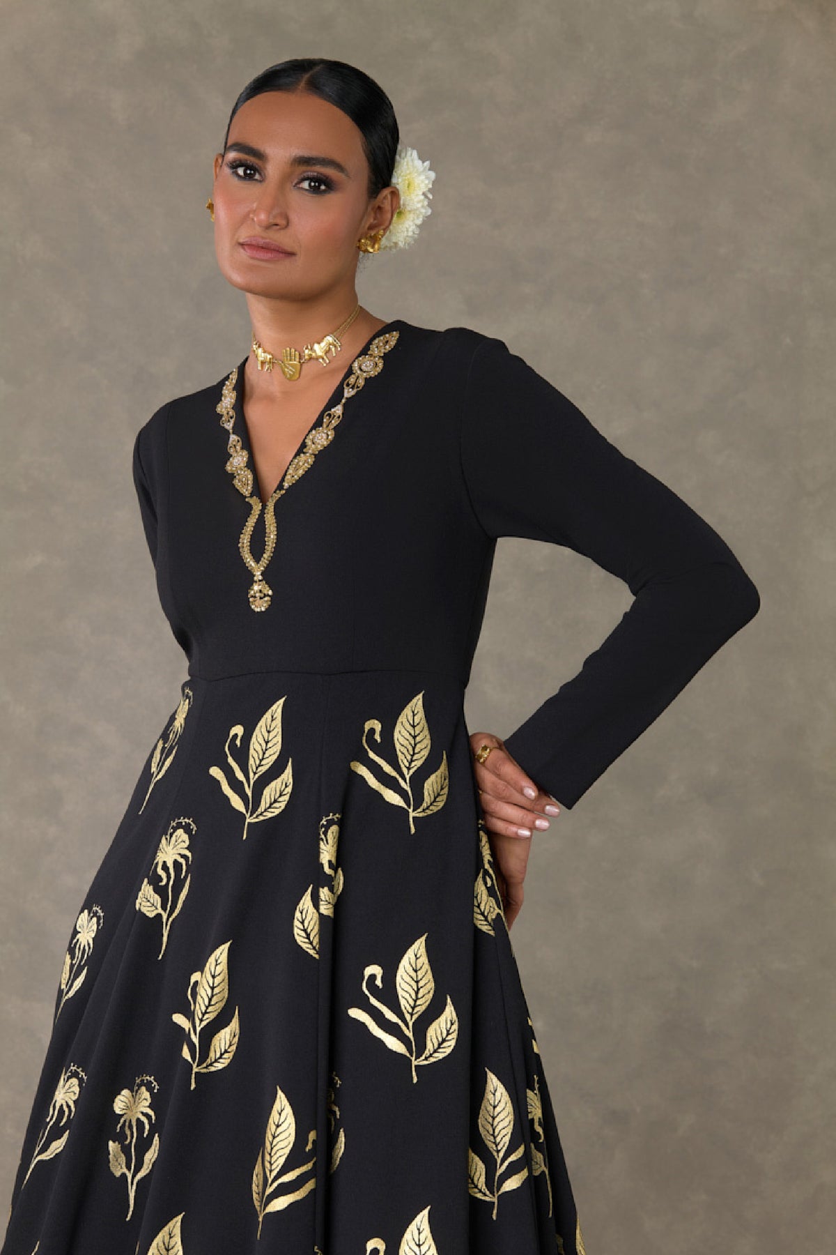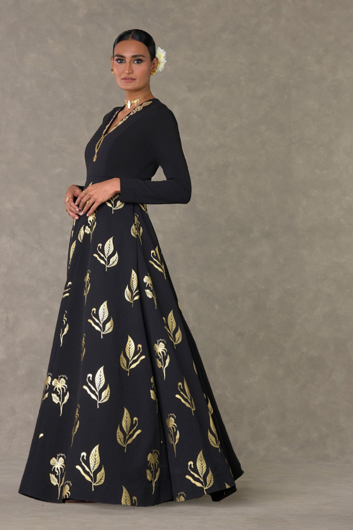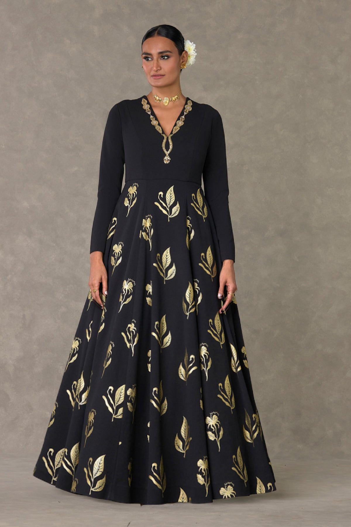 All over foil printed gown | 'v' neckline embellished with dori and sitara kaam | full sleeves | comes with attached can can | center back closure