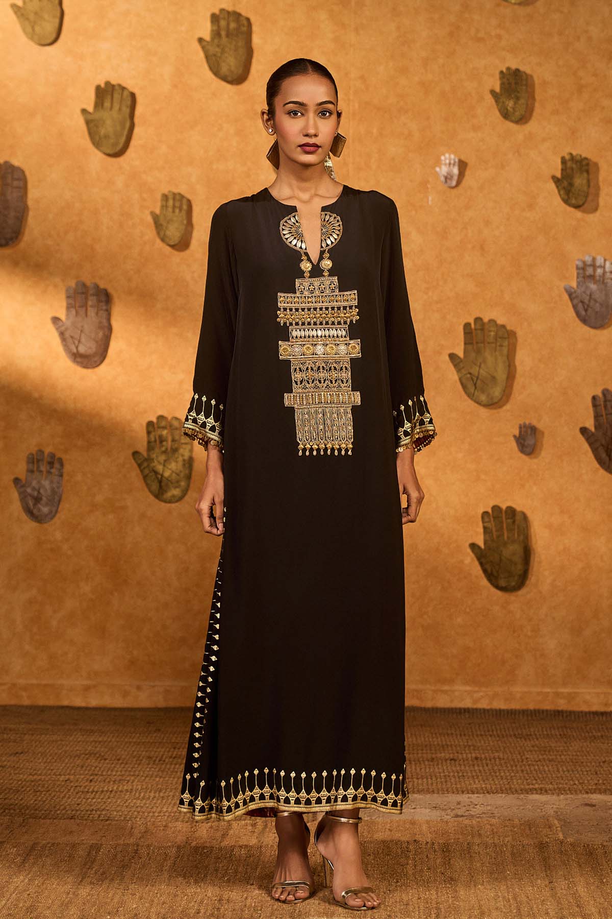 A timeless black kaftan, featuring intricate hand embroidery at the front. Side slits are accented with a foil border and delicate coin detailing, adding subtle shimmer and artisanal charm to the silhouette.