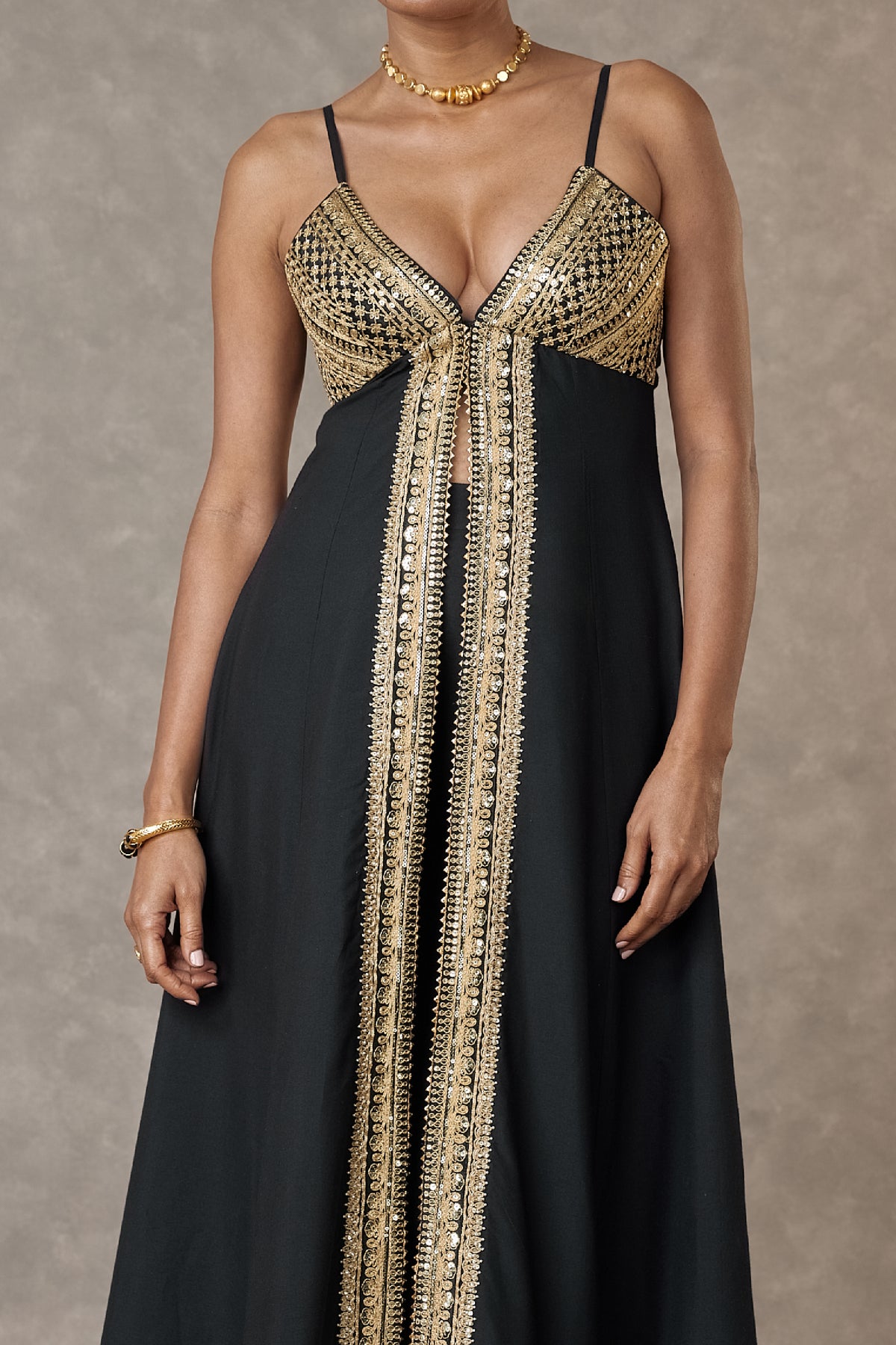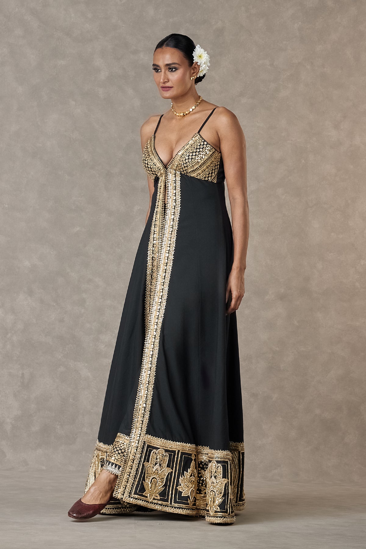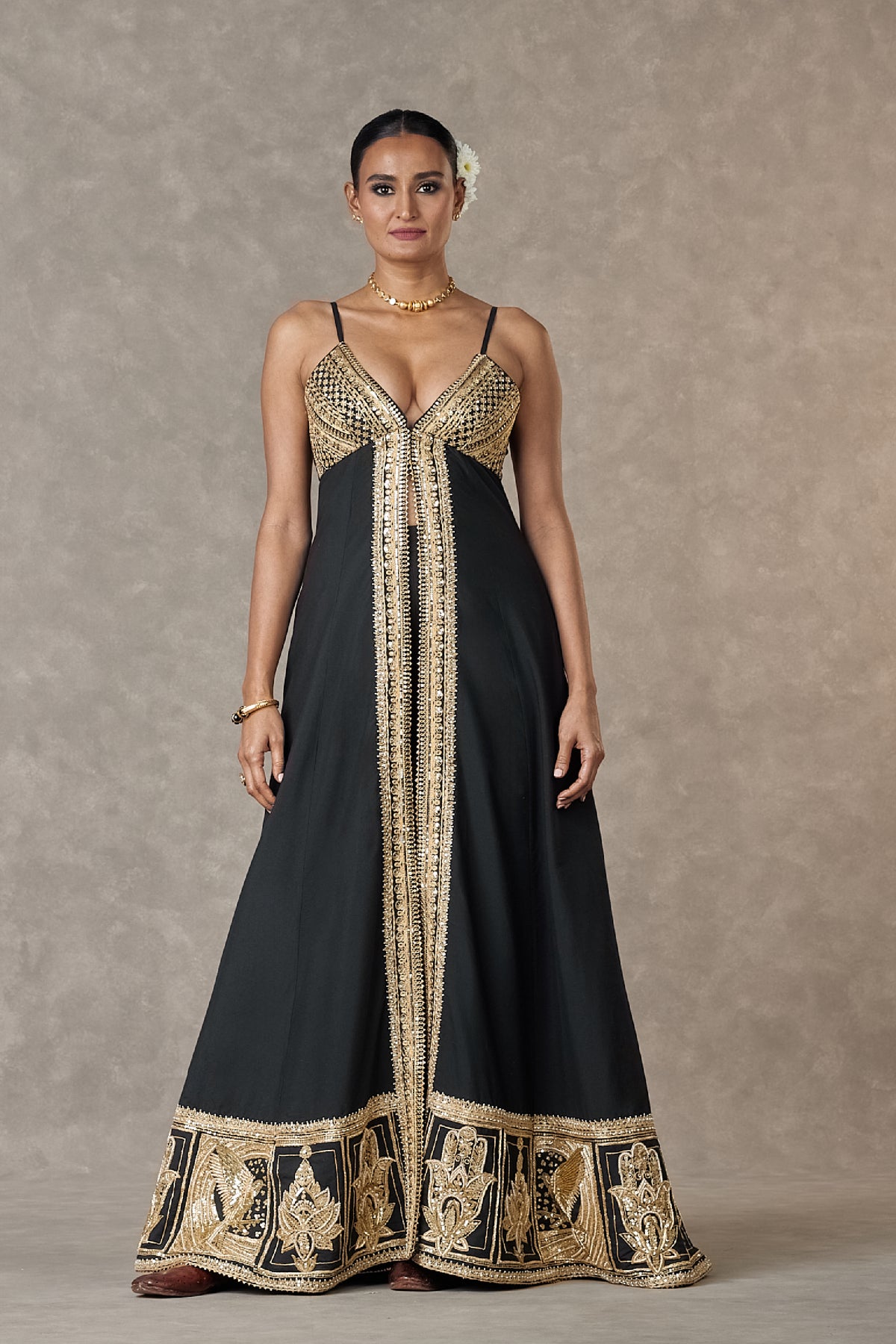 Tunic- tunic with centre front slit embellished with our signature haathphool motif embroidered in dori, sitara and dabka kaam | hem is beautifully embellished with multi motifs in dori, sitara and dabka kaam | centre front closure |adjustable straps | edged with kinari pant- pant embellished with embroidered borders | side zip closure