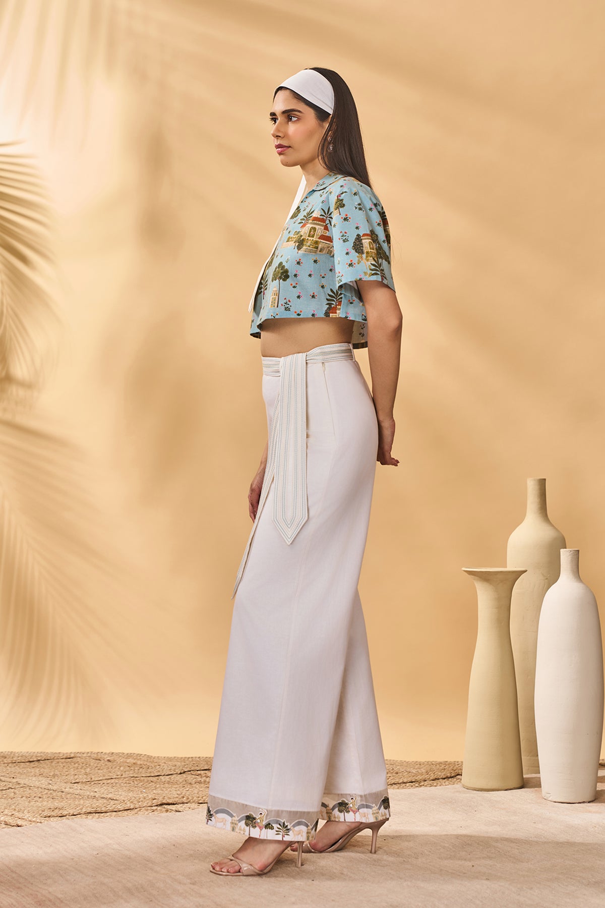 Straight trousers| side seam zipper closure | stitch detailing on belt | scallop border patched on sheer fabric on the hem