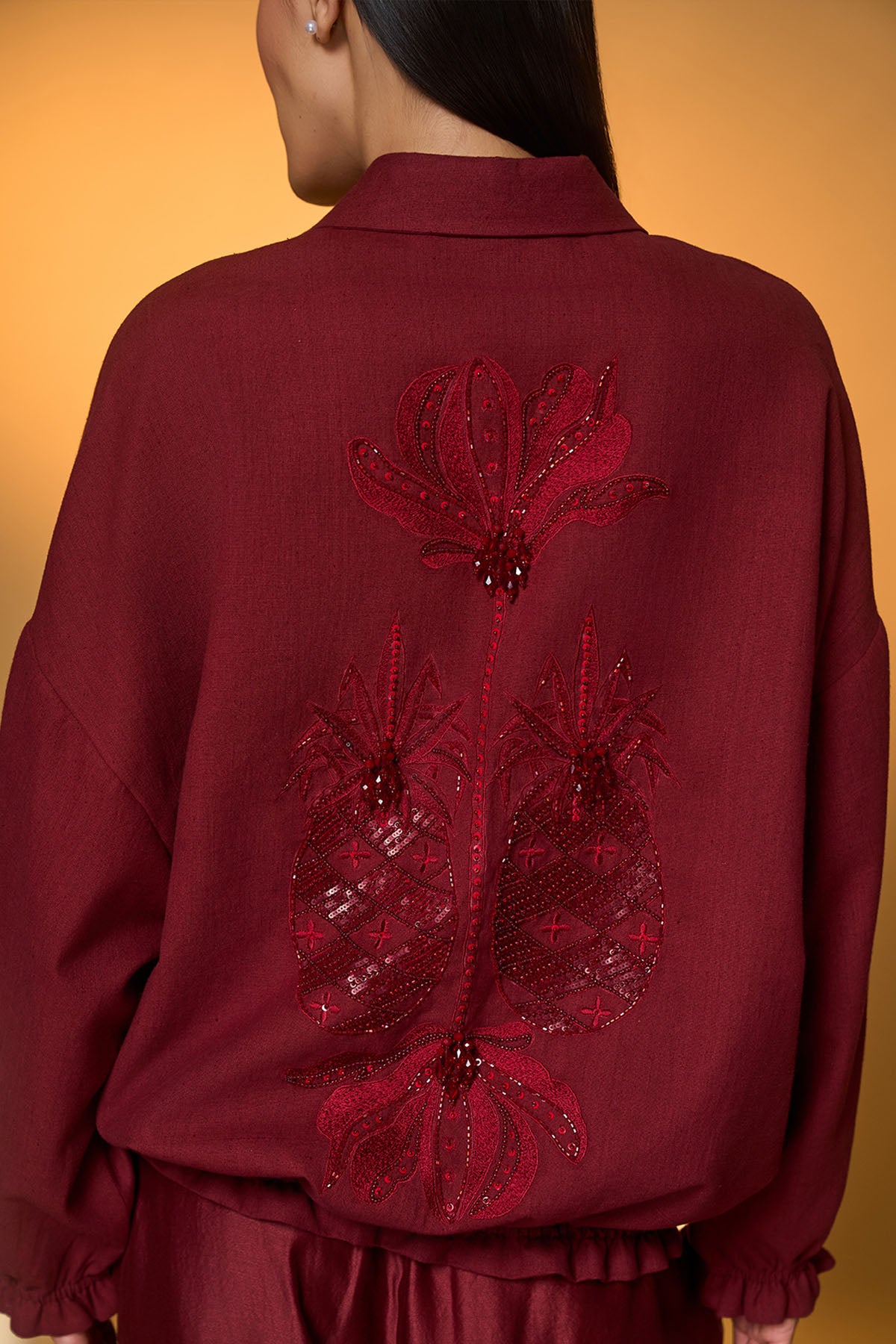 Jacket- relaxed | double-layered front |elasticated under-layer | centre-front zipper closure with tassel detail | 'pine-code' embroidered at the back, adorned with tonal crystal droplets | balloon sleeves. Â balloon pants- 'lunar lagoon' motif embroidered on front on either side | side seam zipper closure | elasticated hem