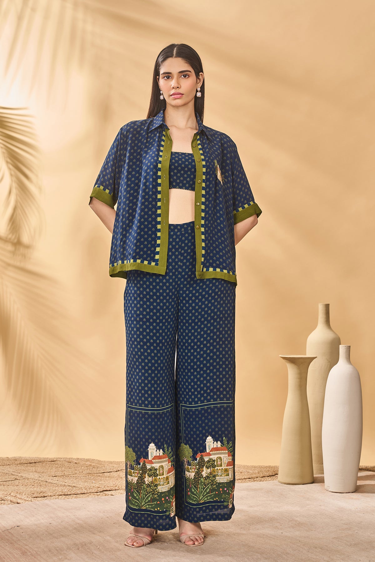 Shirt- relaxed denim shirt | one-piece collar | trellis palm patchwork on front | front button closure | fold-up cuff detail. Bustier- tube bustier with adjustable straps | embroidered body | centre back closure. Trousers- straight fit trousers | holiday home placement on both sides of the bifurcate | side pockets | side zipper closure