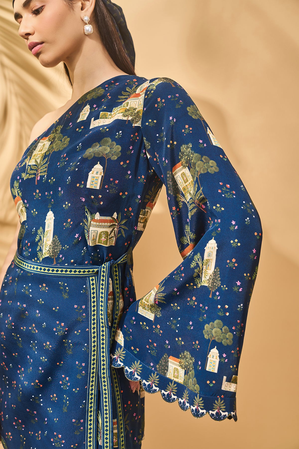 One shoulder mini wrap dress| wrap over tie-up with tassels attached | bell sleeve with scallop border detail |