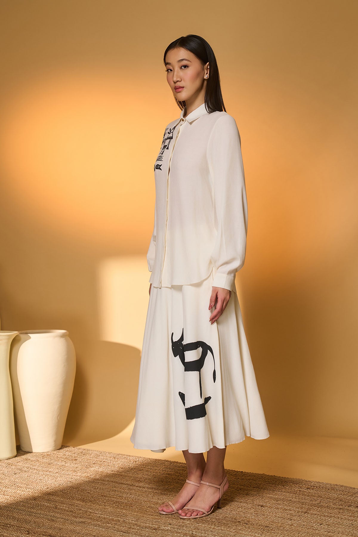 Shirt- one side batwing sleeves | front closure | turtle dream placement print on the right shoulder. Skirt- a circular swing skirt |placement screen printed "Moo meadow" | side zipper