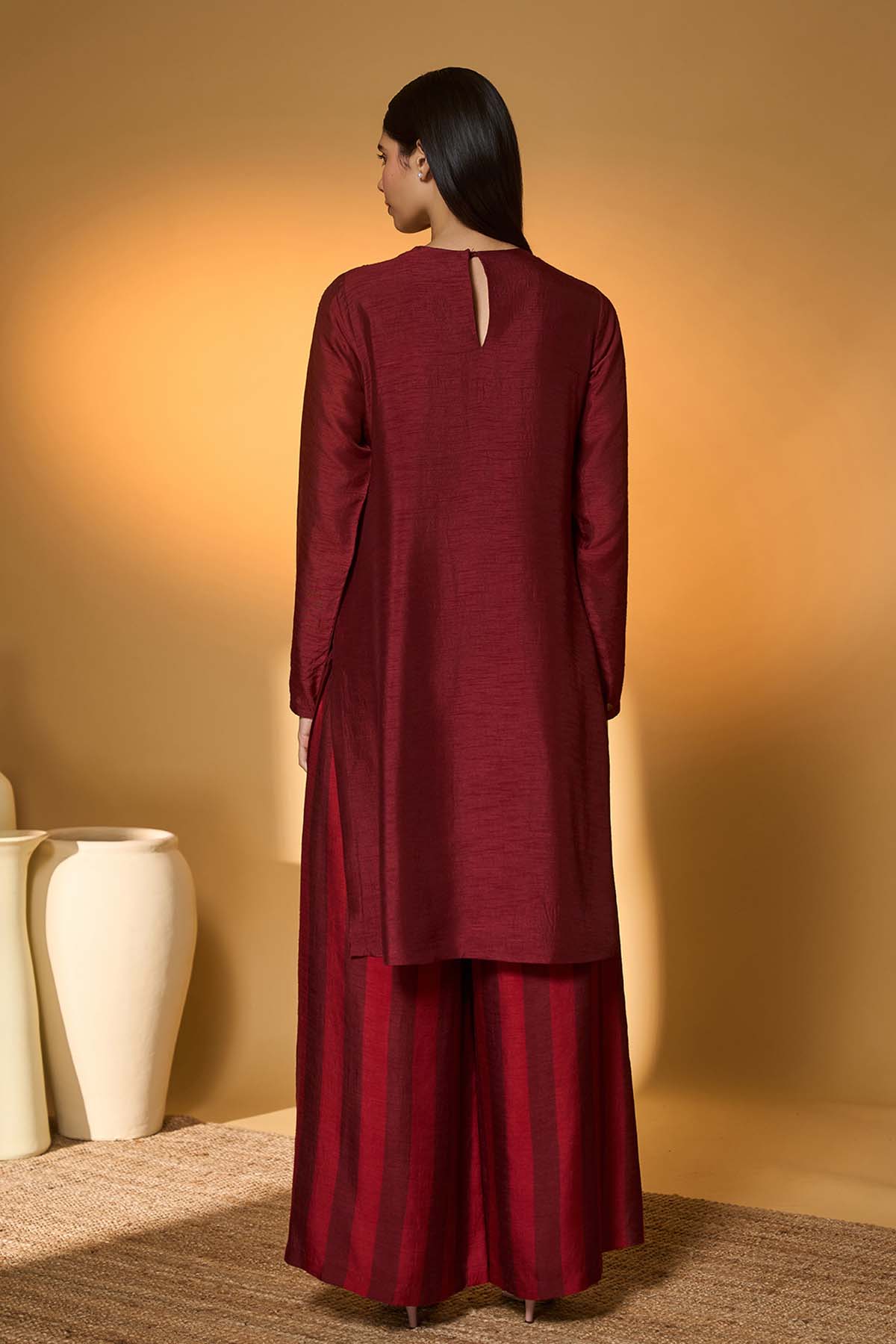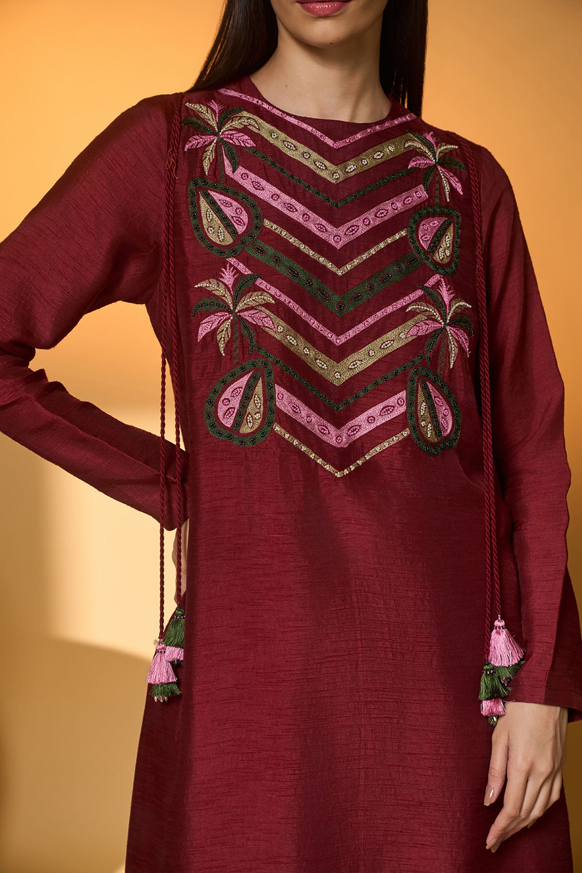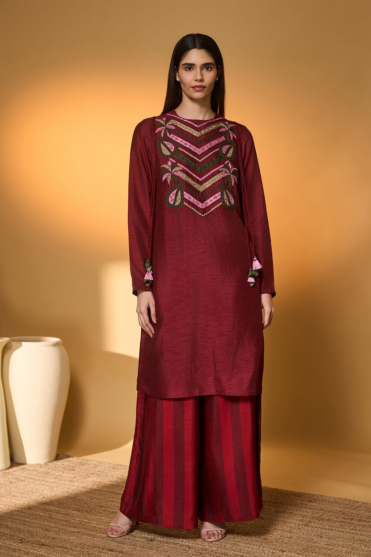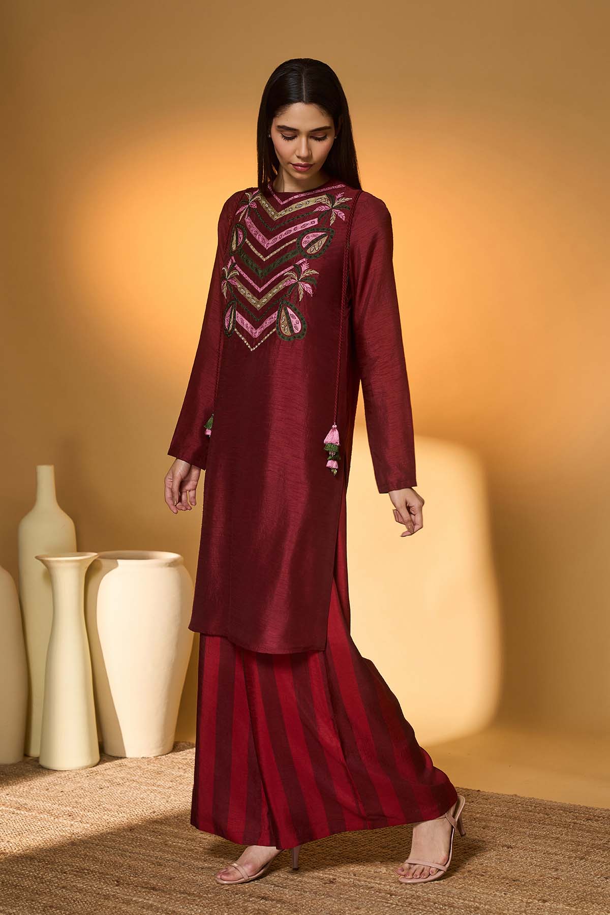 Kurta- round neck | 'pear of tropics' embroidery in contrast tones | flowy tassel accents in contrasting tones. Pants- straight pants | striped body | side seam zipper closure
