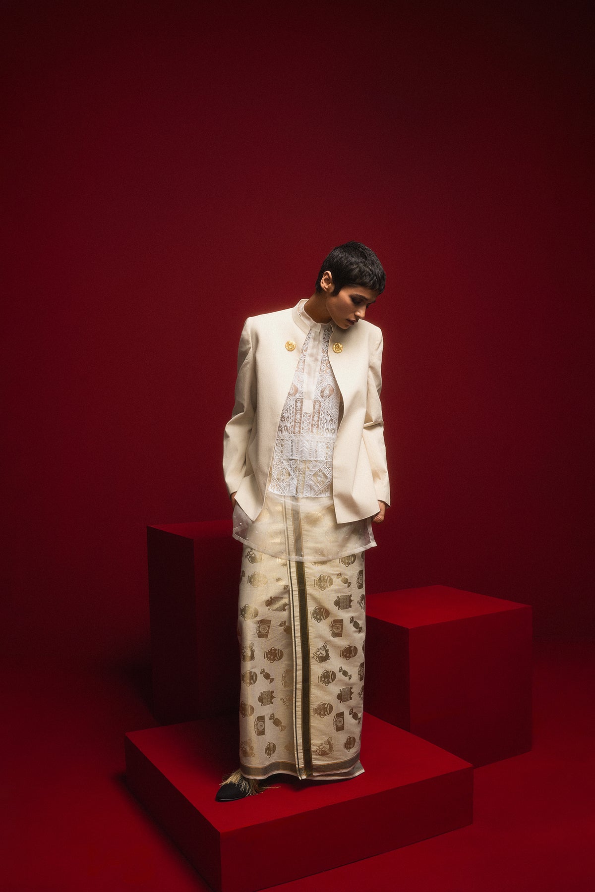 A kora structured bandi in handwoven cotton with an elegant placement of our fish in the pond charm on the front, this bandi is an elevated basic that can take your look from day to night. Consisting of over 50 hours of hand embroidery, this relaxed sheer kurta is made for the it-girls who love a good indian fit. With an extended yoke featuring embroidered motifs of our beloved mascots and paired with a buttery soft lungi, draped as desired- this ensemble is truly one for keeps. Since the inception, house of masaba has created a treasure chest of motifs that have found a way into your hearts and closets, kinda kooture is a celebration of these mascots that has made the brand what it is.Ā
