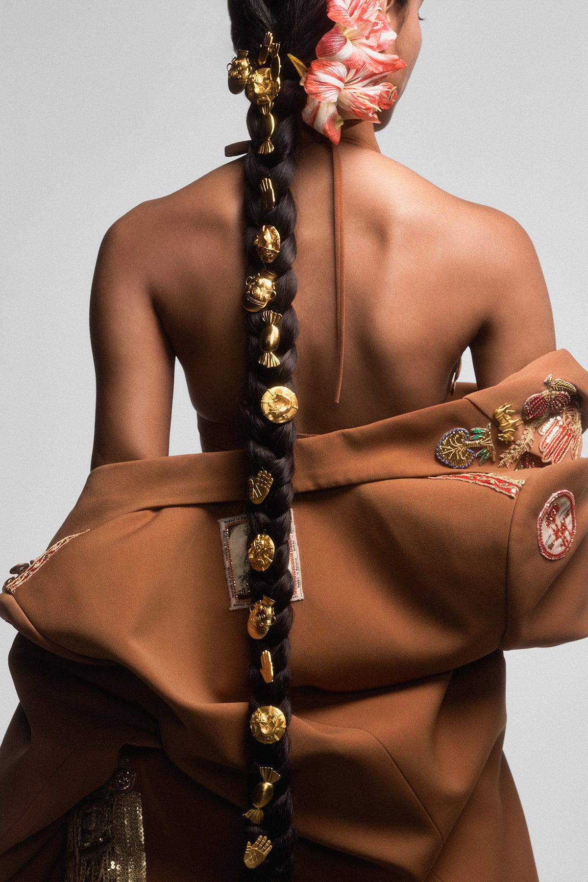 Using multiple traditional laces in a patchwork method, thrifted meenakari-esque buttons, earring backs and hand embroidered badges and stamps- the jaipur jacket is one of a kind. Over 60 small pieces all hand sewn onto a slouchy menswear inspired blazer, every small detail in this garment has a story to tell. Every piece is hand crafted and thus, unique and special in its own whimsical way. A slouchy style low waist trouser with a toffee gilded waistband and hook closure. This trouser is an elevated staple to have in your wardrobe and is versatile to style in multiple way. Since the inception, house of masaba has created a treasure chest of motifs that have found a way into your hearts and closets, kinda kooture is a celebration of these mascots that has made the brand what it is.