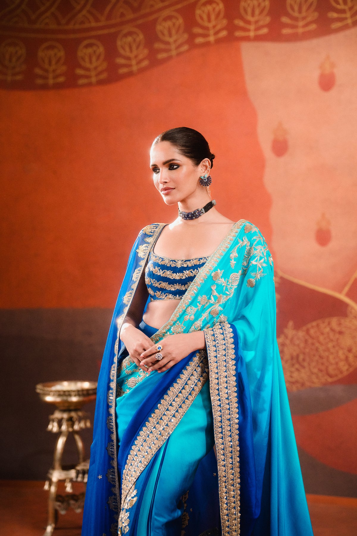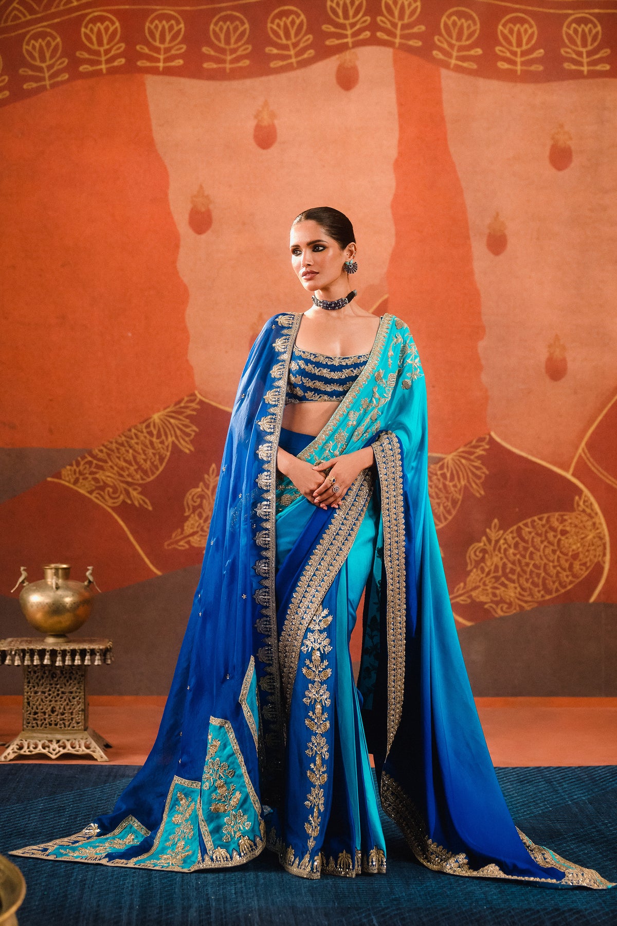 A poetic drape in vivid blue, the sanjh saree encapsulates the eccentric aesthetic of the brand in all its zany ways. This ornate ombre saree in hues of the sky has an intricate border on all sides accentuated with an anar jaal. With color block pleats and and a hero motif adding to its beauty, this saree is for the woman who finds her spot at every occasion. The dupatta has patchwork detailing with ornate embroidery.